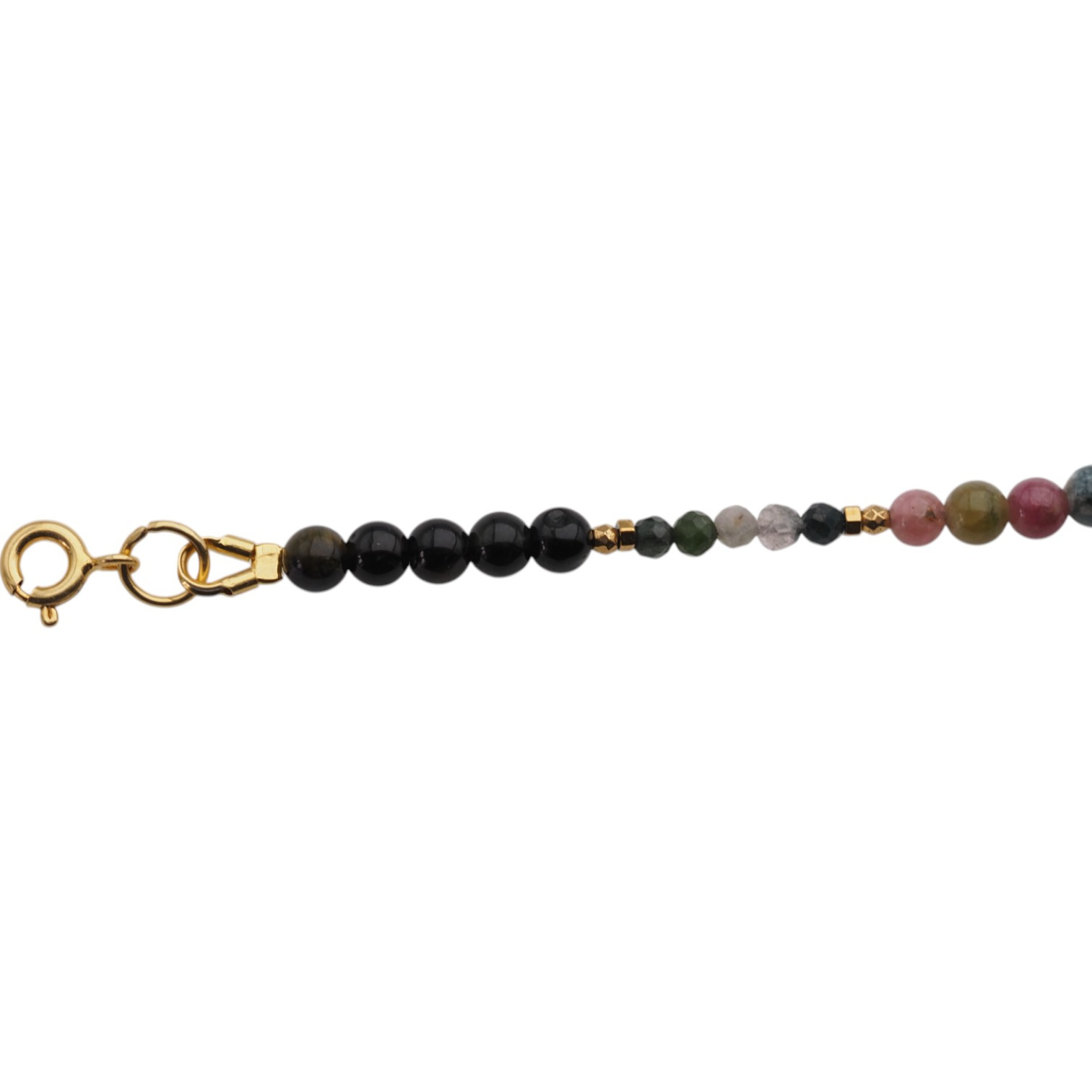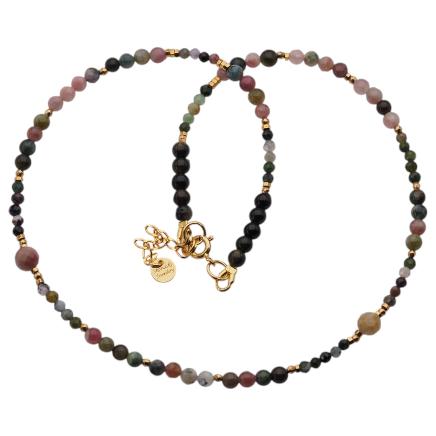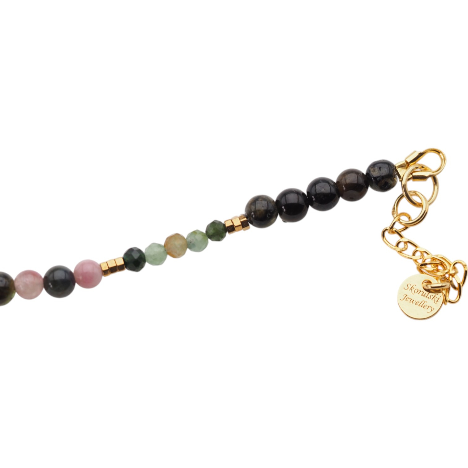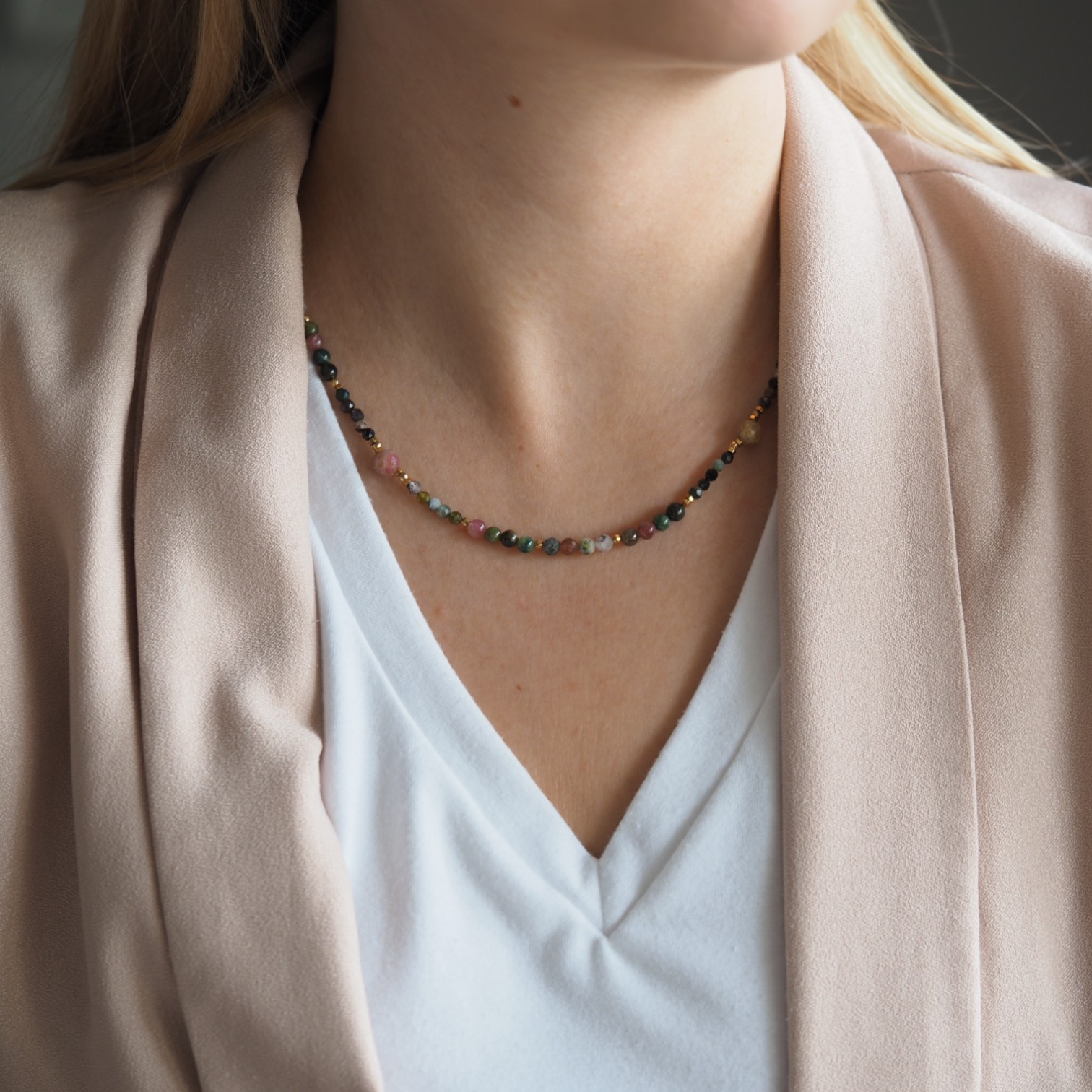 Ręcznie wykonany naszyjnik z naturalnego kolorowego Turmalinu, osadzonego na lince stalowej. Składa się z fasetowanych kulek w różnych odcieniach – od różu i zieleni po czerń. Elementy wykończeniowe wykonane zostały z pozłacanego srebra próby 925. Biżuteria łączy w sobie lekkość, energię kolorów i symbolikę ochronną. Idealny wybór dla osób ceniących delikatne, ale znaczące dodatki.