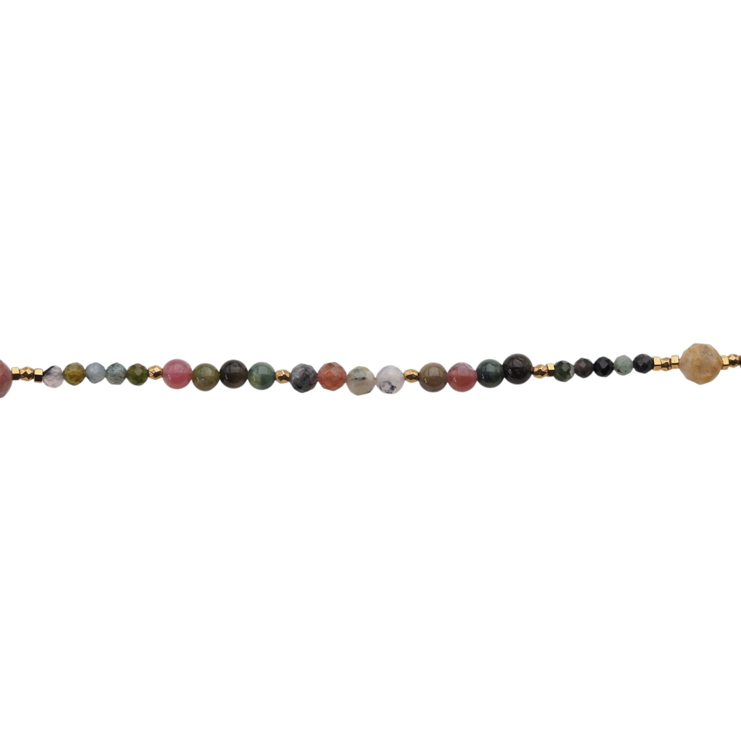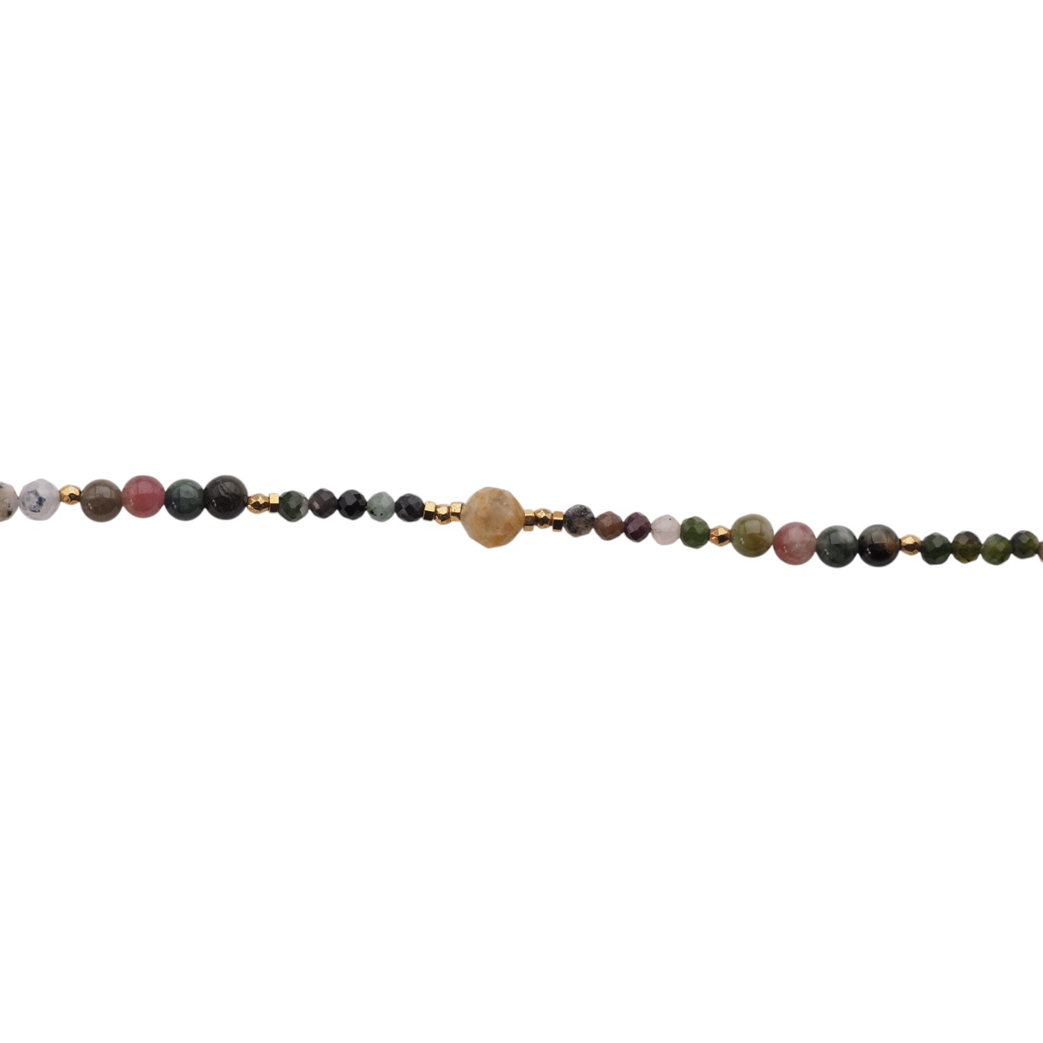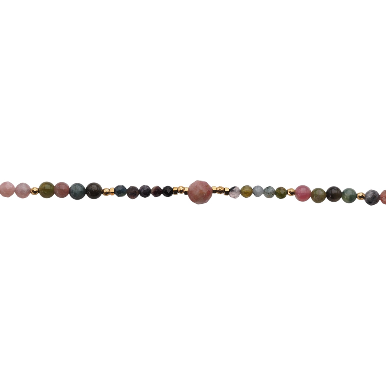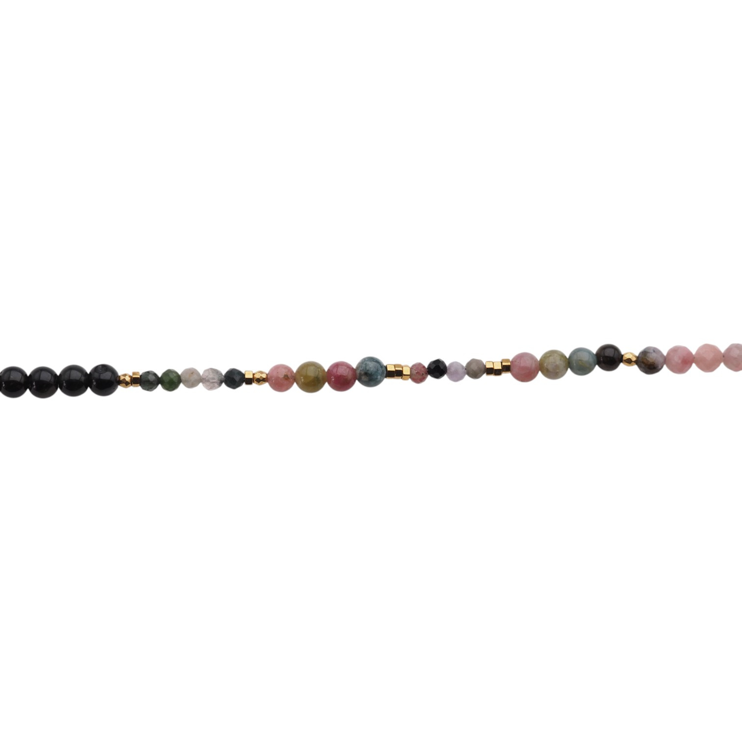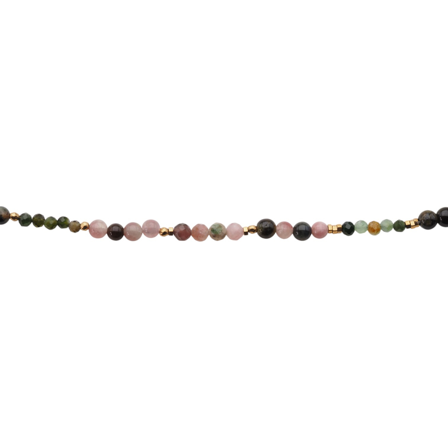 Ręcznie wykonany naszyjnik z naturalnego kolorowego Turmalinu, osadzonego na lince stalowej. Składa się z fasetowanych kulek w różnych odcieniach – od różu i zieleni po czerń. Elementy wykończeniowe wykonane zostały z pozłacanego srebra próby 925. Biżuteria łączy w sobie lekkość, energię kolorów i symbolikę ochronną. Idealny wybór dla osób ceniących delikatne, ale znaczące dodatki.