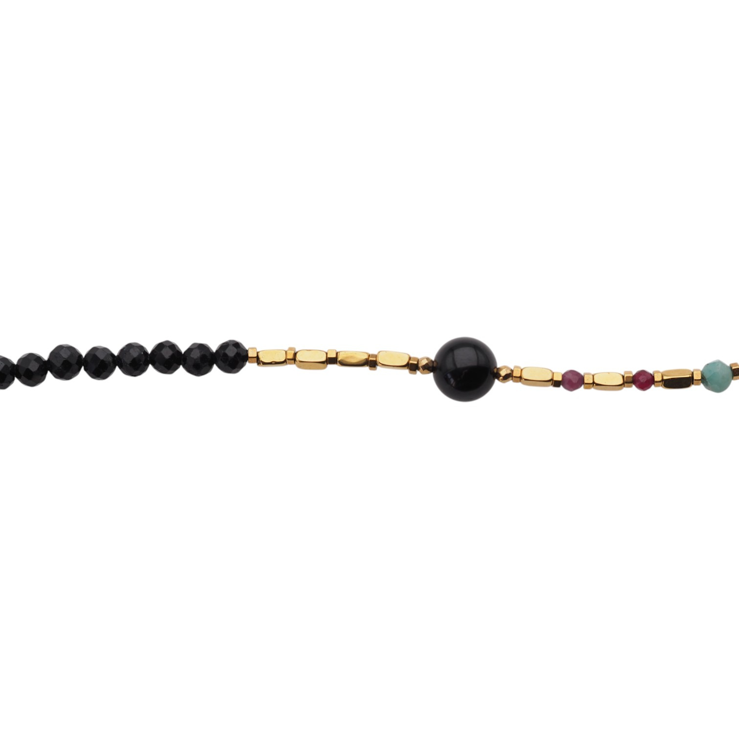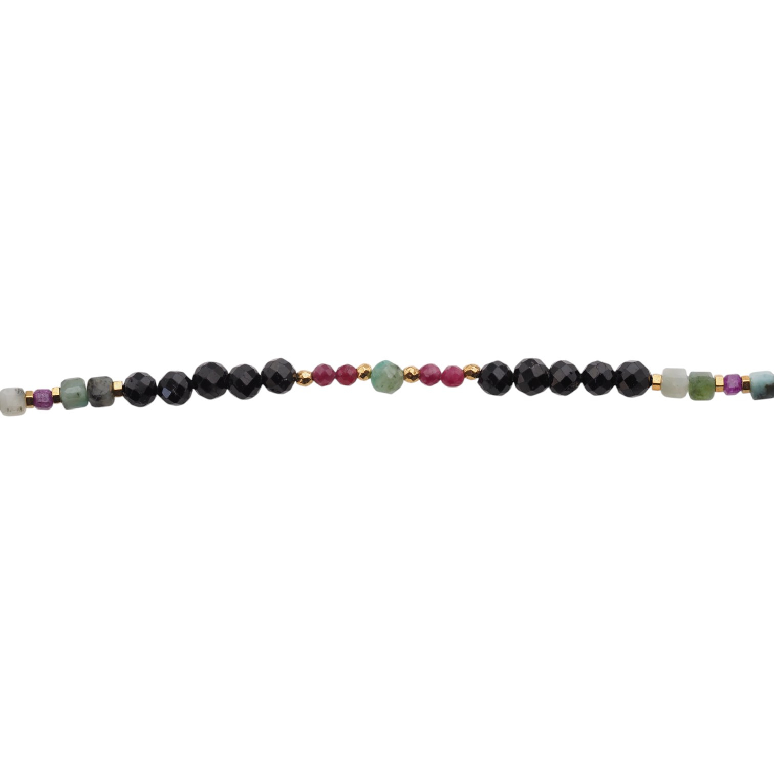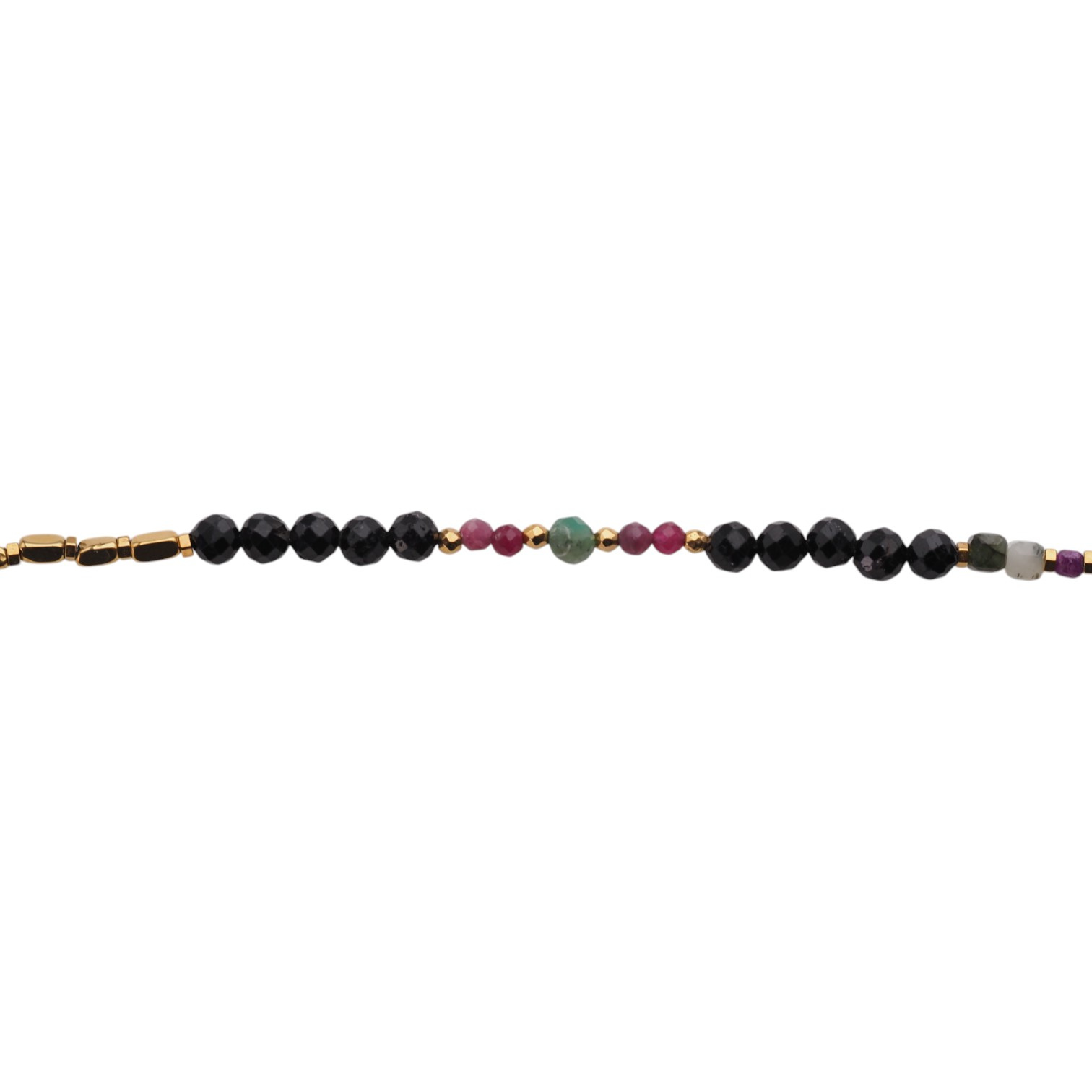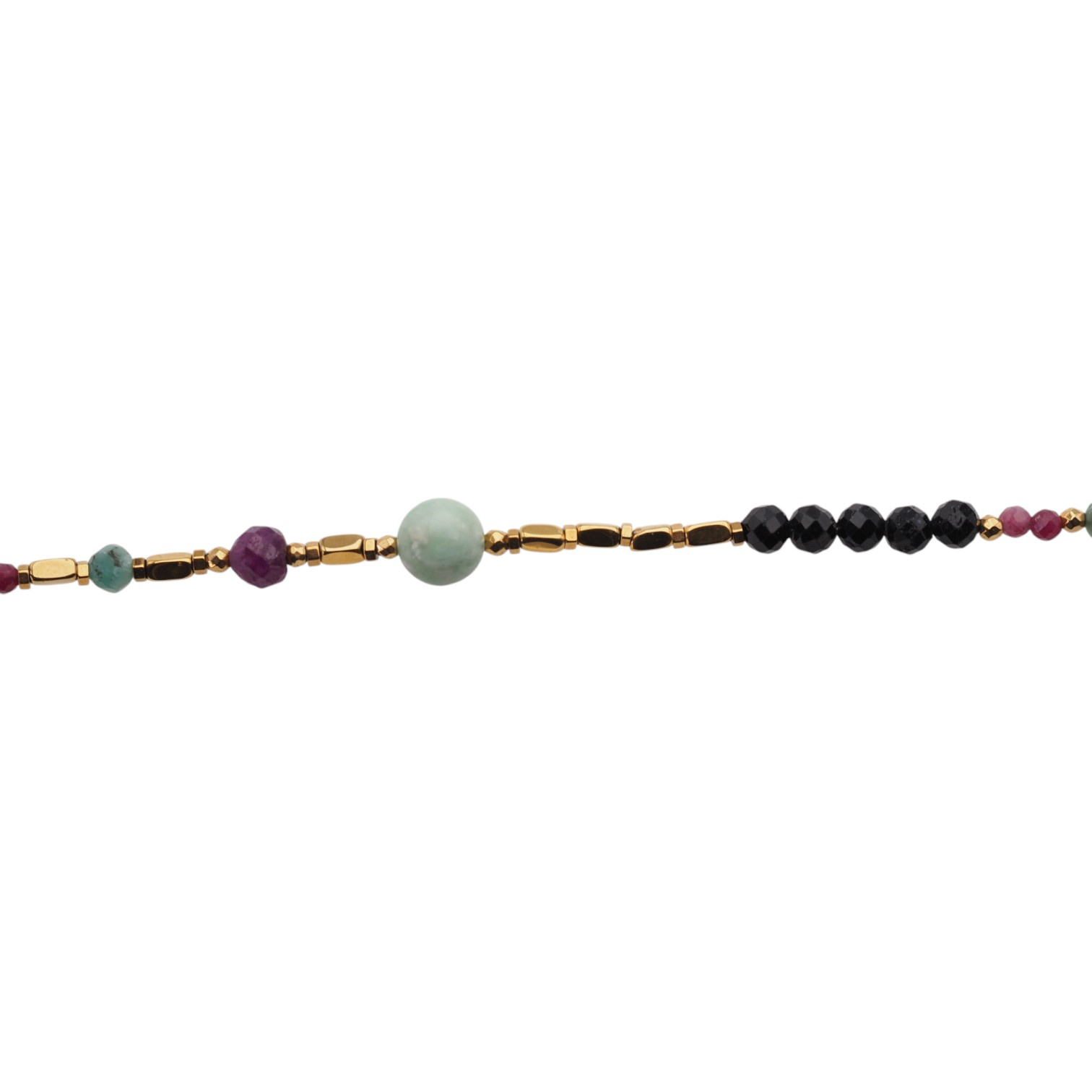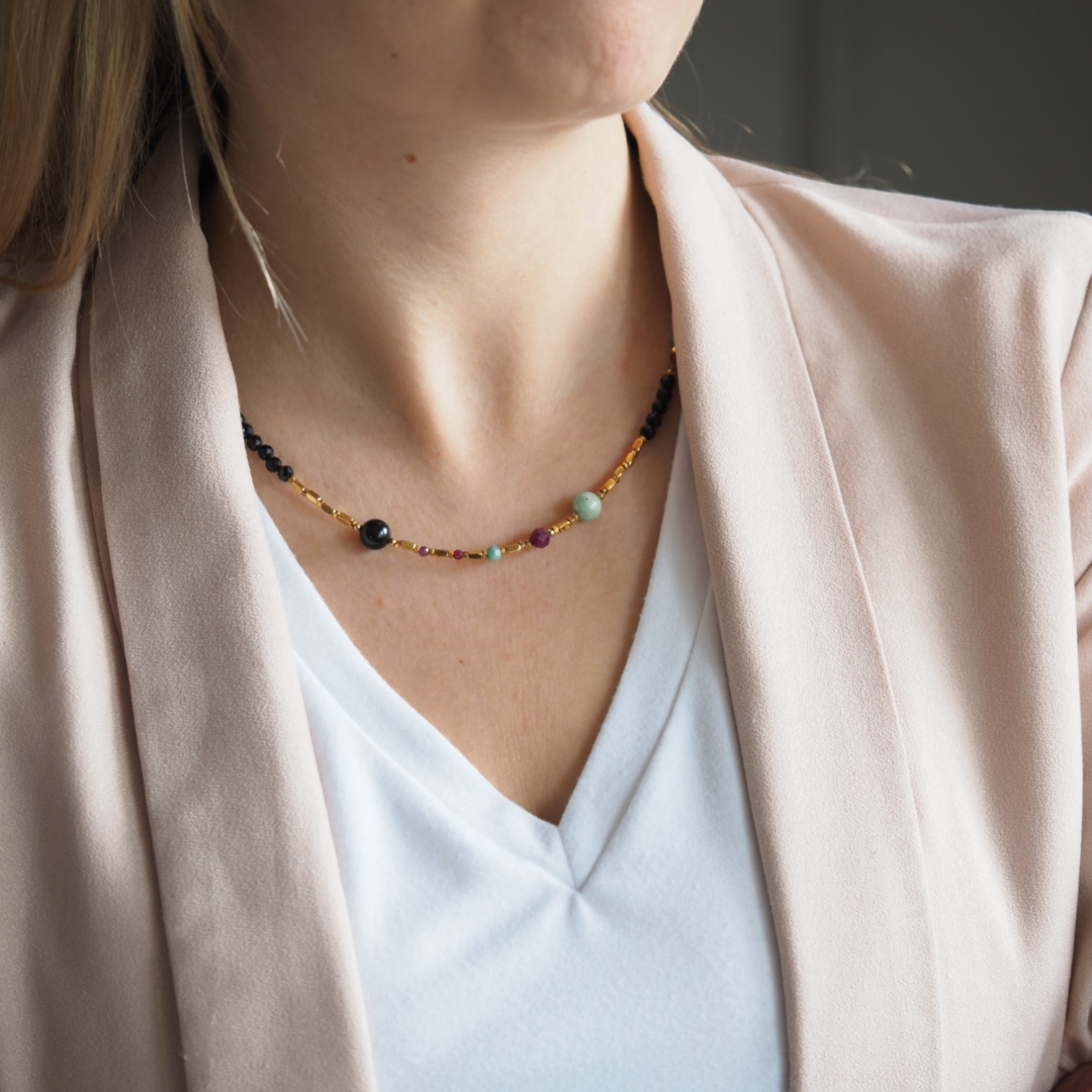 Ręcznie wykonany naszyjnik z naturalnych kamieni szlachetnych – szmaragdu, rubinu, czarnego turmalinu oraz złotego hematytu – osadzonych na lince stalowej. Kamienie w różnych kształtach (kostki i kulki) nadają kompozycji niepowtarzalnego charakteru. Całość dopełniają elementy ze srebra próby 925 pozłacane 24-karatowym złotem oraz klasyczne zapięcie typu federing.