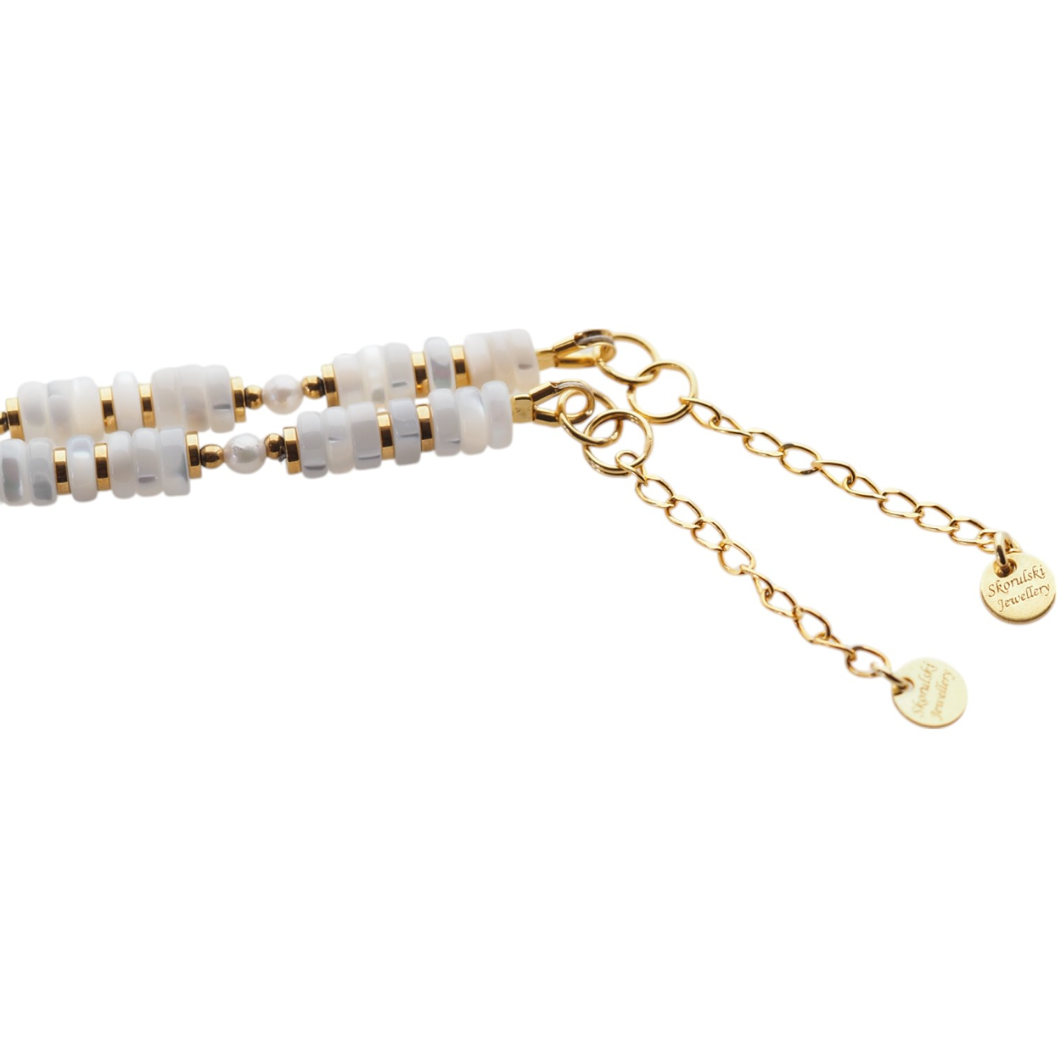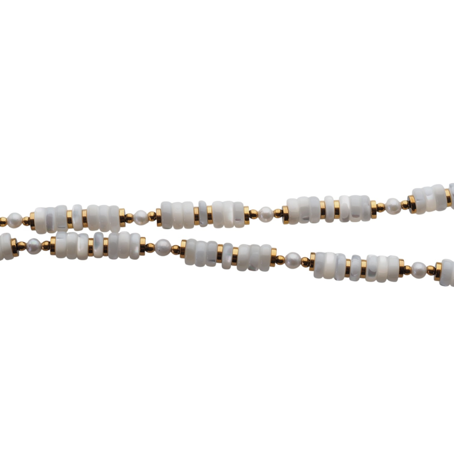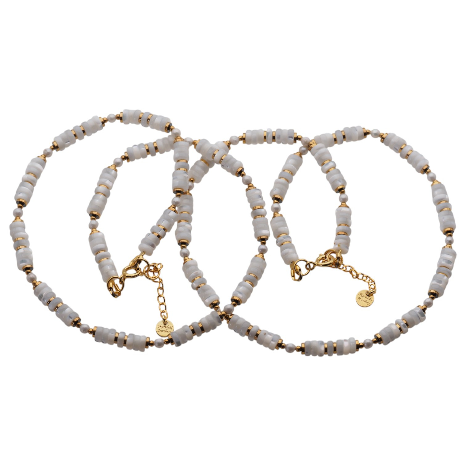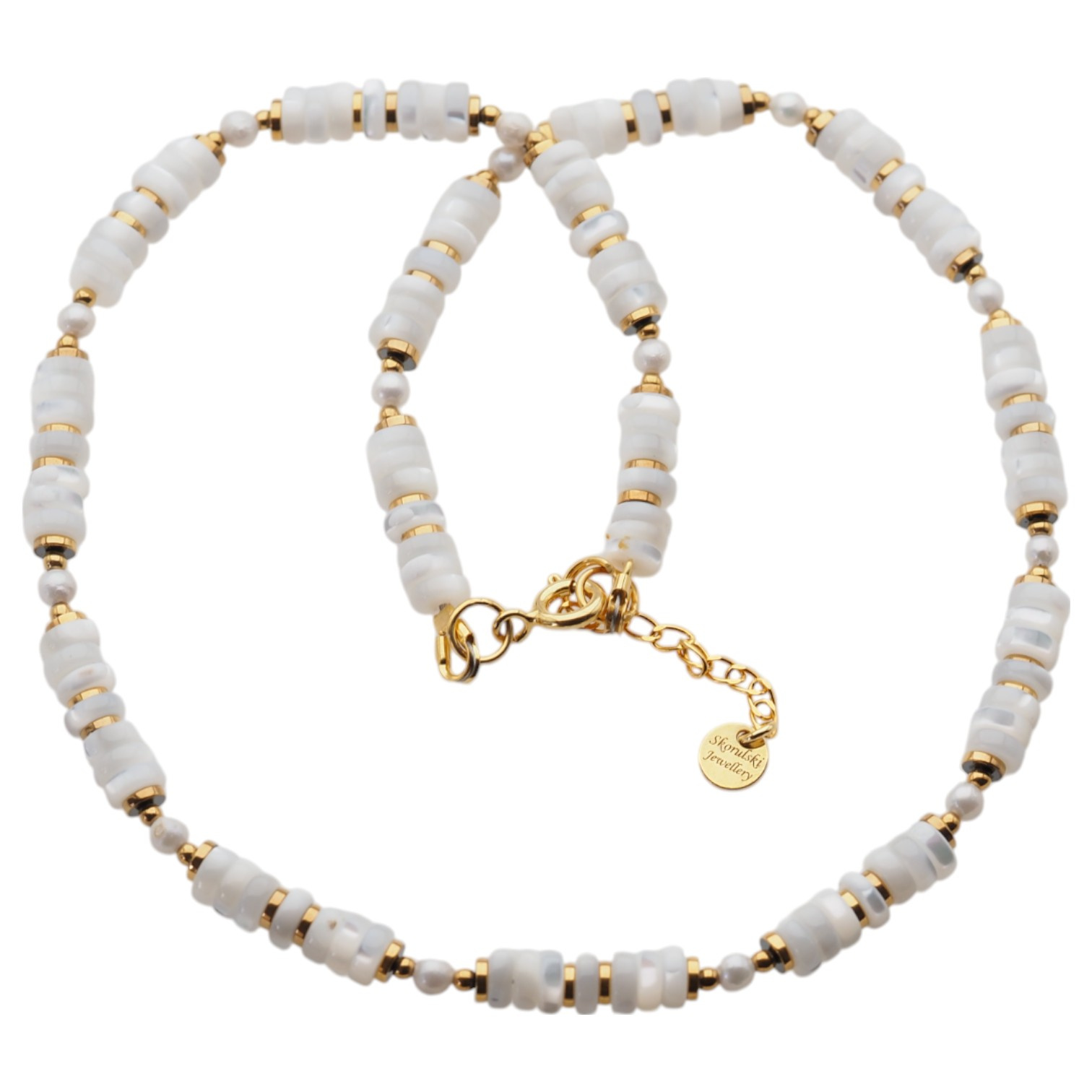 Naszyjnik - muszla biała, hematyt złoty i srebro złocone