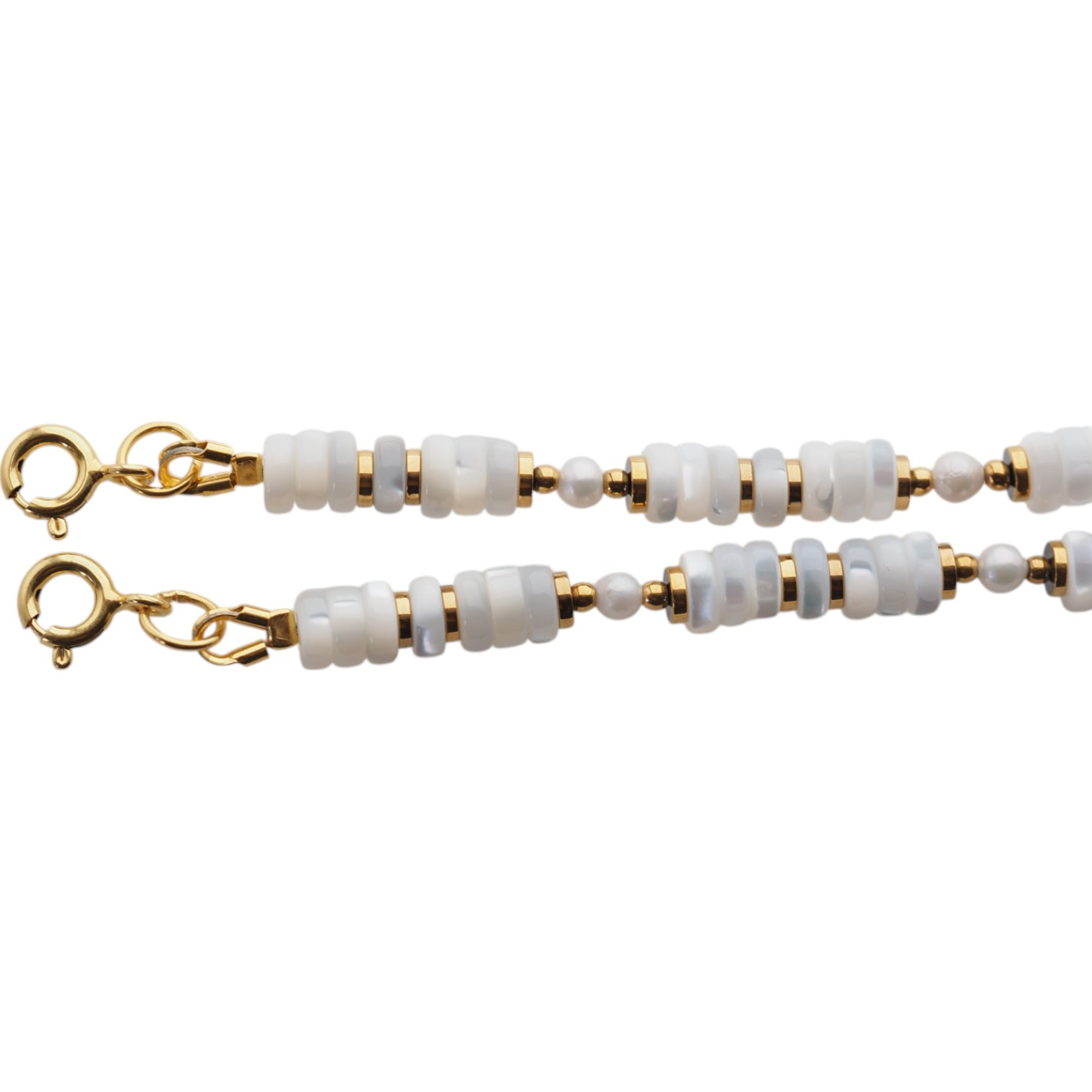 Muszla biała, Perła biała, złoty hematyt.