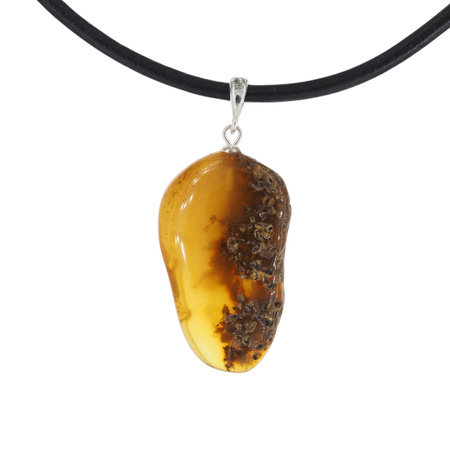 Ciepły, miodowo-koniakowy odcień bursztynu pięknie kontrastuje z czarnym naturalnym rzemieniem, tworząc kompozycję o rustykalnym, a jednocześnie nowoczesnym charakterze. Całość dopełniają elementy ze srebra próby 925, które nadają biżuterii trwałość i elegancki akcent.