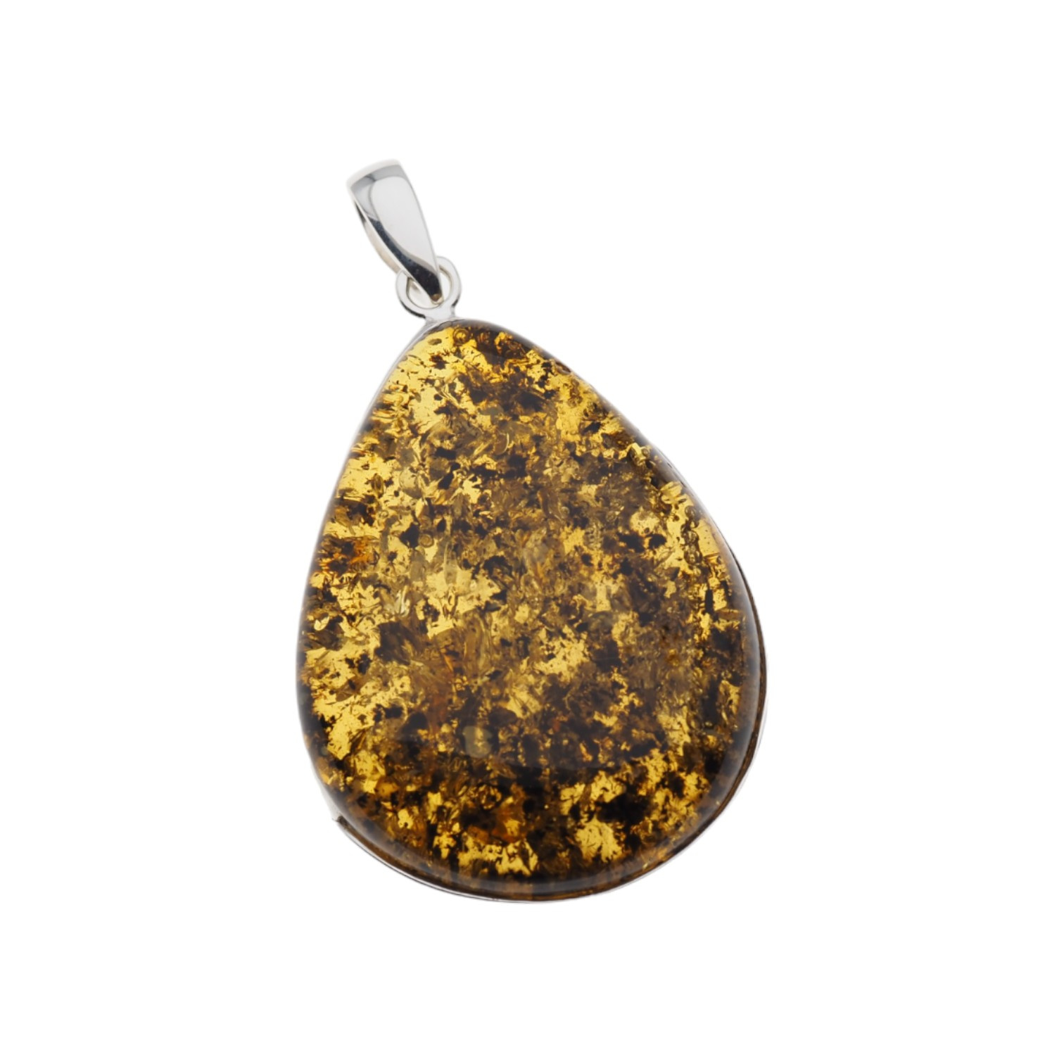 Naturalny Bursztyn w zielonkawym kolorze z wewnętrznymi łuskami, kształt łza.