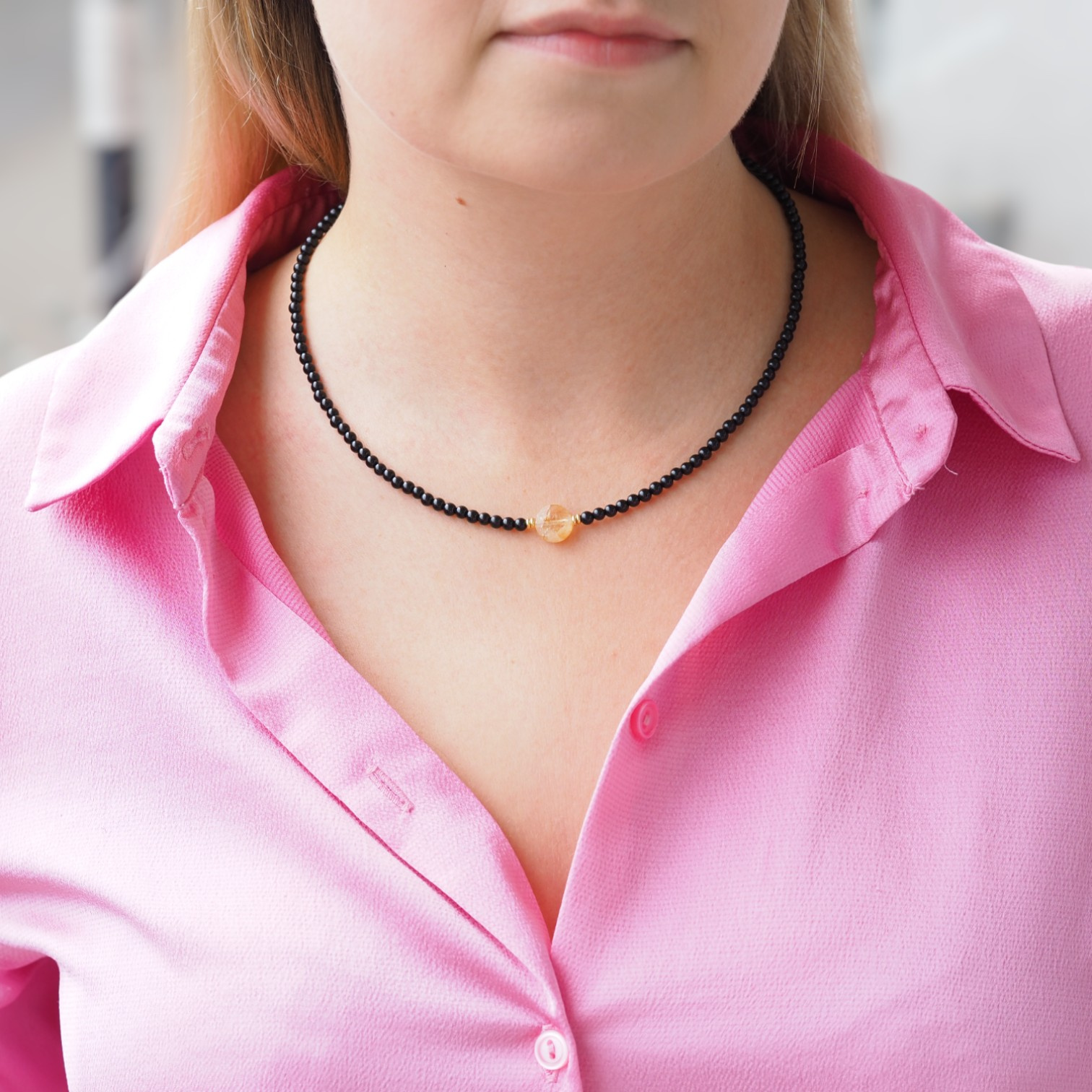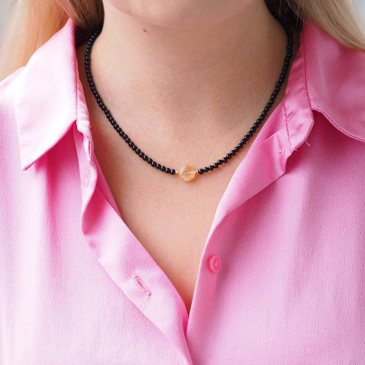 Naszyjnik obfitości i ochrony - Cytryn, Turmalin czarny, koniczynka i srebro złocone
