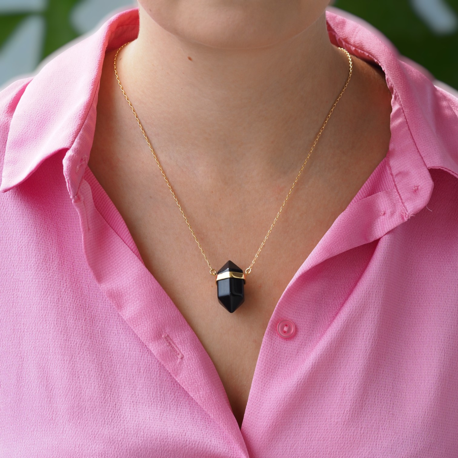 Naszyjnik z naturalnym onyksem w formie sopla. Kamień oprawiony w pozłacane srebro próby 925 i zawieszony na eleganckim łańcuszku tej samej próby. Ciemna głębia onyksu kontrastuje ze złotym wykończeniem, tworząc biżuterię o wyrazistym, ale klasycznym charakterze.