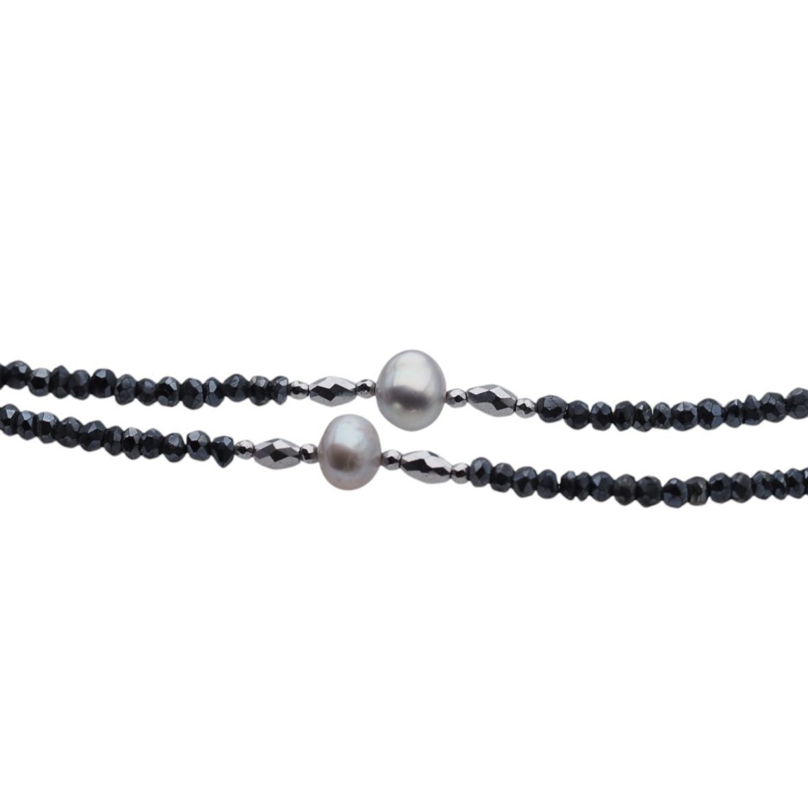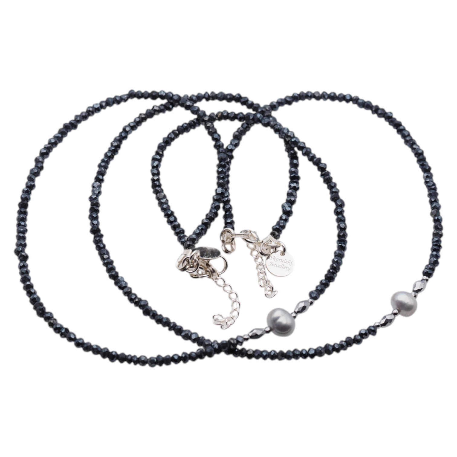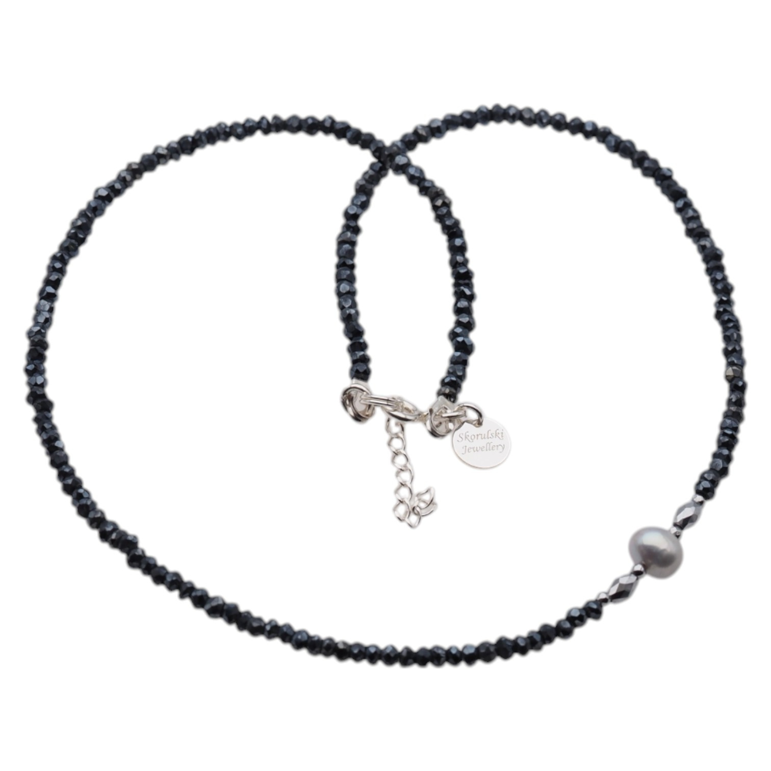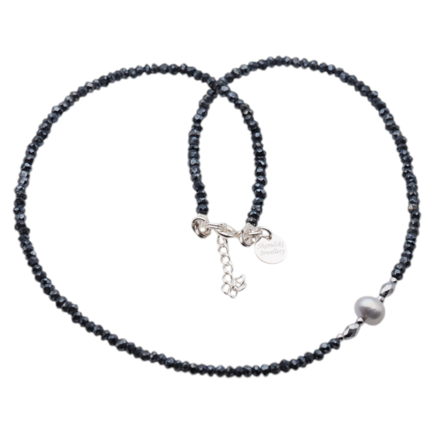 Naszyjnik - szara Perla, Spinel pokryty Tytanem, srebrny Hematyt i srebro - został wykonany ręcznie na lince stalowej.