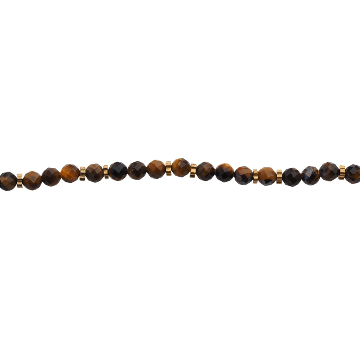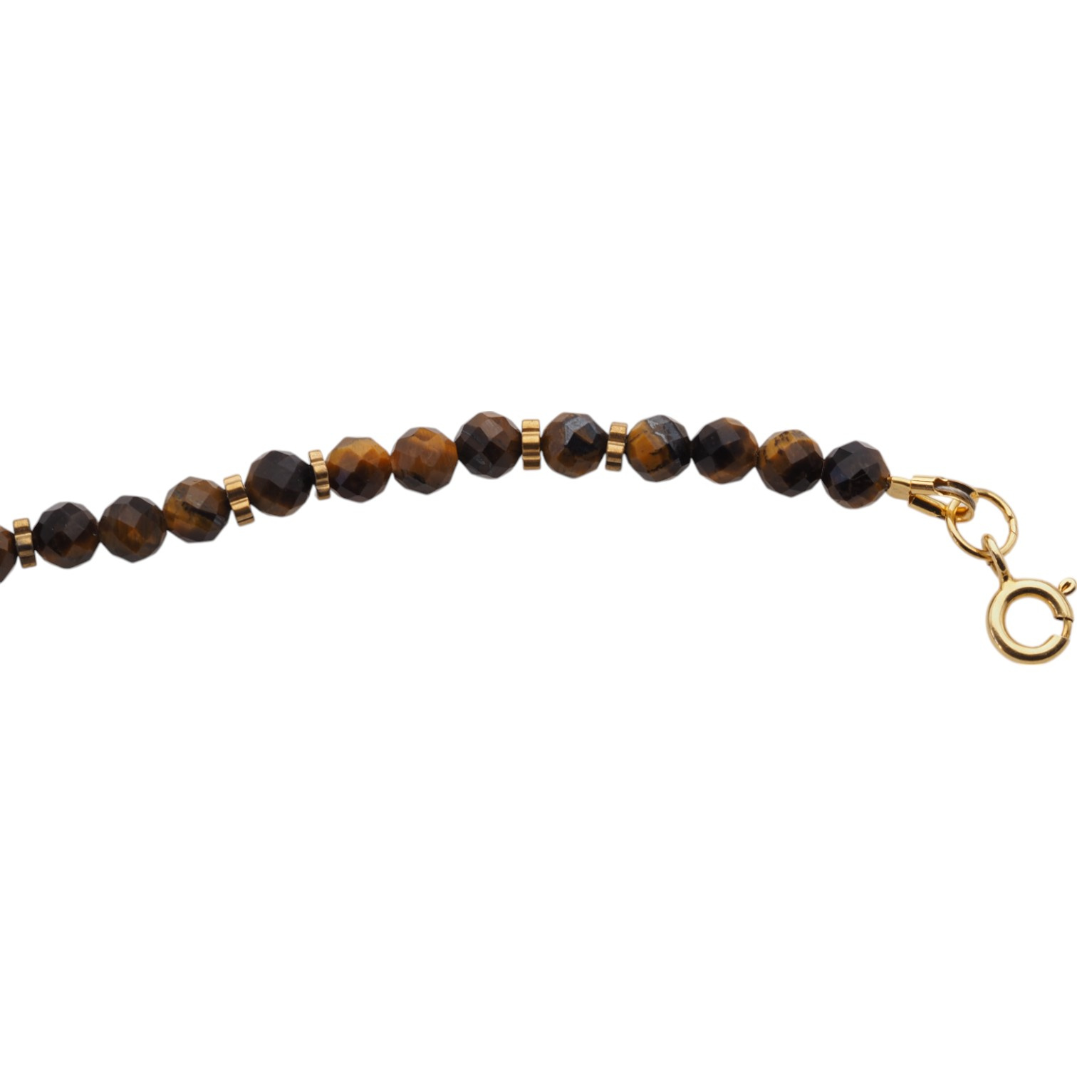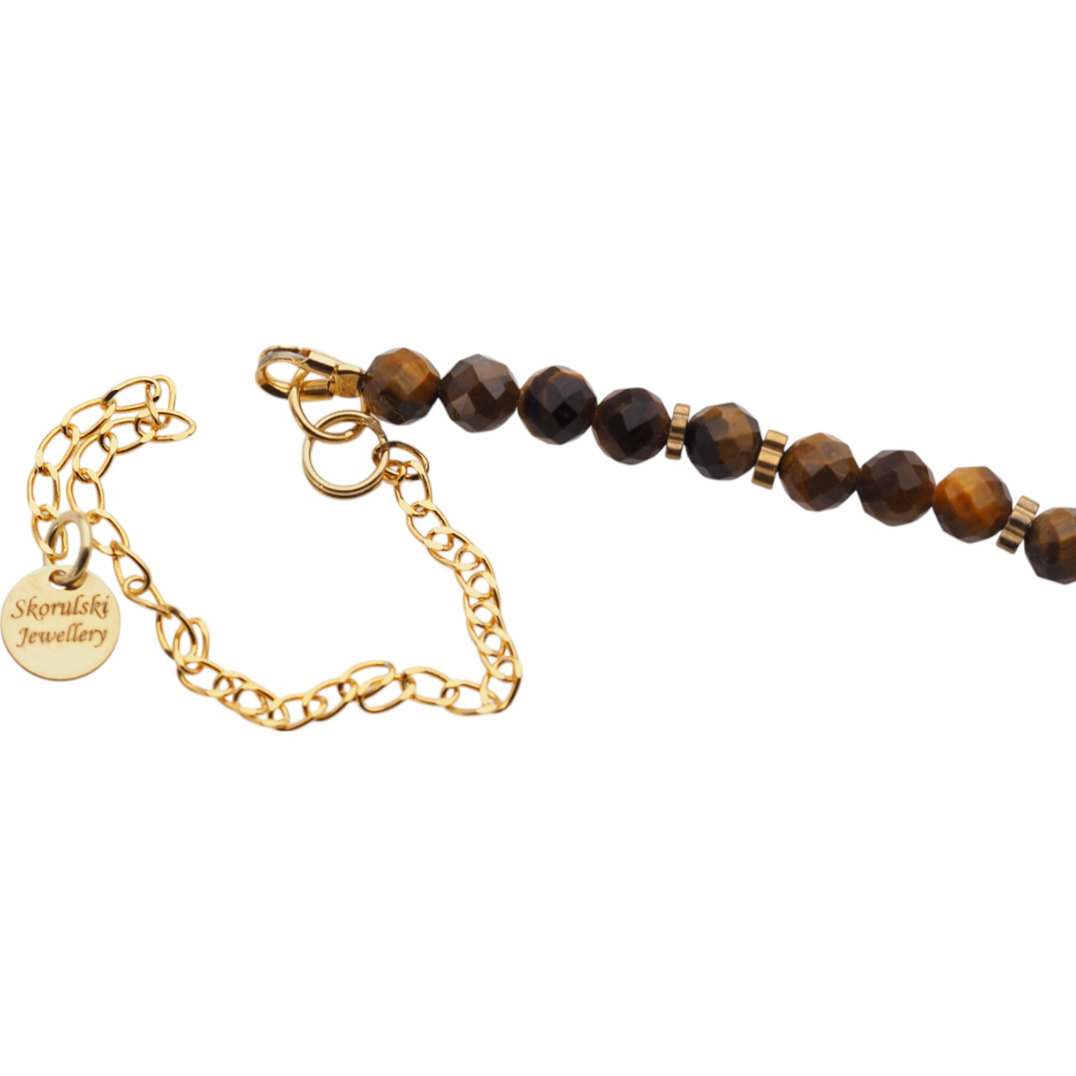 Naszyjnik wykonany ręcznie z naturalnych kamieni Tygrysiego Oka w formie fasetowanych kulek. Kompozycja oparta na stalowej lince z dodatkiem pozłacanego srebra próby 925. Całość wykończona zapięciem typu federing i regulacją długości.