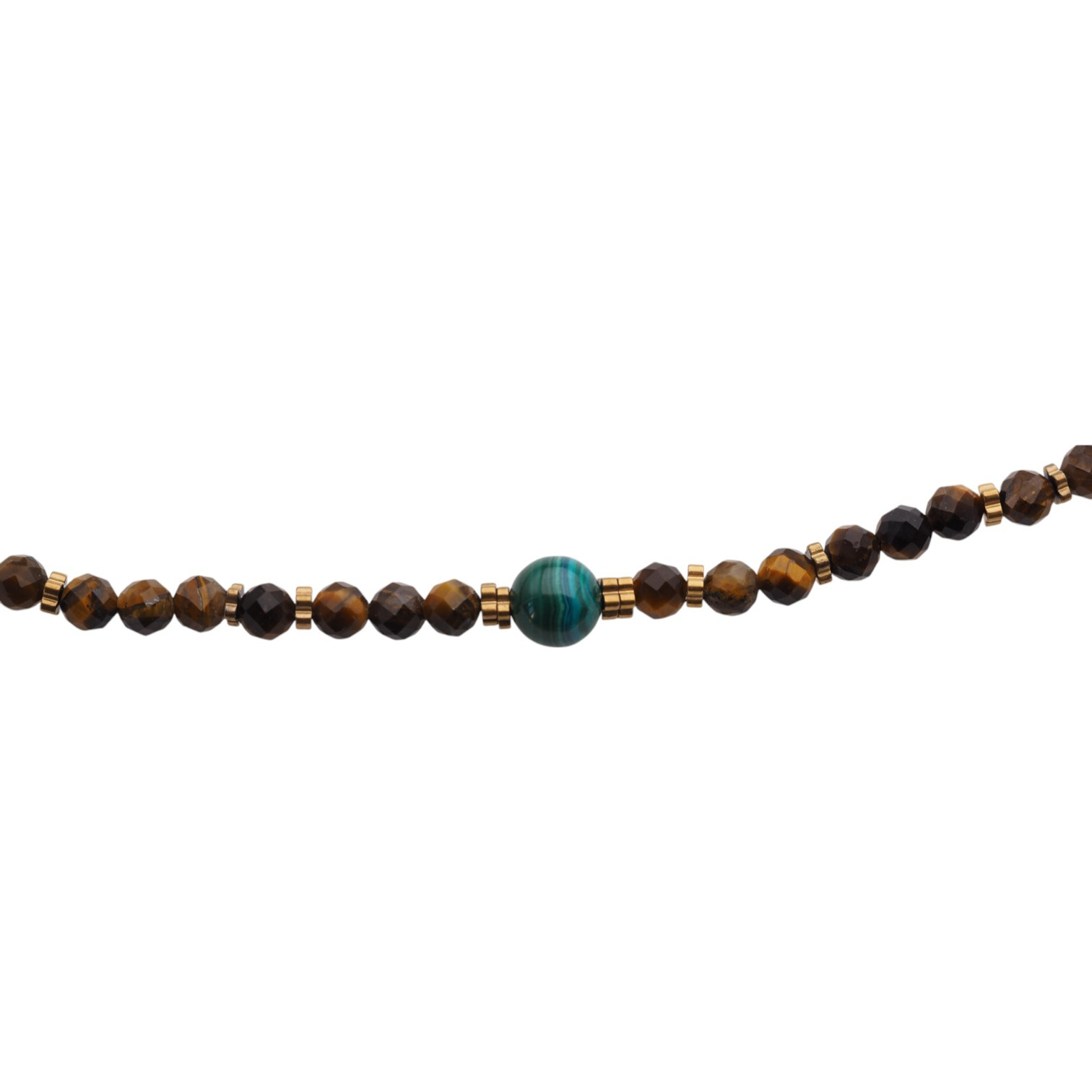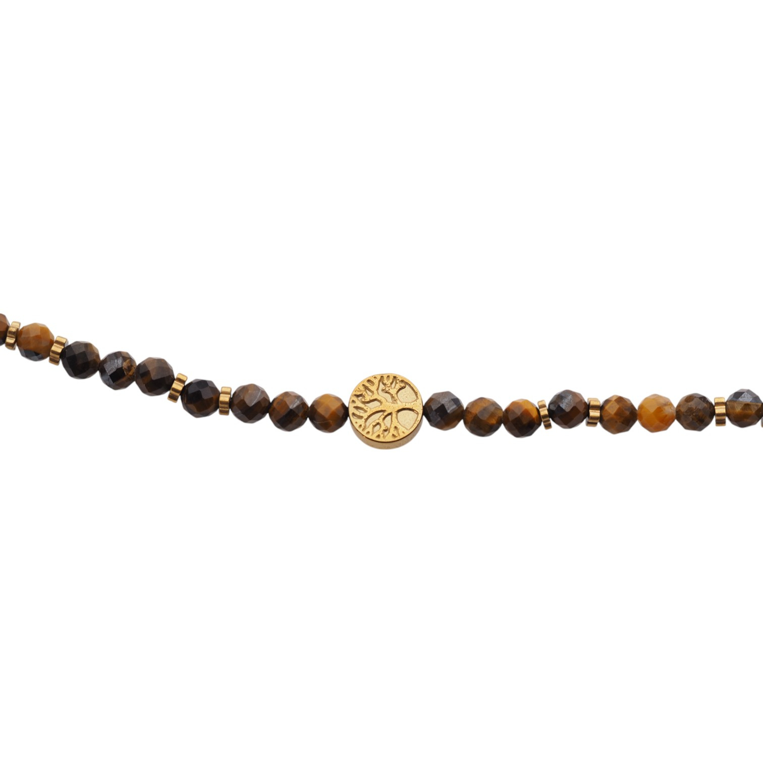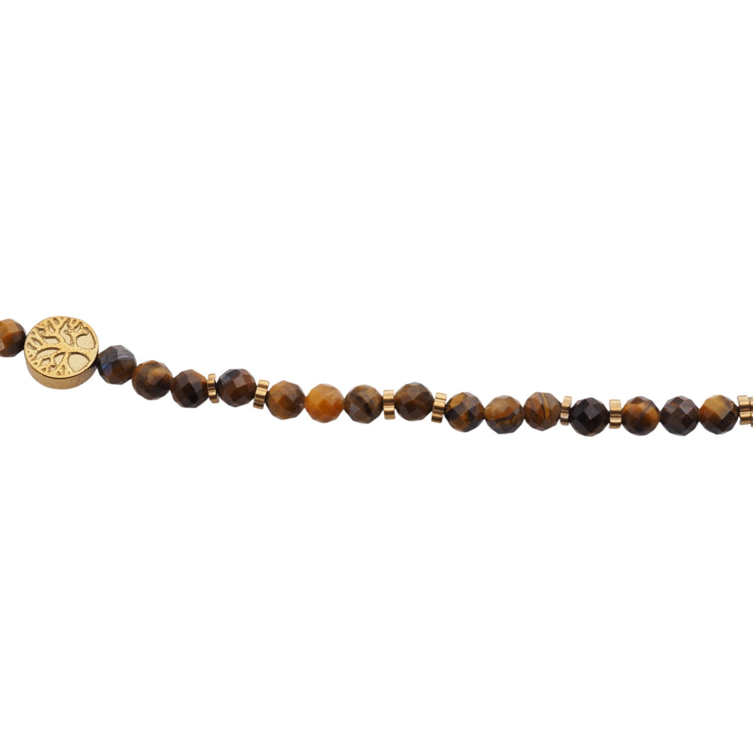 Naszyjnik wykonany ręcznie z naturalnych kamieni Tygrysiego Oka w formie fasetowanych kulek. Kompozycja oparta na stalowej lince z dodatkiem pozłacanego srebra próby 925. Całość wykończona zapięciem typu federing i regulacją długości.