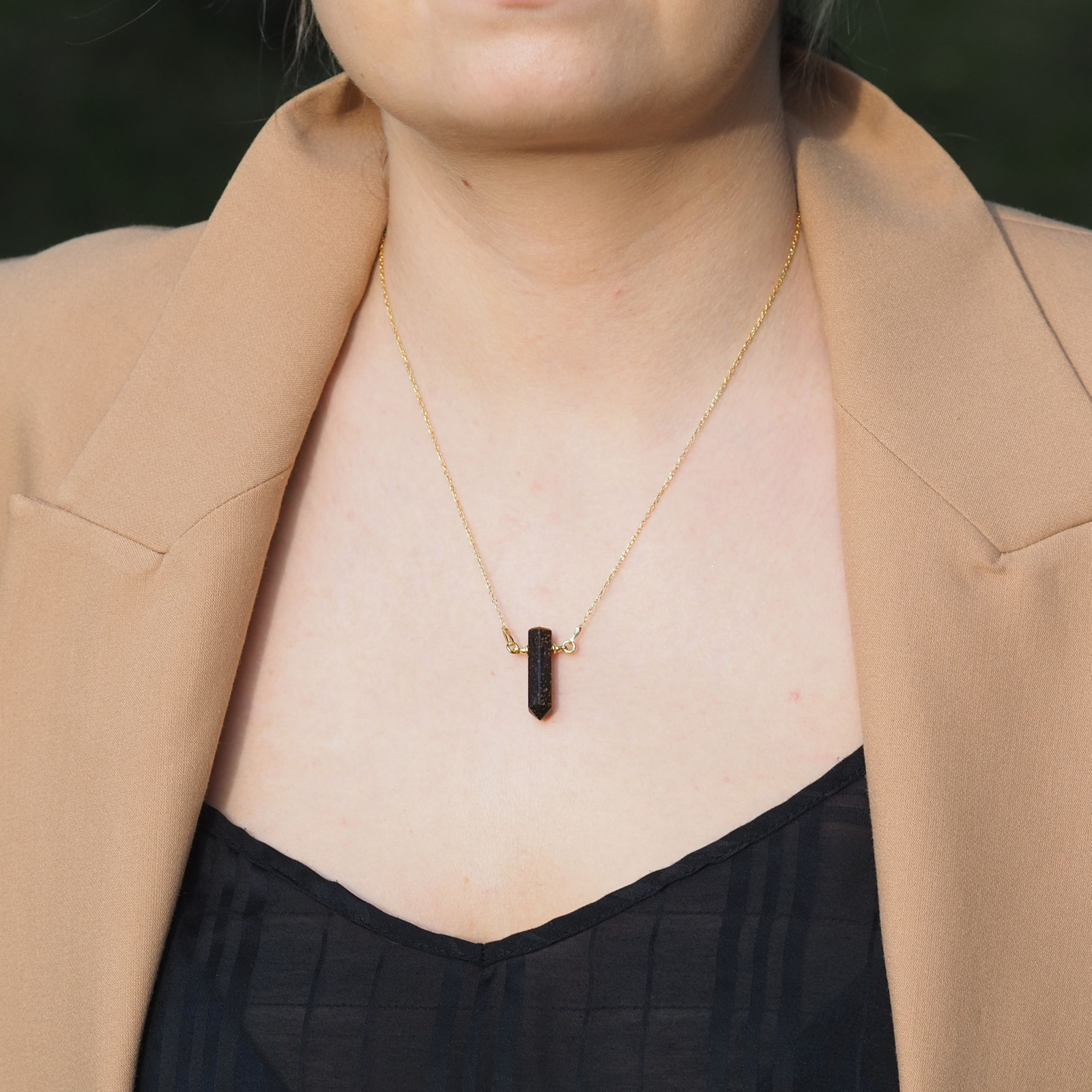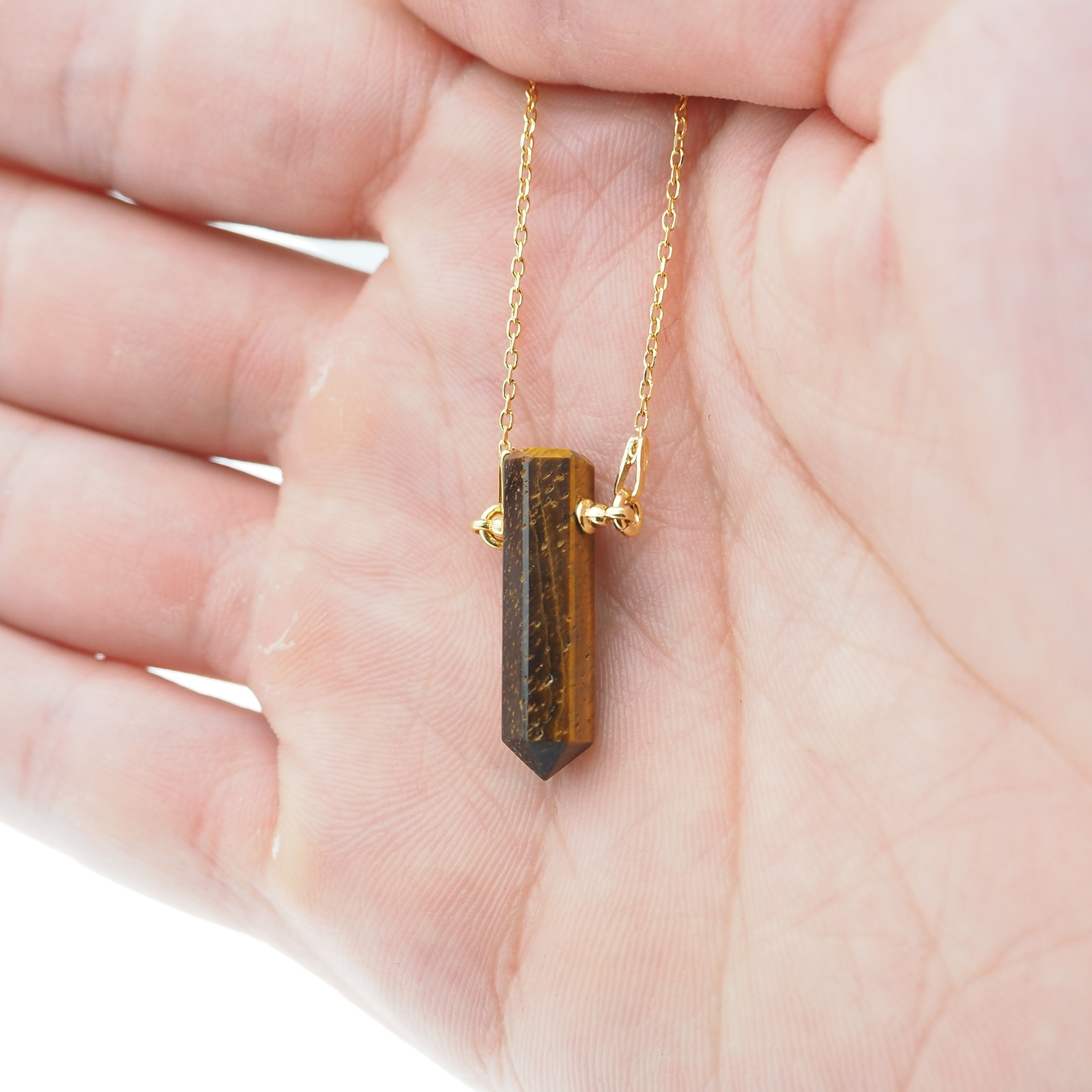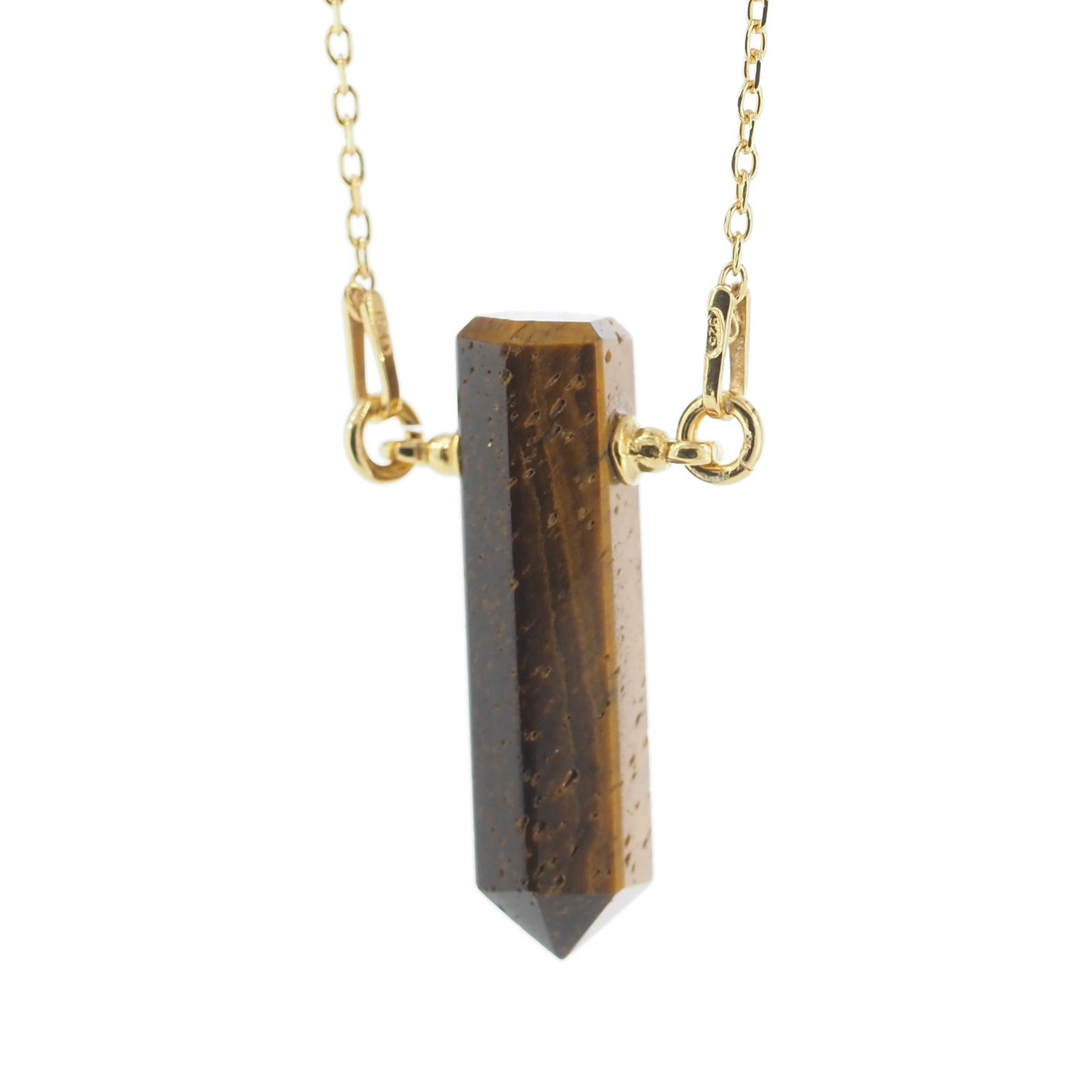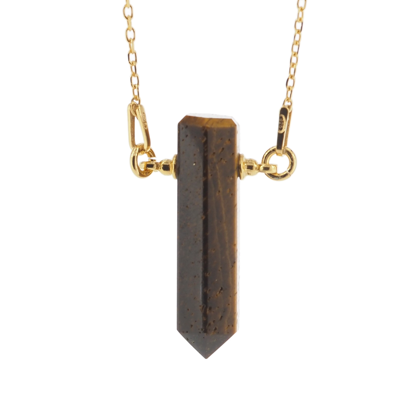 Naszyjnik z naturalnym Tygrysim Okiem w formie sopla. Kamień oprawiony ręcznie w srebro próby 925, pozłacane 24-karatowym złotem i zabezpieczone warstwą ochronną z polimeru. Całość zawieszona na eleganckim łańcuszku o długości 46 cm.