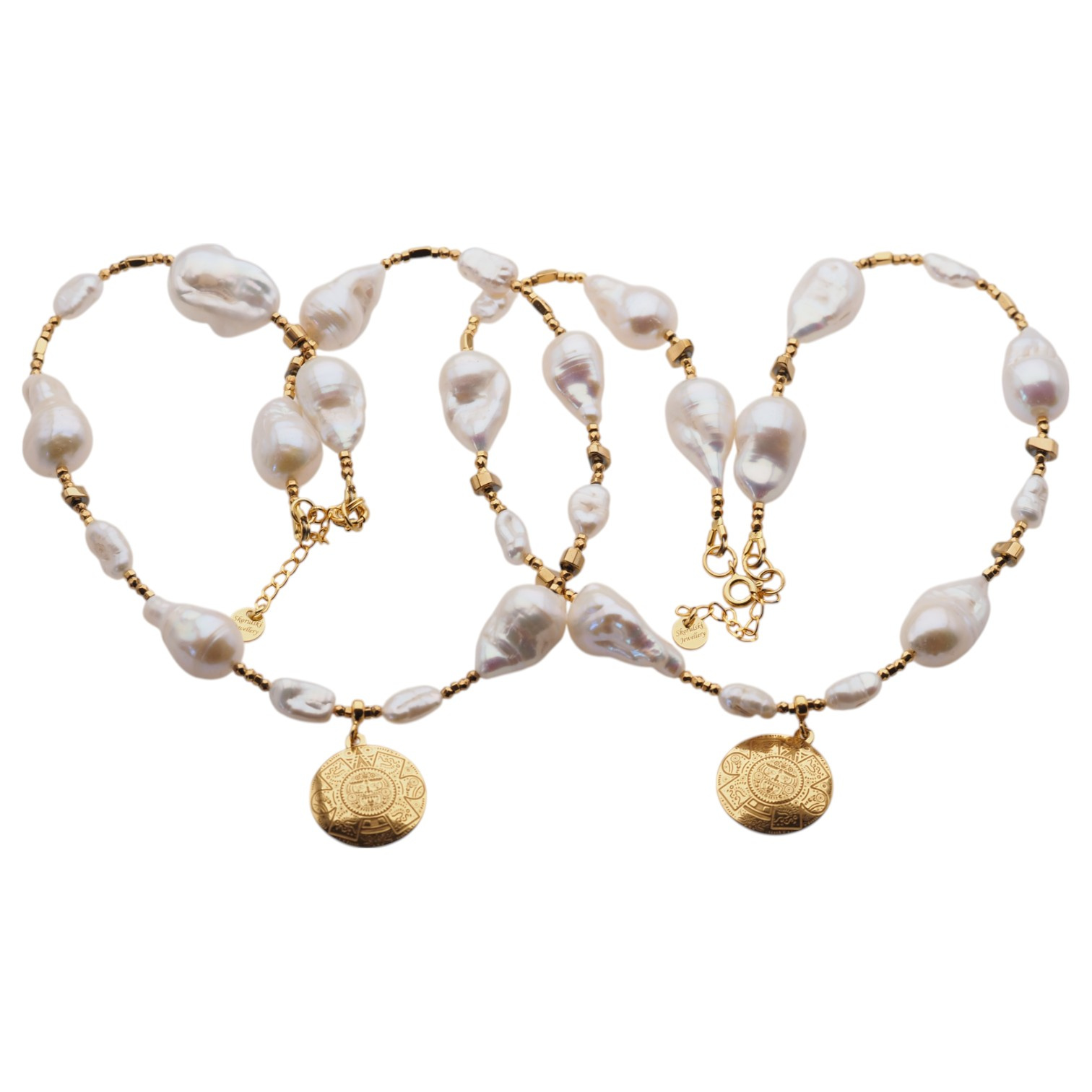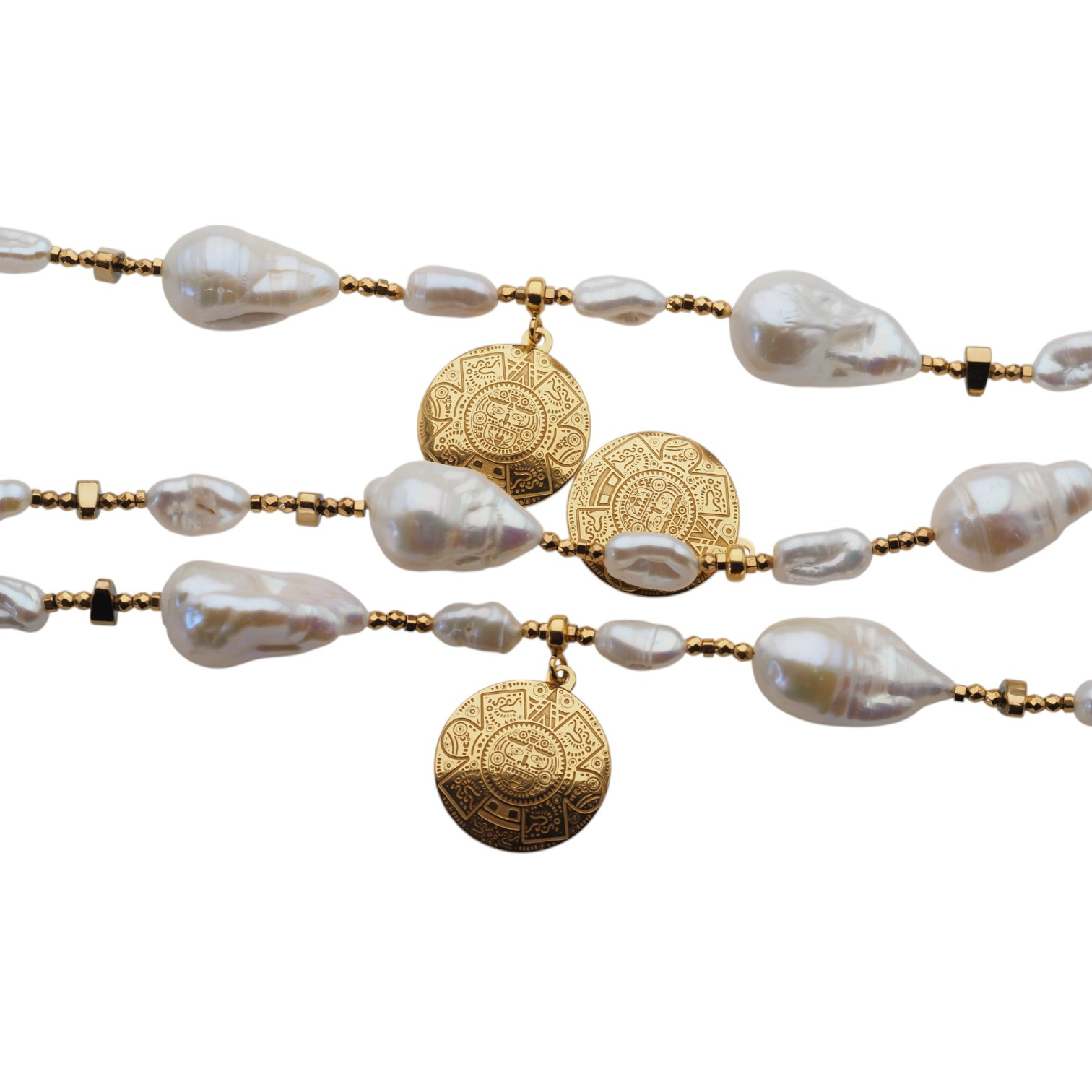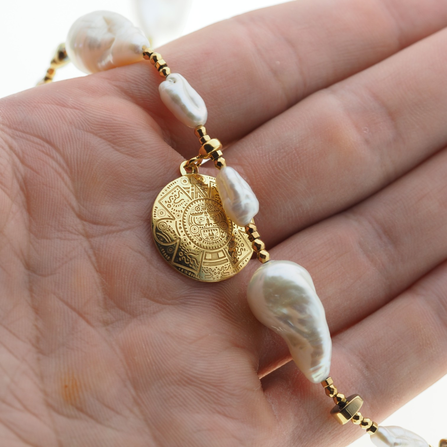 Naszyjnik z aztecką blaszką - Białe Perły hodowane i srebro złocone