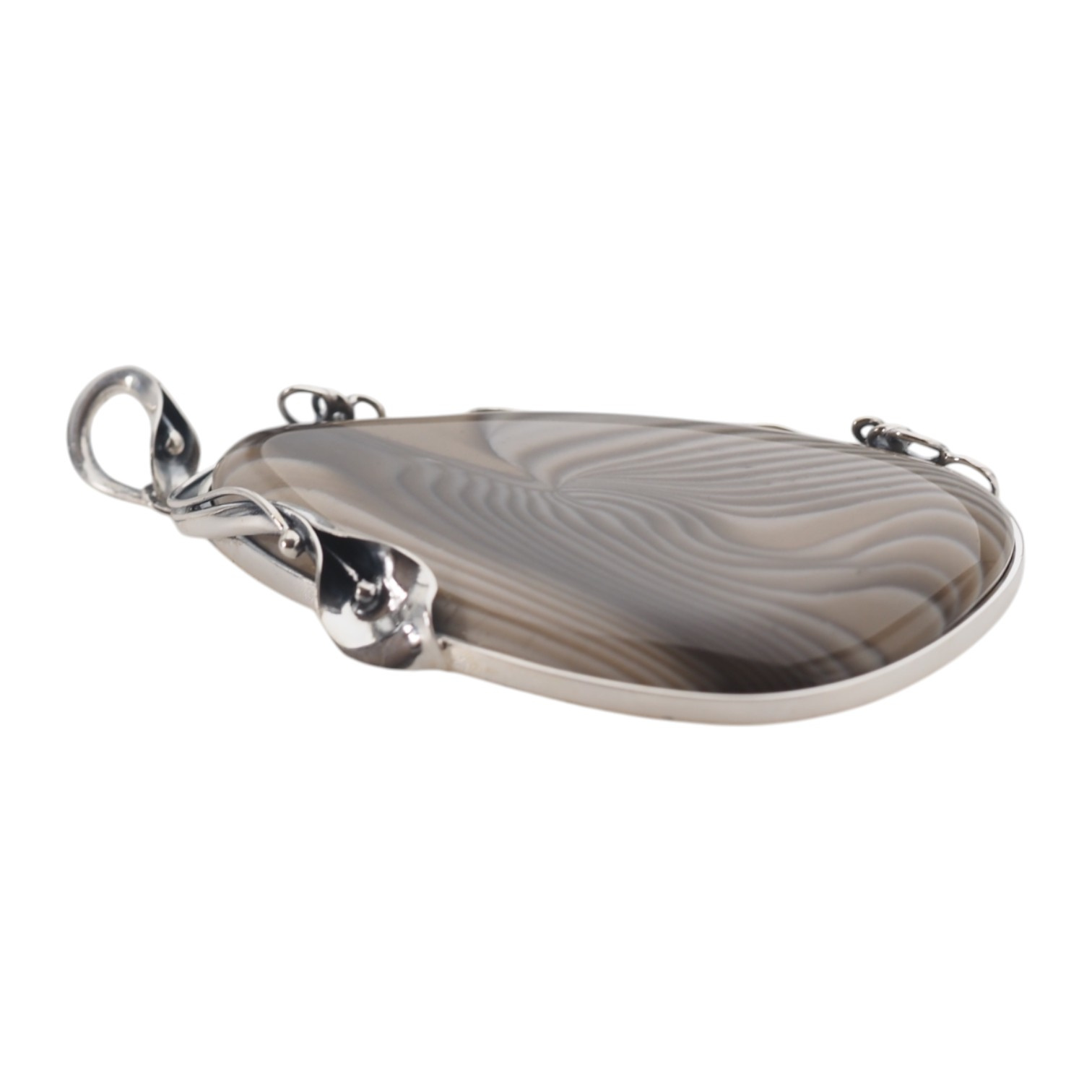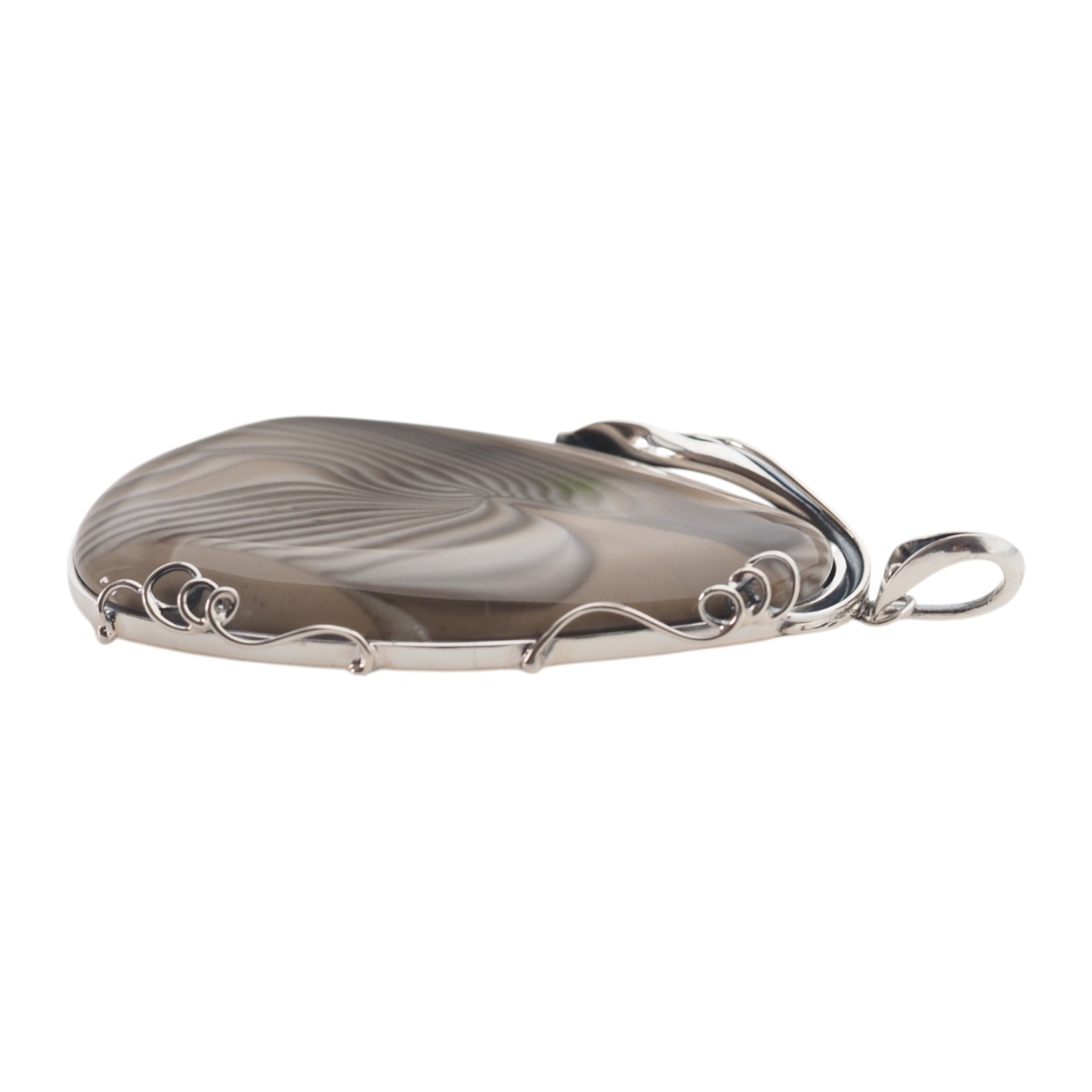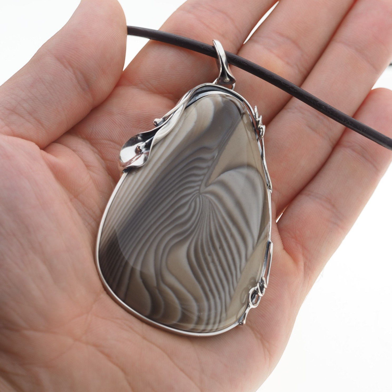 Unikalny naszyjnik z naturalnym krzemieniem pasiastym, oprawionym w srebro oksydowane próby 925 z subtelnym motywem liścia. Kamień w kształcie łzy wyróżnia się charakterystycznym rysunkiem szaro-czarno-białych pasów, które sprawiają, że każdy egzemplarz jest absolutnie niepowtarzalny.
