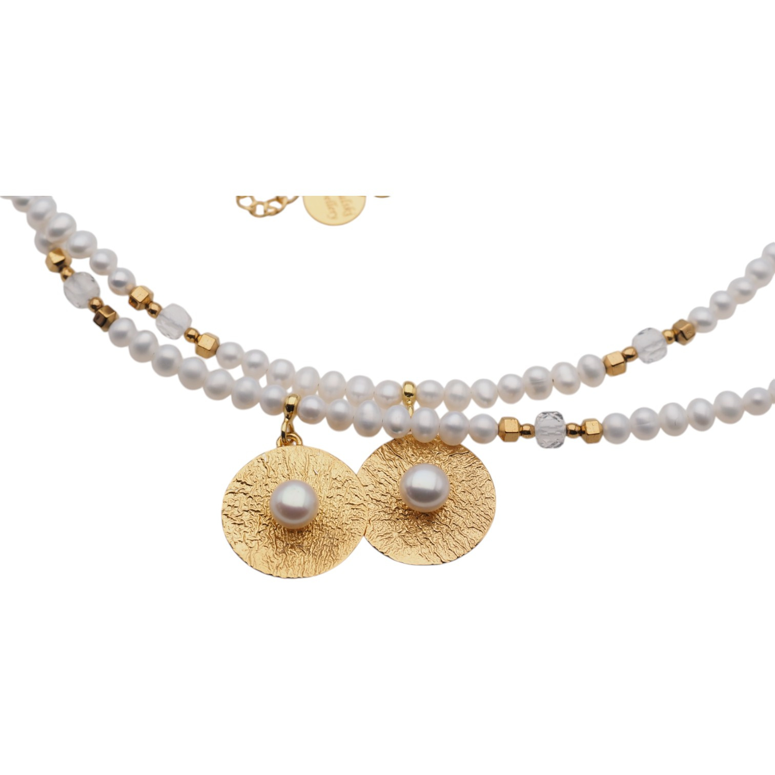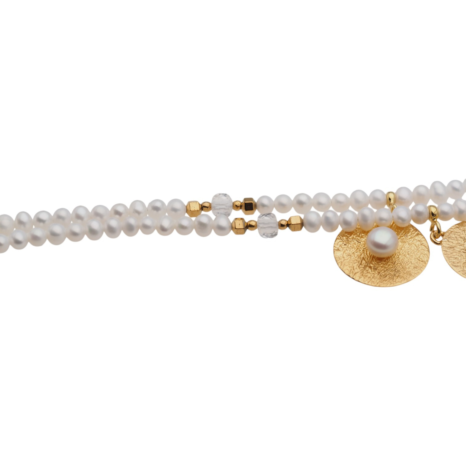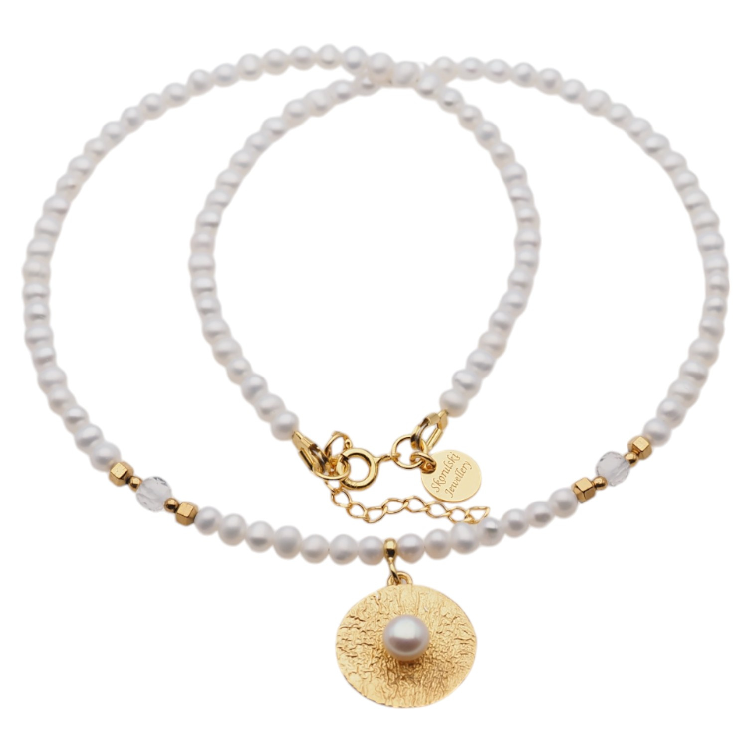 Naszyjnik z młotkowaną blaszką- Białe Perły hodowane i srebro złocone