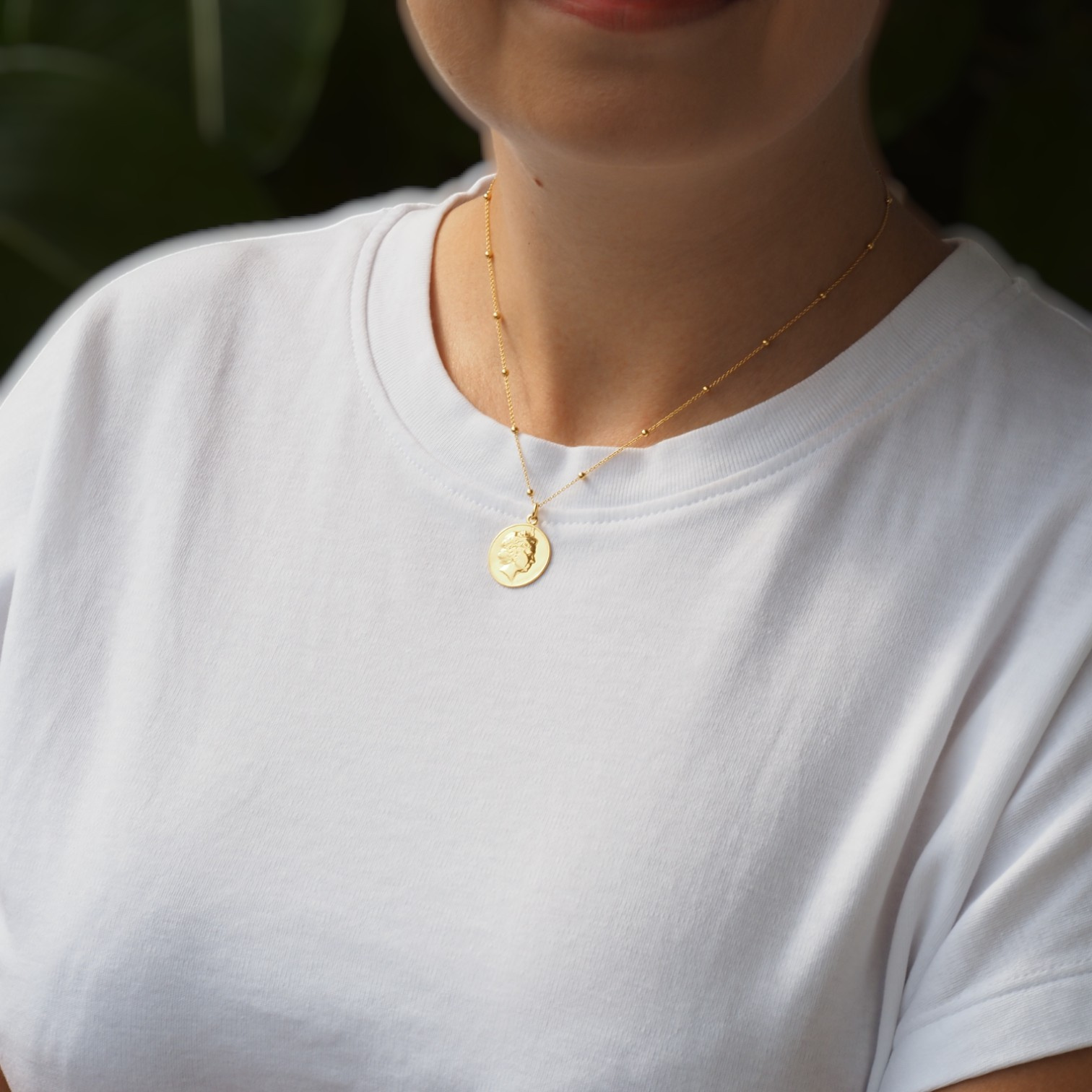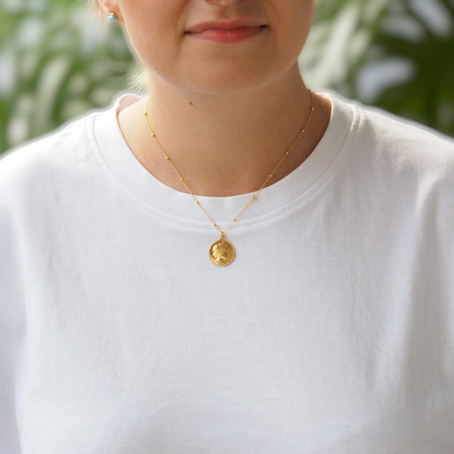 - Naszyjnik z monetą z wizerunkiem Elżbiety II na łańcuszku z kuleczkami. Srebro pozłacane, pokryte 24 karatowym złotem.