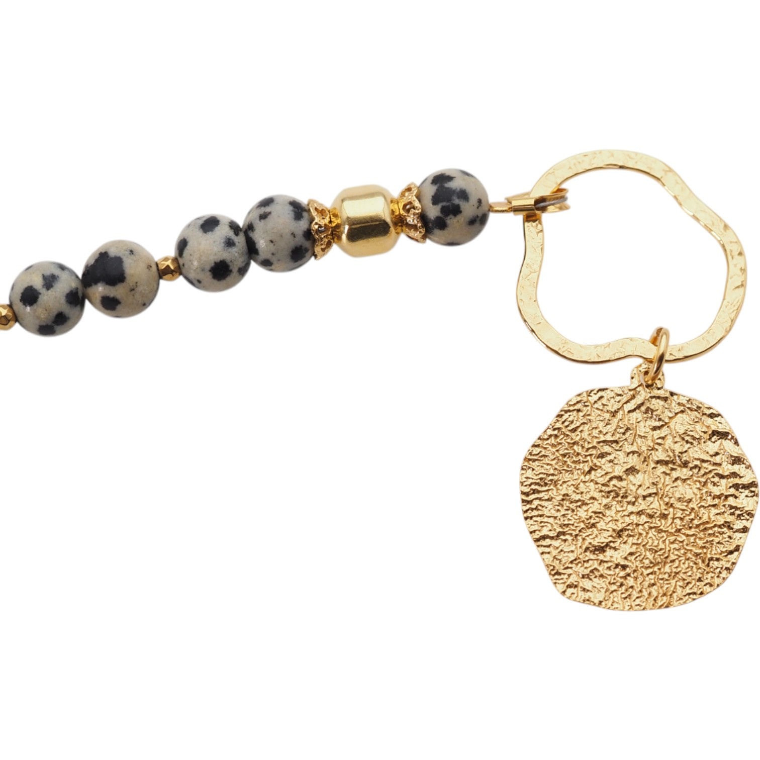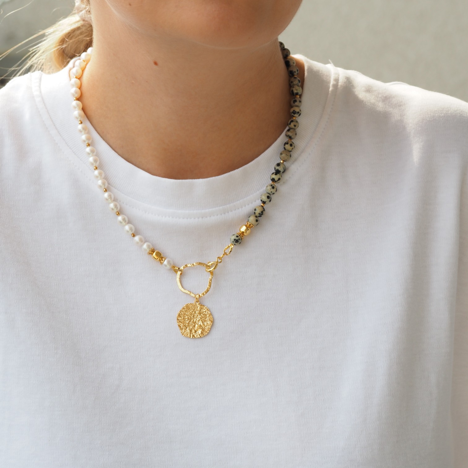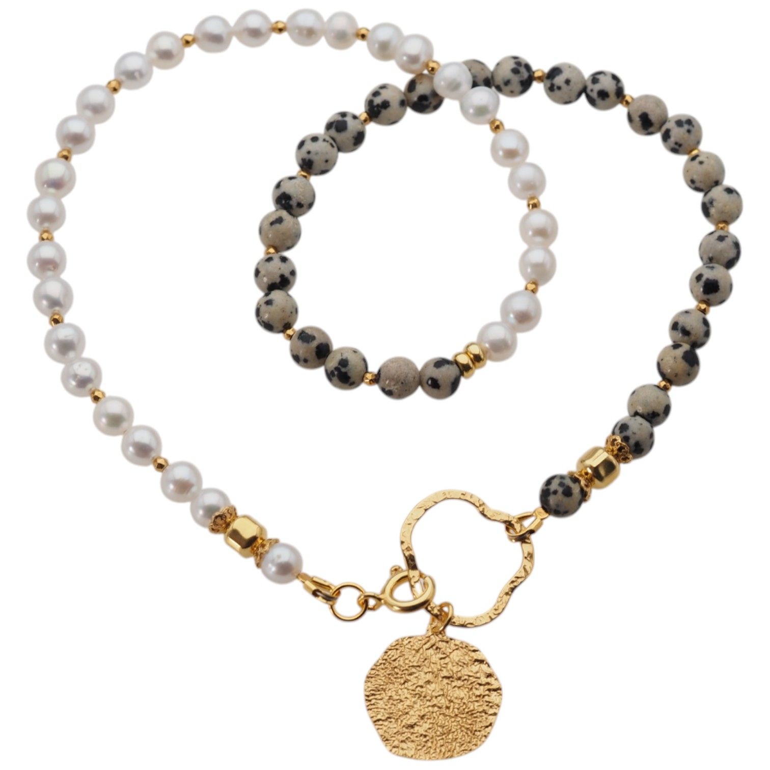 Elegancki naszyjnik wykonany ręcznie z połączenia naturalnych, hodowanych pereł słodkowodnych i jaspisu dalmatyńskiego. Klasyczna biel pereł pięknie kontrastuje z jasnym jaspisem w charakterystyczne, czarne nakrapiane wzory. Złocone elementy ze srebra próby 925 oraz efektowna zawieszka w formie młotkowanej blaszki nadają całości luksusowego i oryginalnego charakteru.