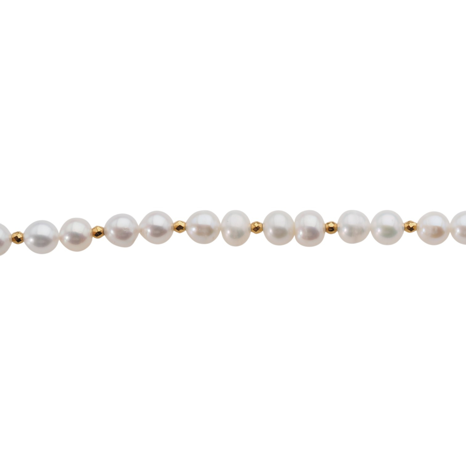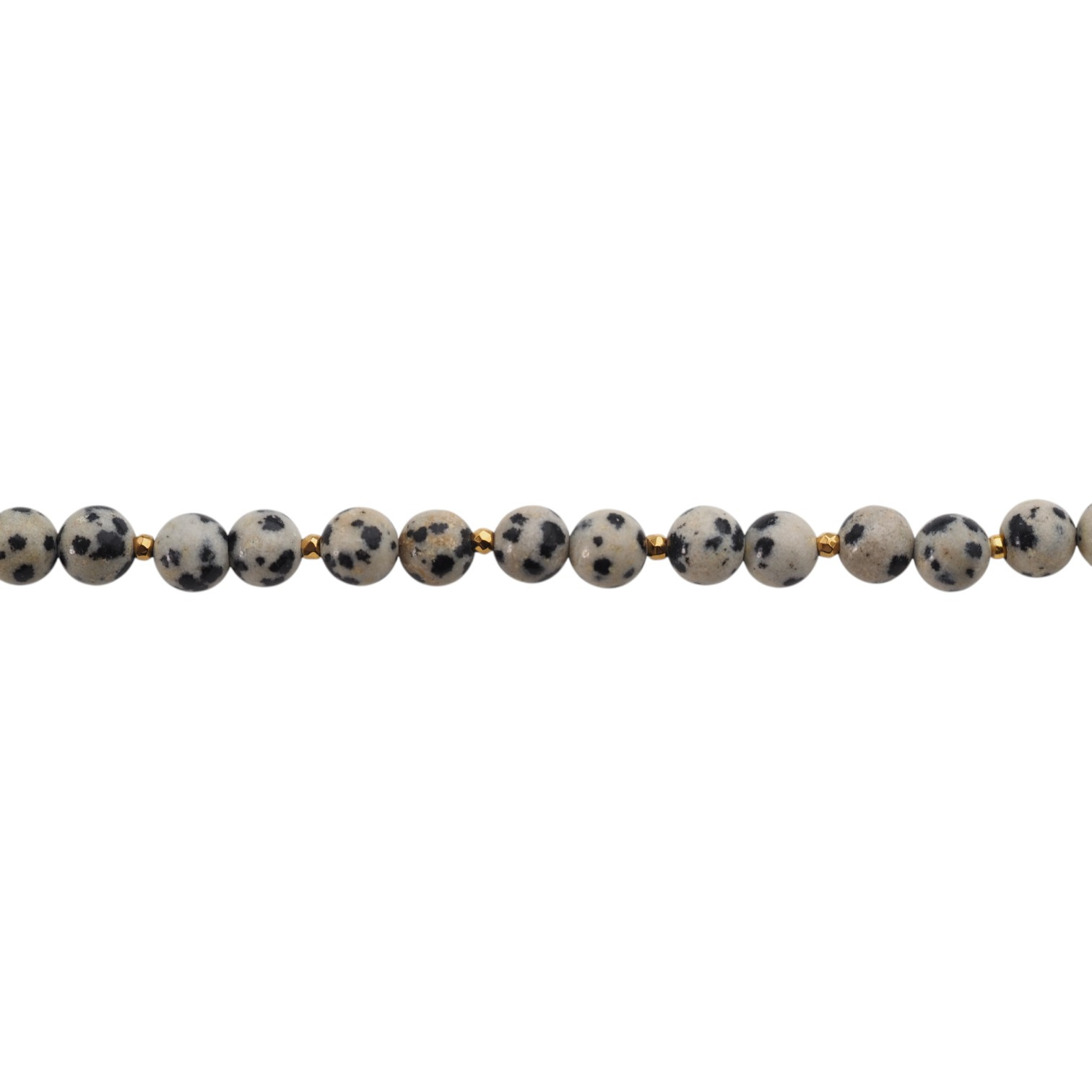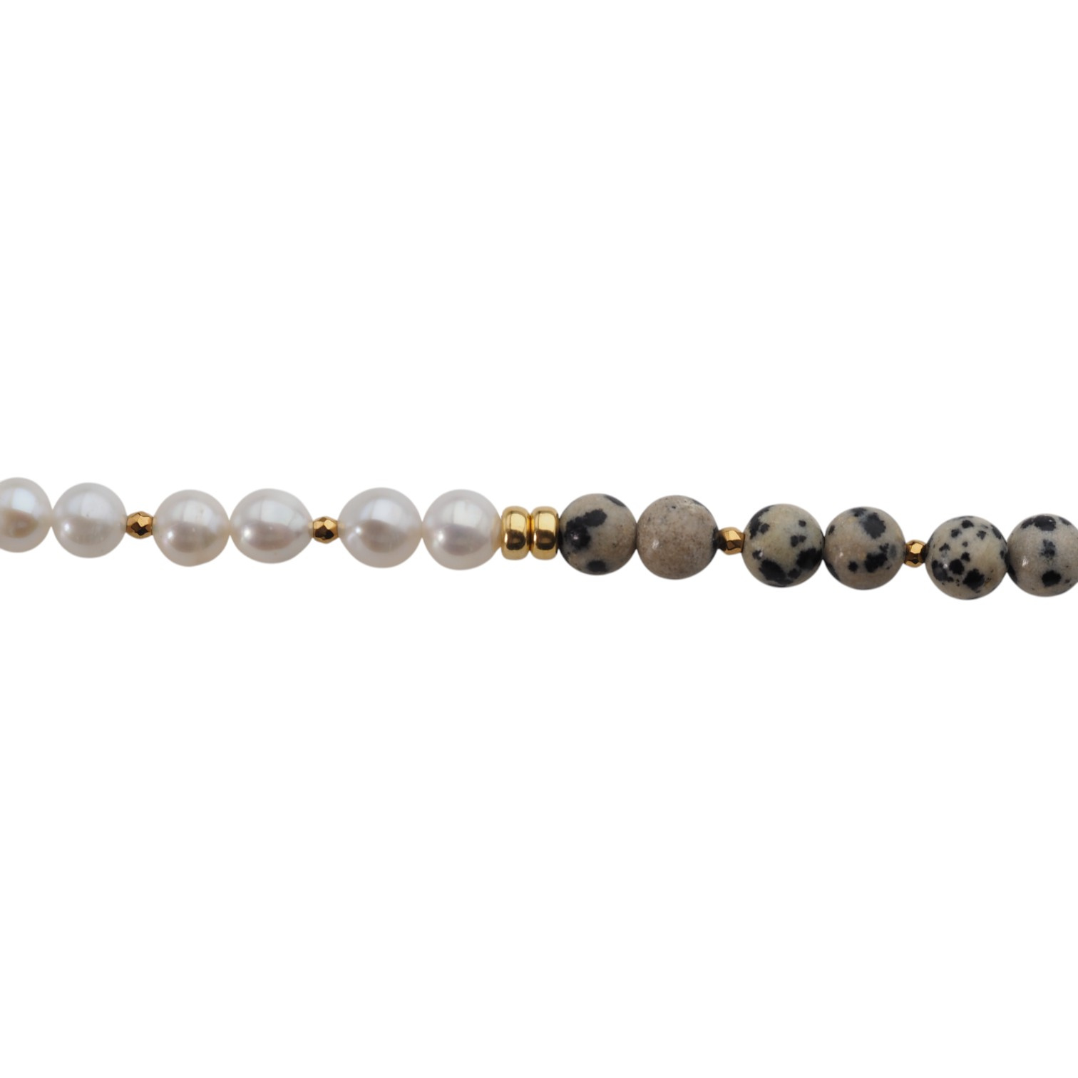 Elegancki naszyjnik wykonany ręcznie z połączenia naturalnych, hodowanych pereł słodkowodnych i jaspisu dalmatyńskiego. Klasyczna biel pereł pięknie kontrastuje z jasnym jaspisem w charakterystyczne, czarne nakrapiane wzory. Złocone elementy ze srebra próby 925 oraz efektowna zawieszka w formie młotkowanej blaszki nadają całości luksusowego i oryginalnego charakteru.