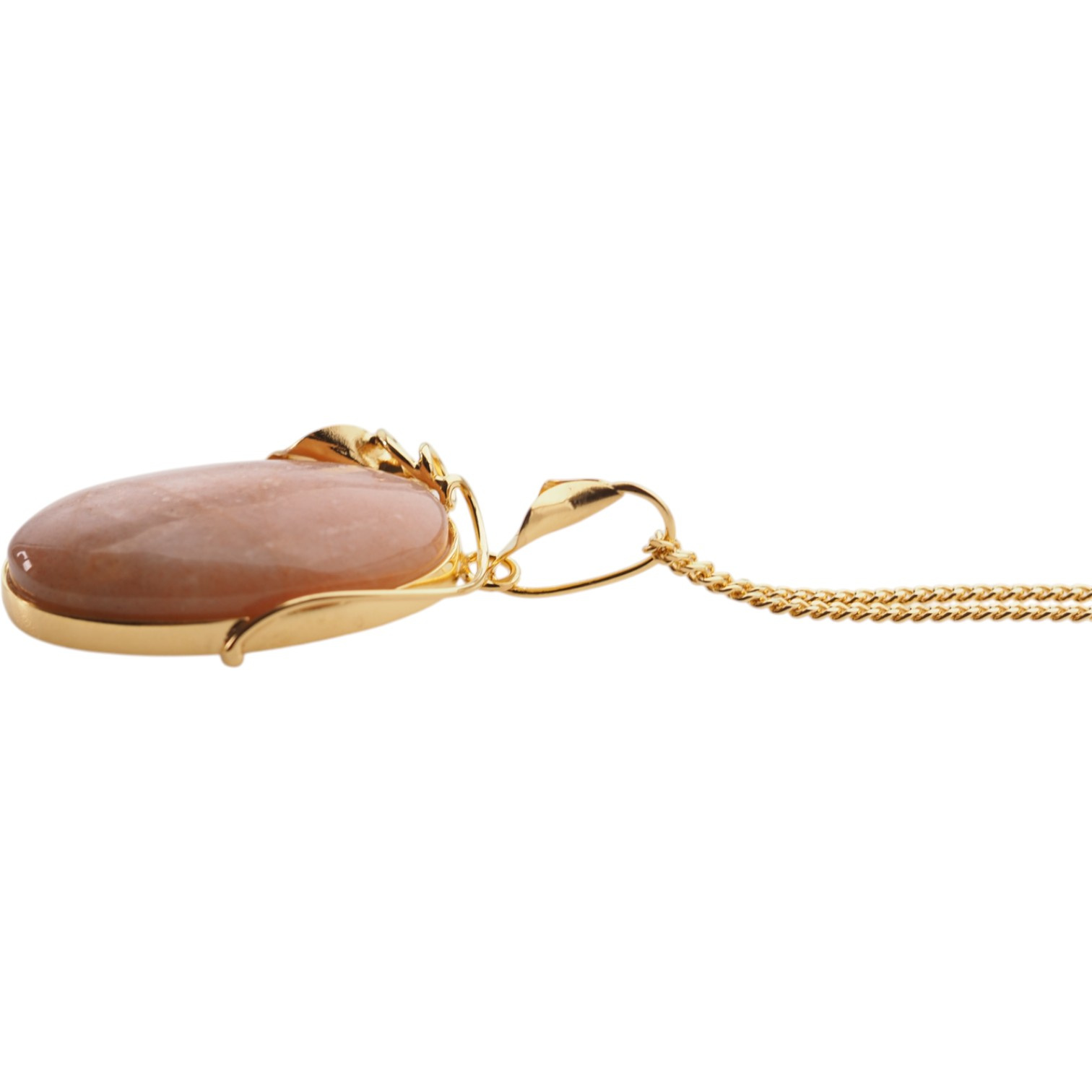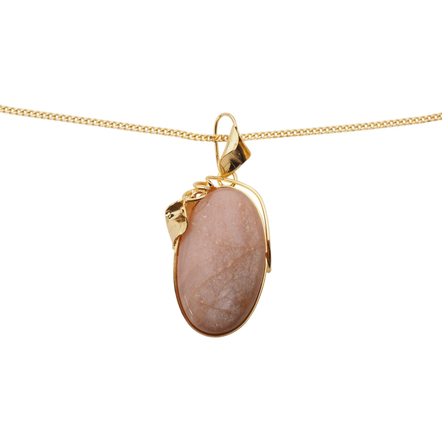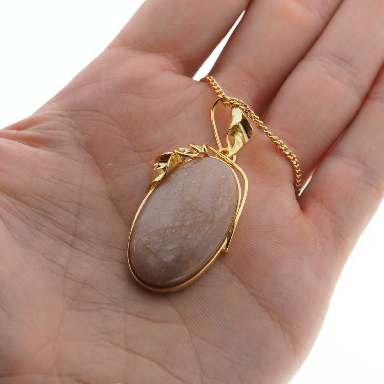 Centralnym elementem naszyjnika jest owalny Kamień Słoneczny o ciepłej, złocistobrązowej barwie, z subtelnymi, migoczącymi refleksami, które ożywiają całość przy każdym ruchu. Artystyczna oprawa z motywem liścia nadaje mu lekkości, a jednocześnie pięknie eksponuje naturalny kamień.