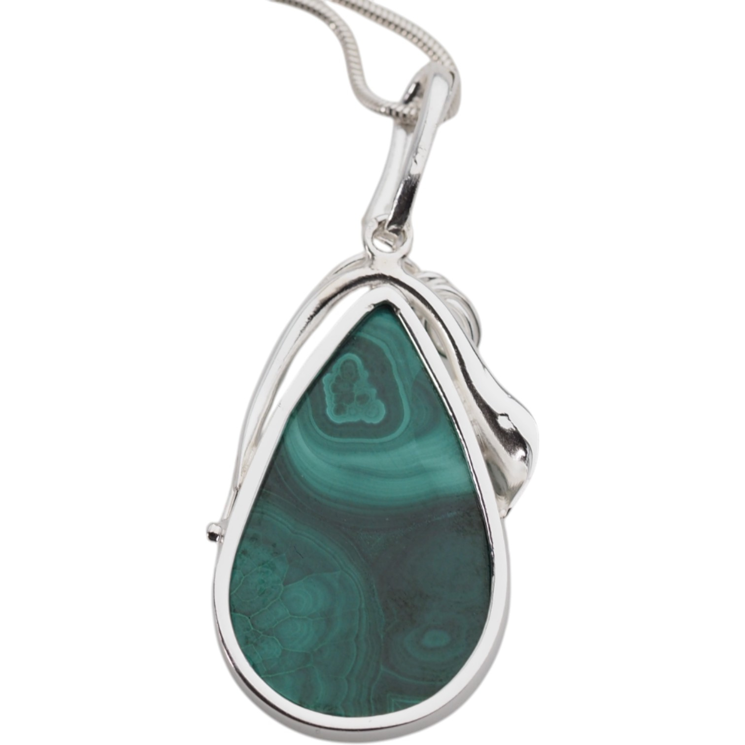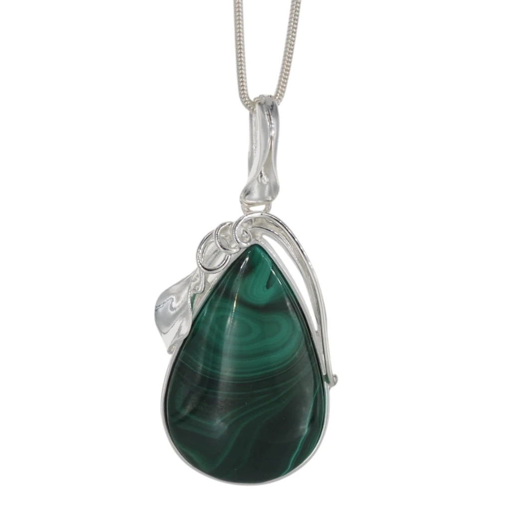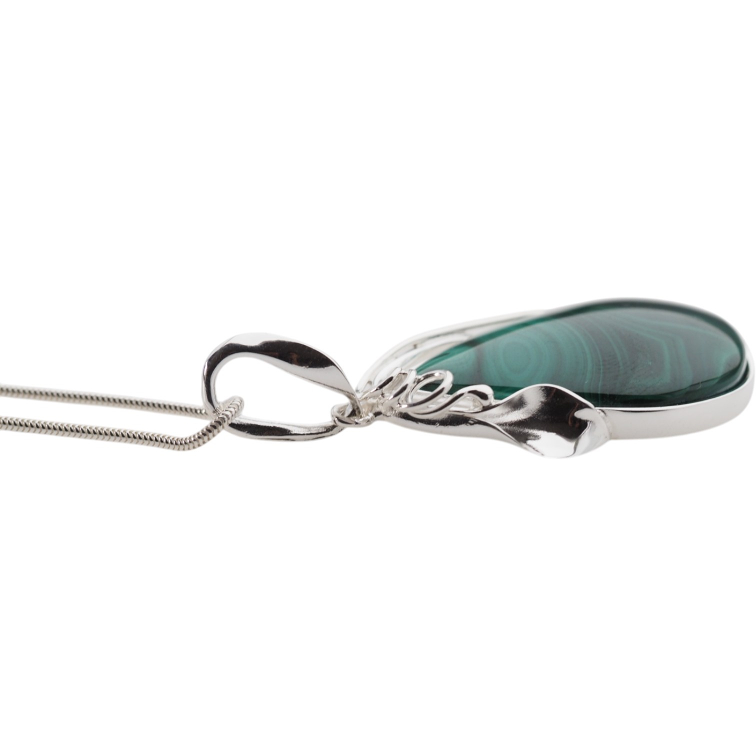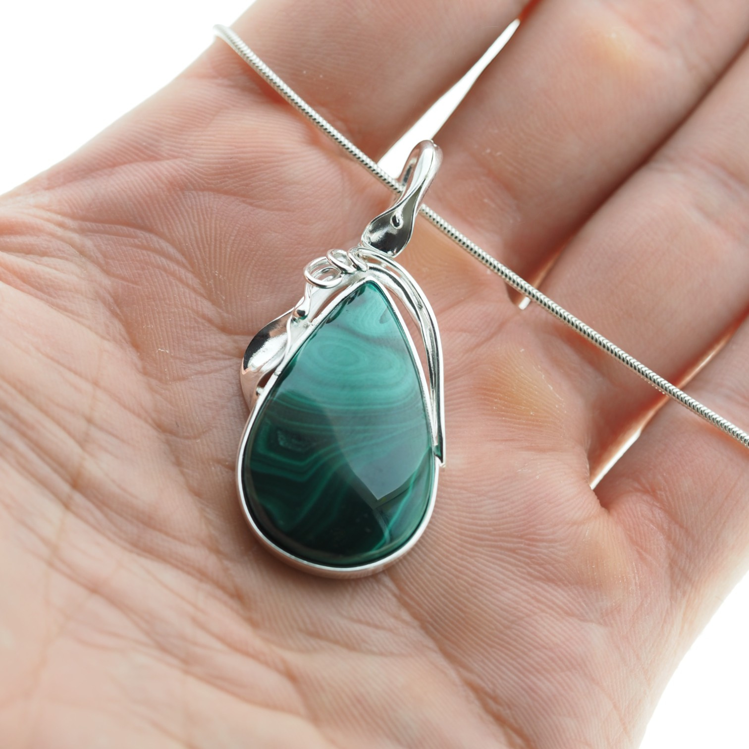 Ręcznie wykonany naszyjnik z naturalnym malachitem to biżuteria, która zachwyca swoją formą i kolorem. Kamień w kształcie łzy prezentuje charakterystyczne, zielone pasma – unikalny układ wzorów sprawia, że każdy egzemplarz jest absolutnie niepowtarzalny.