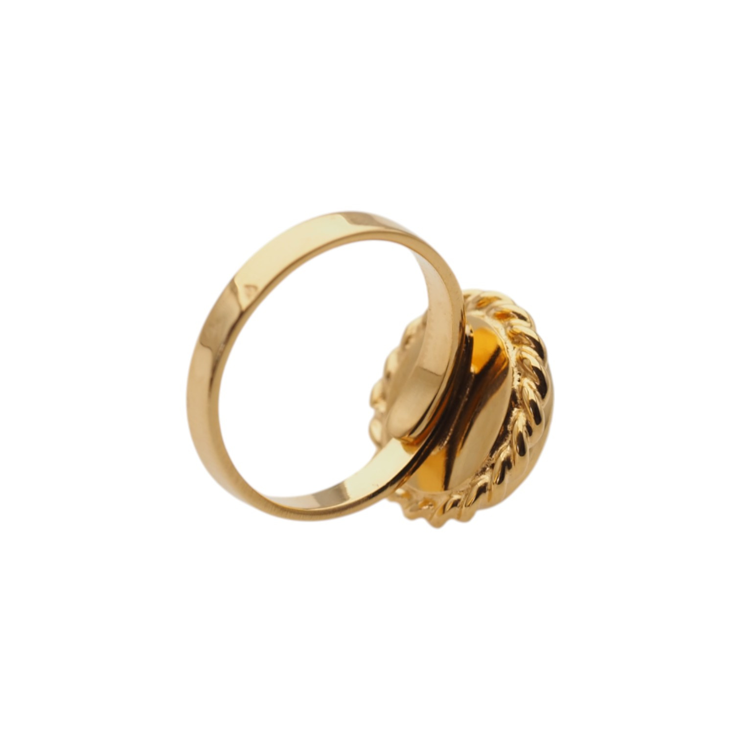 Elegancki pierścionek z okrągłą, białą perłą hodowaną w klasycznej, kobiecej oprawie. Gładka perła o średnicy ok. 10 mm osadzona jest centralnie w misternie rzeźbionej koronie z pozłacanego srebra. Zdobienie wokół kamienia przypomina spleciony wianek lub sznur, co dodaje projektowi subtelnego luksusu. Całość wykonana ręcznie z dbałością o detale i zabezpieczona powłoką ochronną, która chroni złocenie przed ścieraniem.