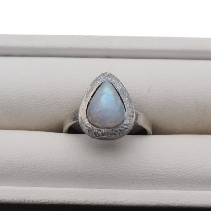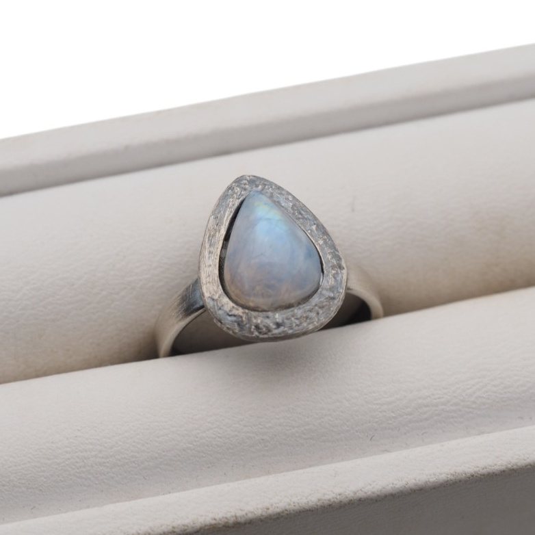 Srebrny pierścionek z Kamieniem Księżycowym został zrobiony ręcznie.