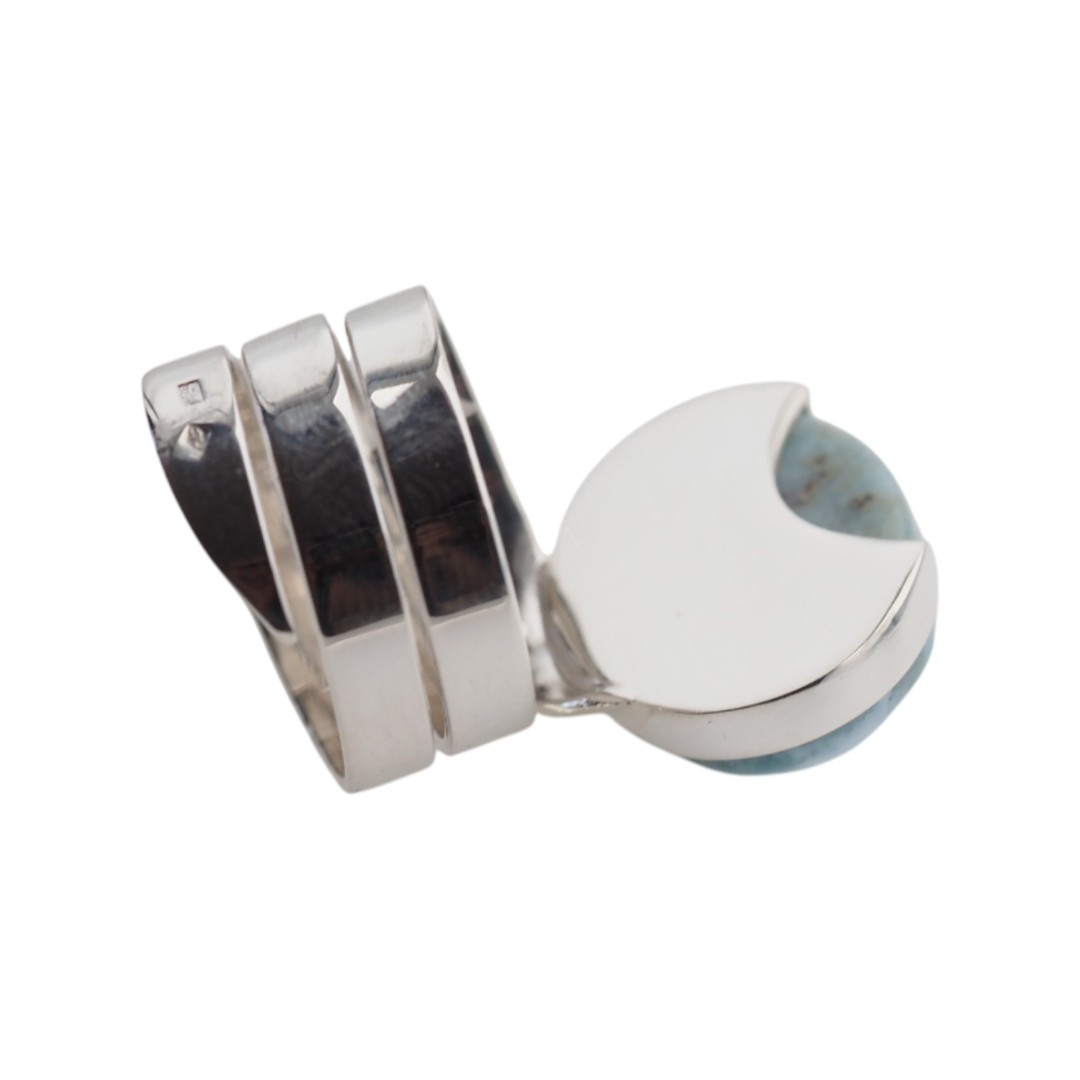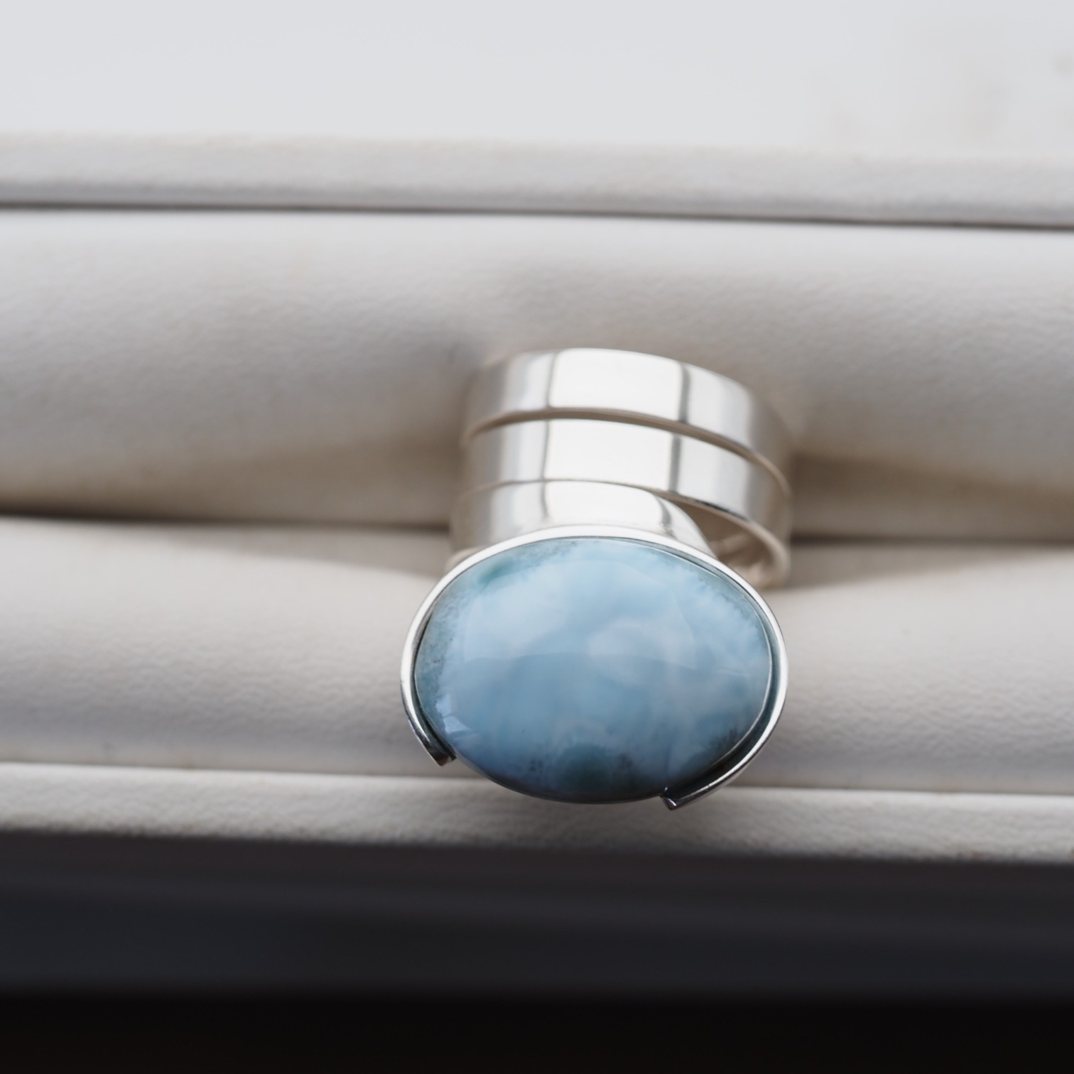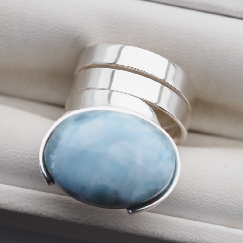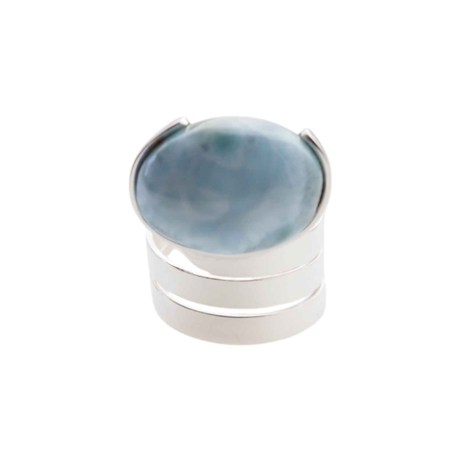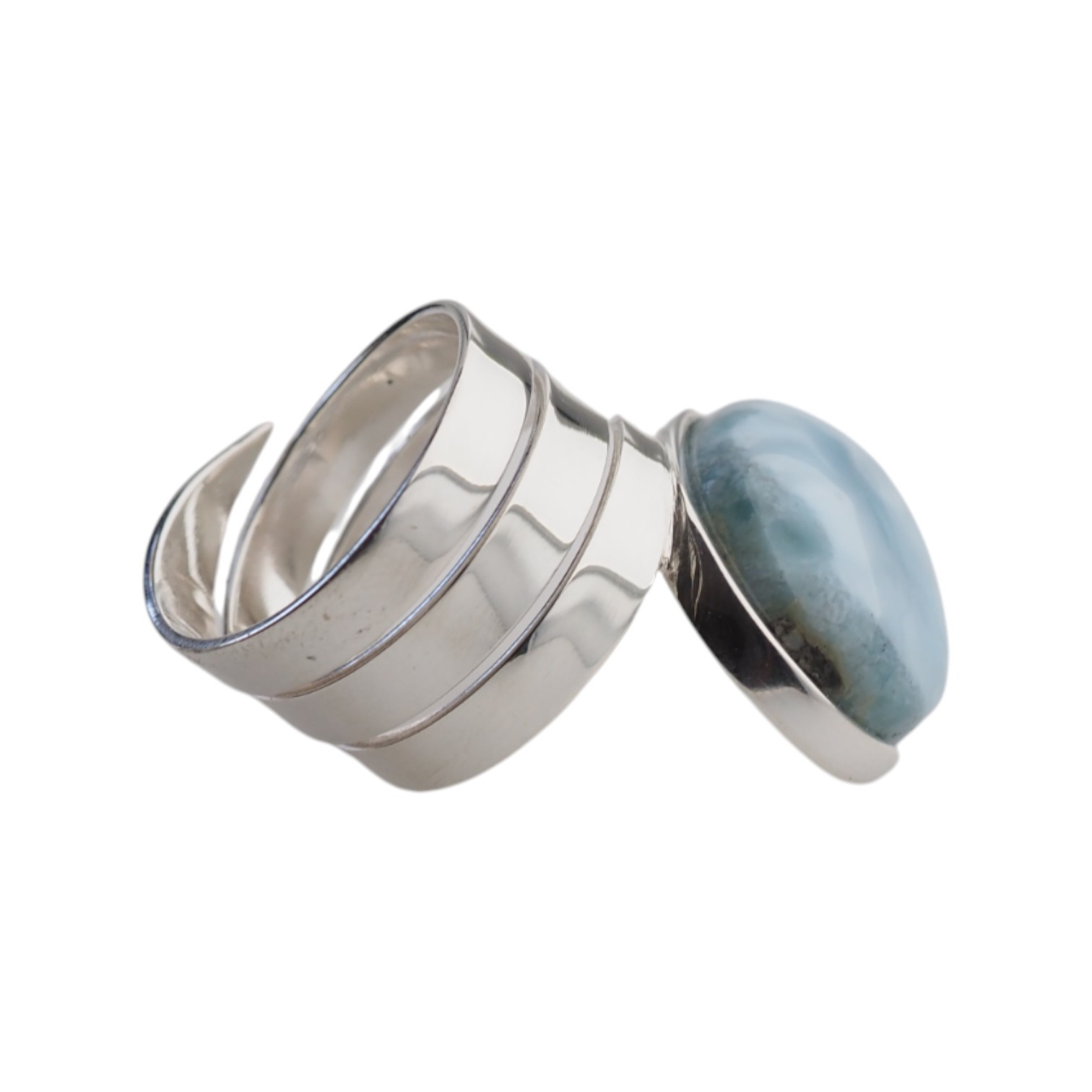 Ręcznie wykonany srebrny pierścionek z naturalnym larimarem to połączenie nietuzinkowego designu i magii jednego z najrzadszych kamieni świata. Larimar – znany jako „kamień delfina” i „kamień Atlantów” – występuje wyłącznie na słonecznej Dominikanie. Jego błękit z subtelnymi białymi i zielonkawymi smugami przywodzi na myśl spokojne, karaibskie fale i morską głębię.