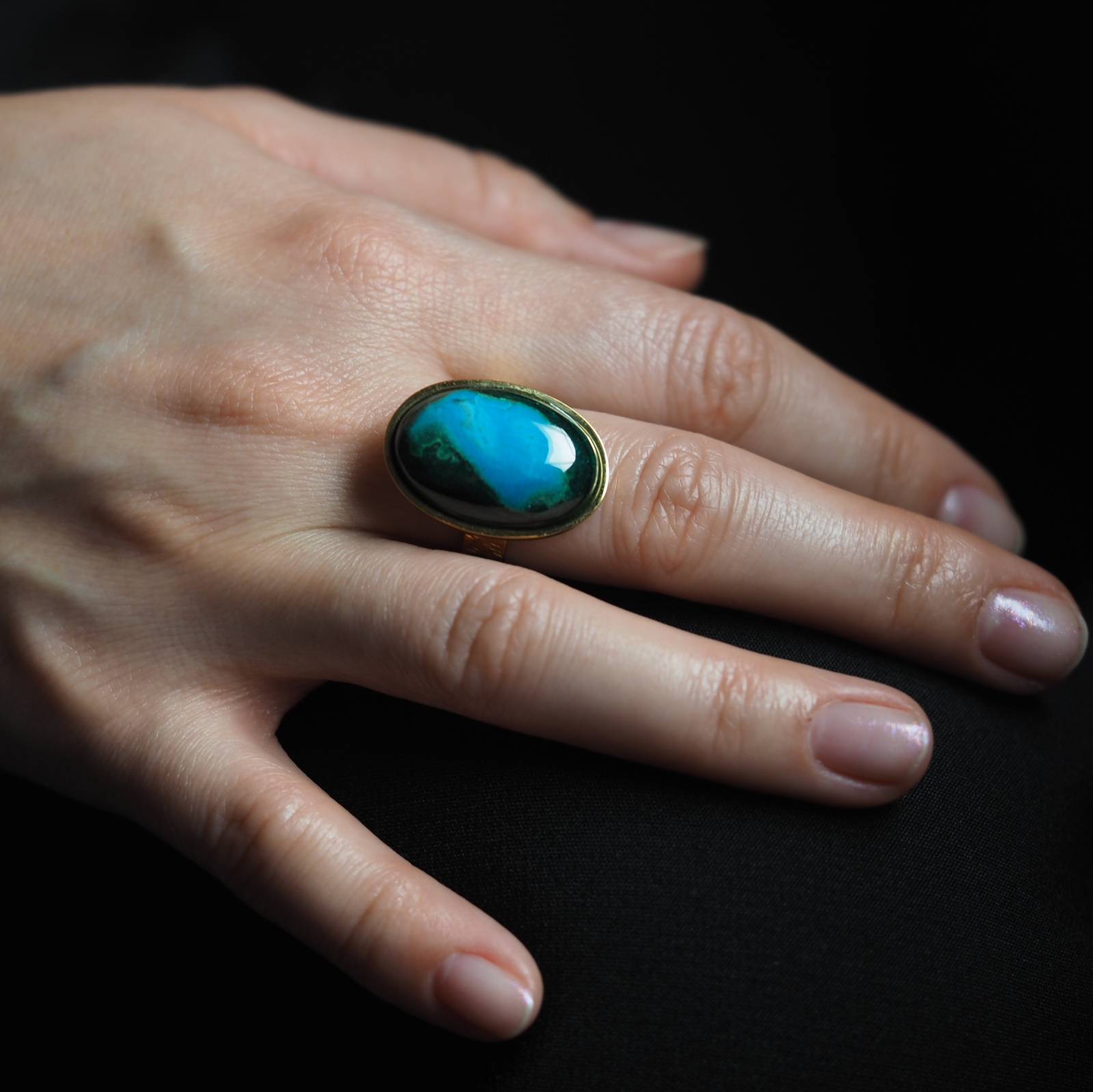 Srebrny, złocony pierścionek Malachit z Turkusem został wykonany ręcznie.