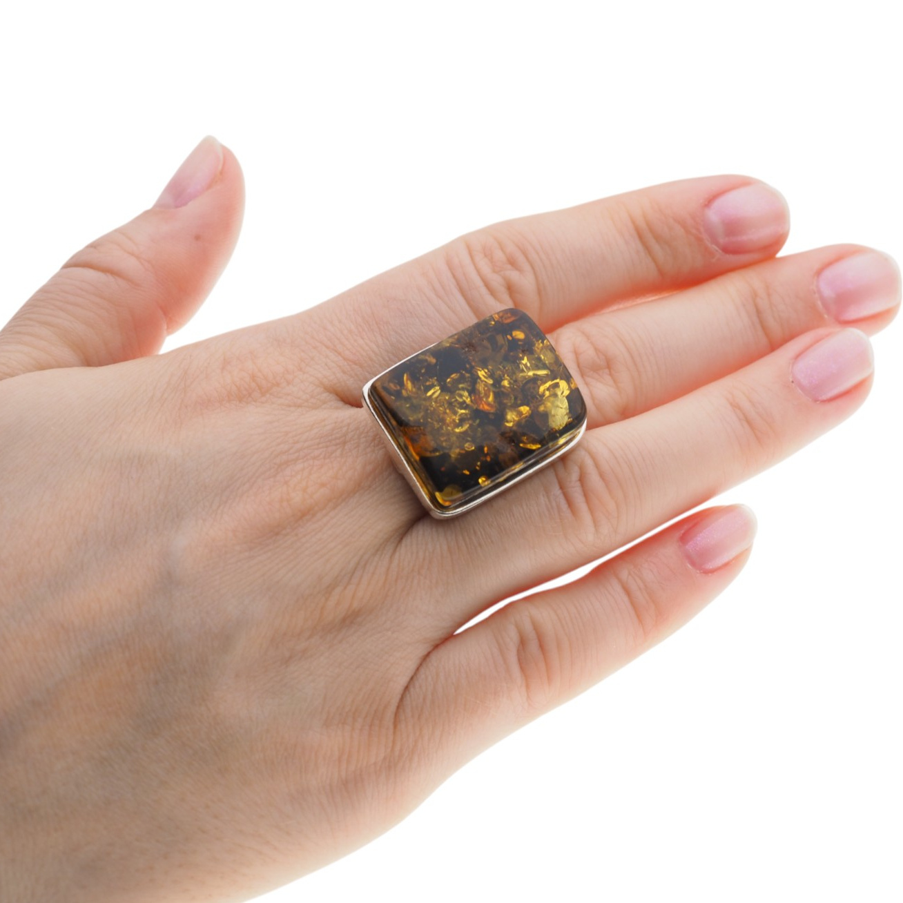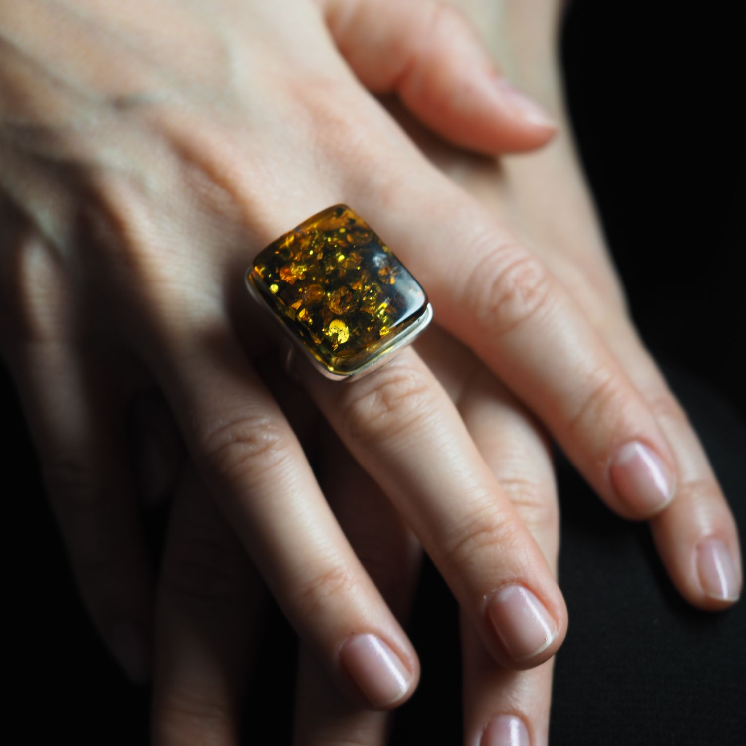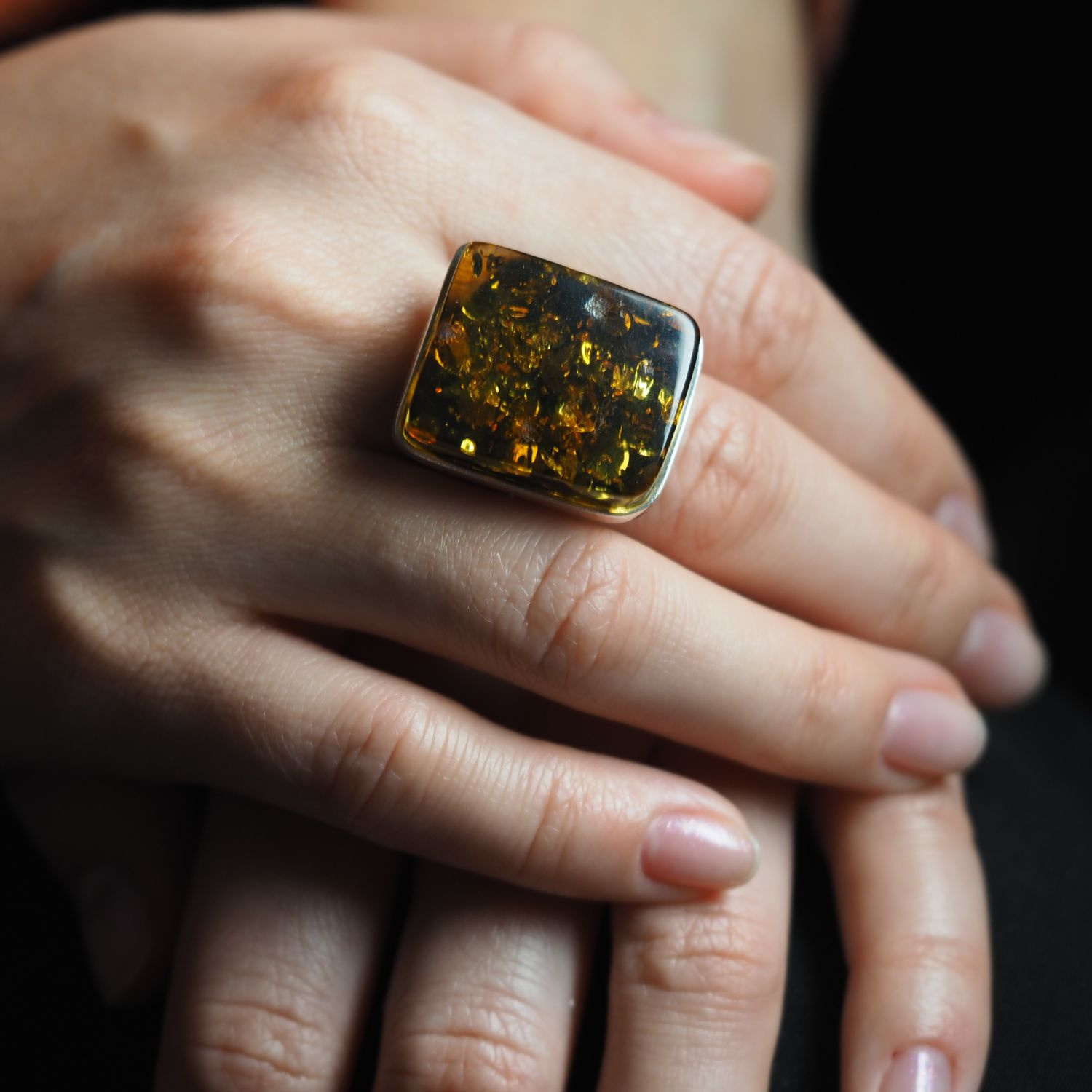 Ręcznie wykonany pierścionek z naturalnym bursztynem bałtyckim w zielonym odcieniu. Duży kamień o wymiarach 24 × 20 mm został oprawiony w minimalistyczną formę ze srebra próby 925, która eksponuje unikalną strukturę i kolor bursztynu. Regulowany model o wyrazistym, szlachetnym charakterze.