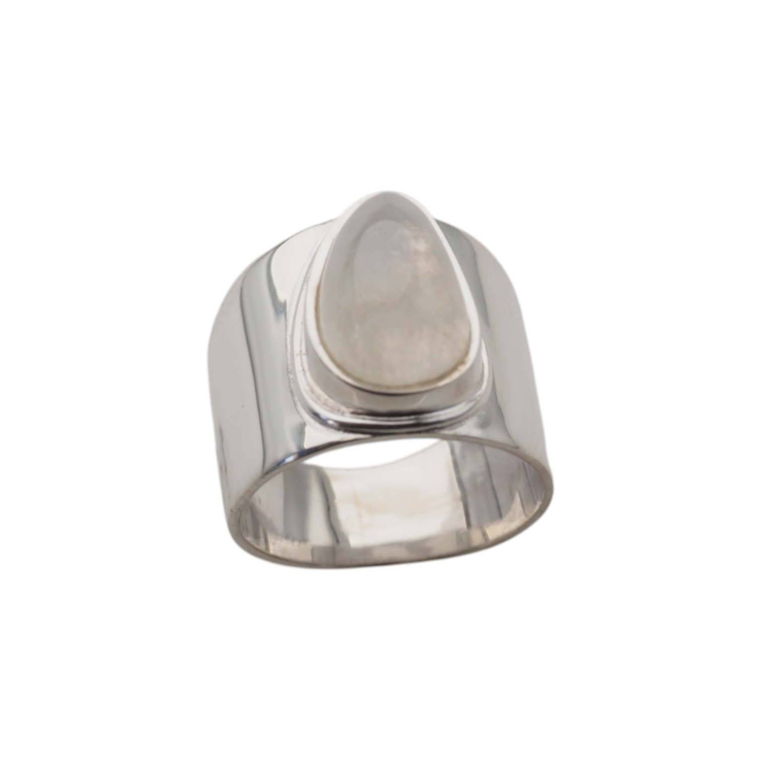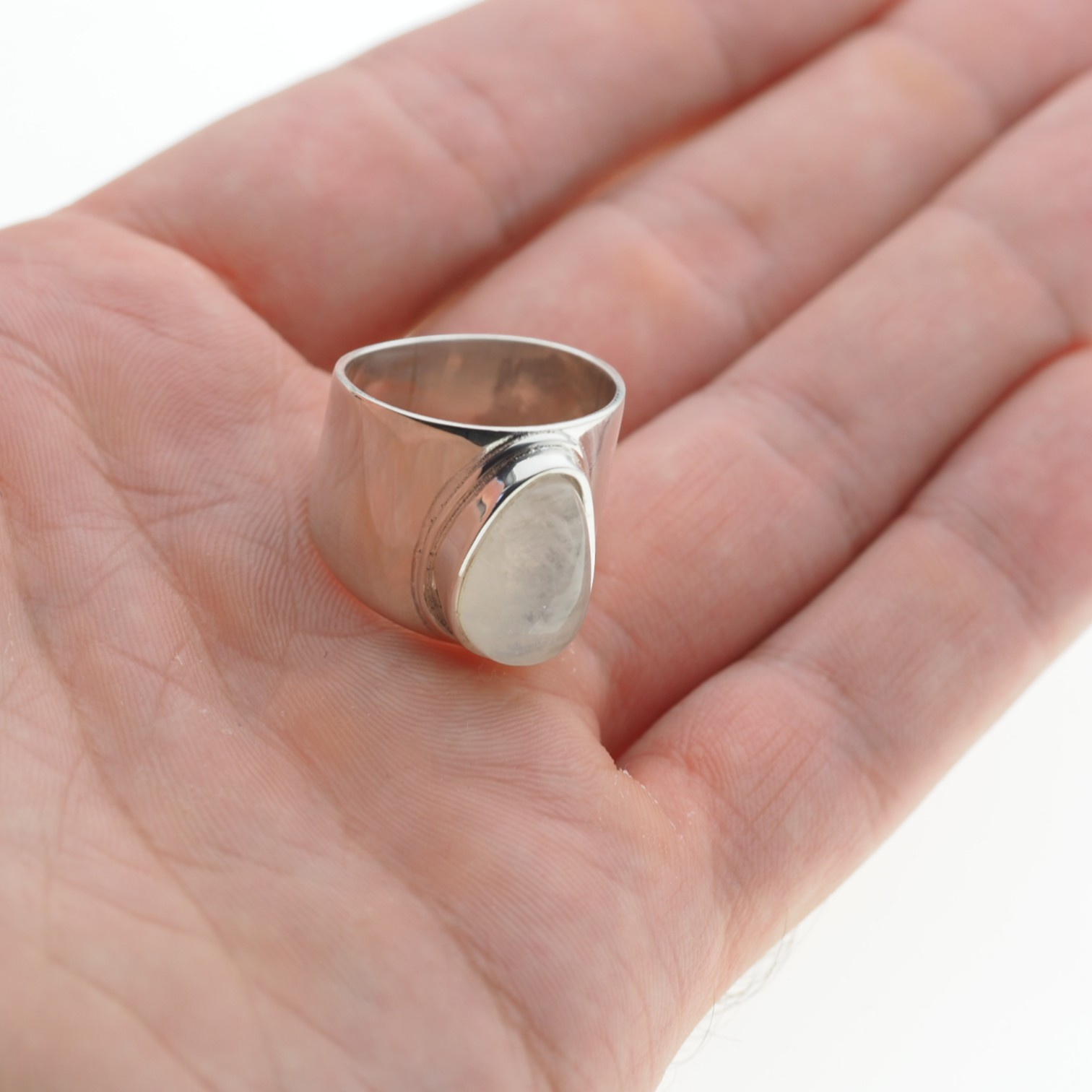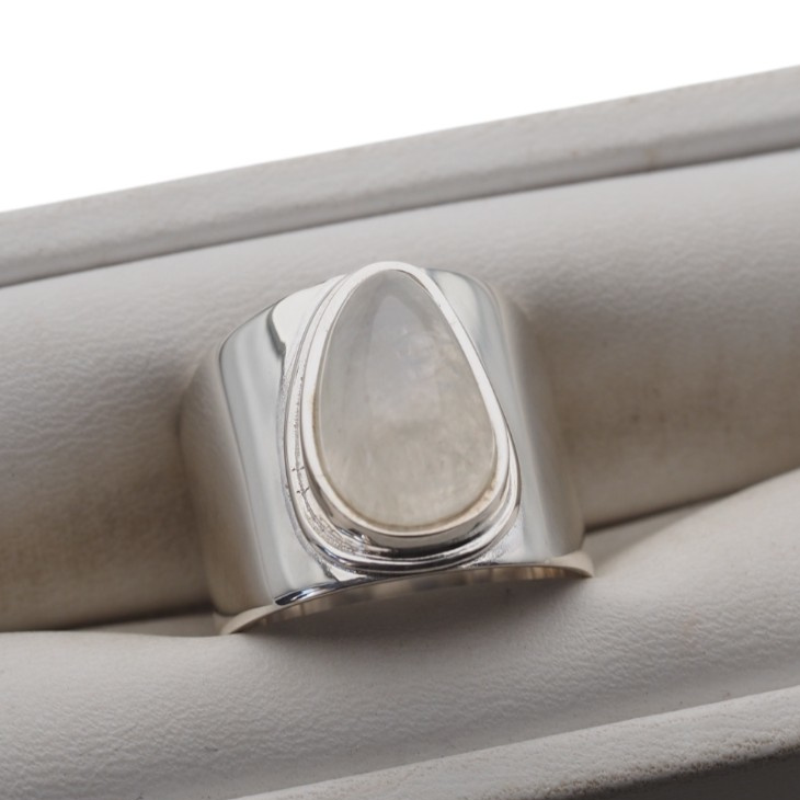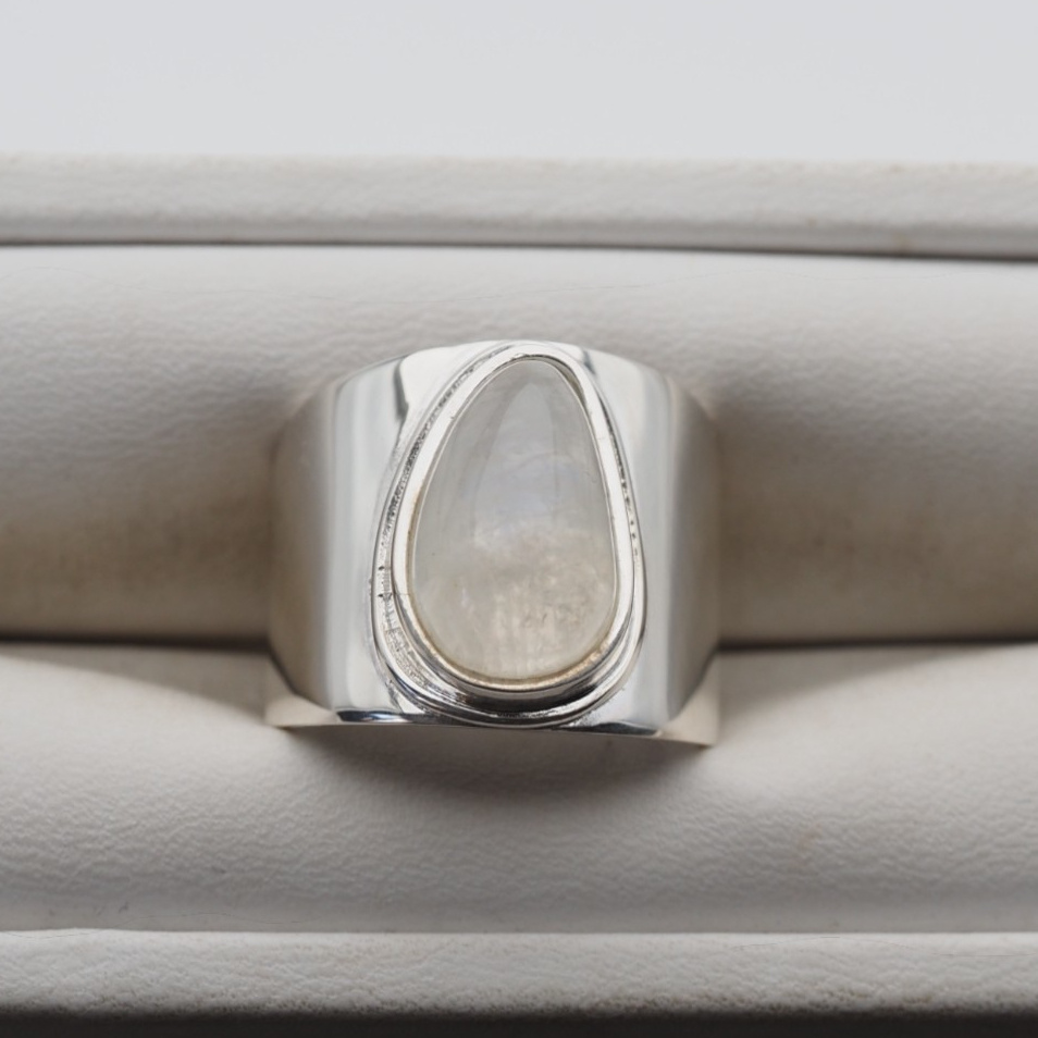 Solidny sygnet z naturalnym Kamieniem Księżycowym oprawiony w szeroką, gładką obrączkę ze srebra próby 925. Kamień o szlifie kaboszonowym, oszlifowany w formie kropli, emanuje delikatnym, mlecznym połyskiem z charakterystyczną grą barw – w zależności od kąta padania światła ujawnia subtelne refleksy fioletowe, żółtawe i niebieskoszare. Oprawa kamienia jest prosta, bez zbędnych ozdobników – jej zadaniem jest maksymalne wyeksponowanie kamienia i zachowanie jego naturalnego uroku.