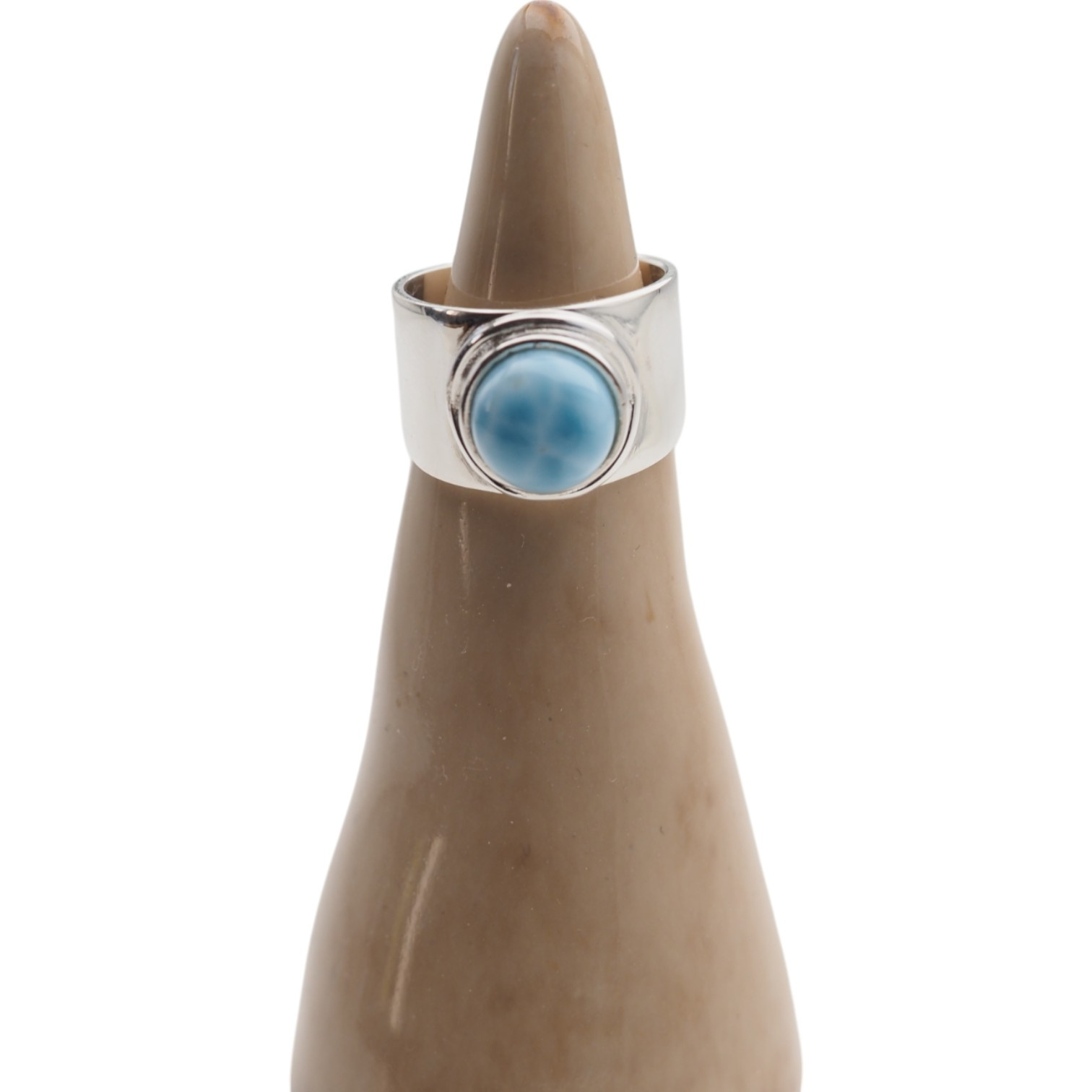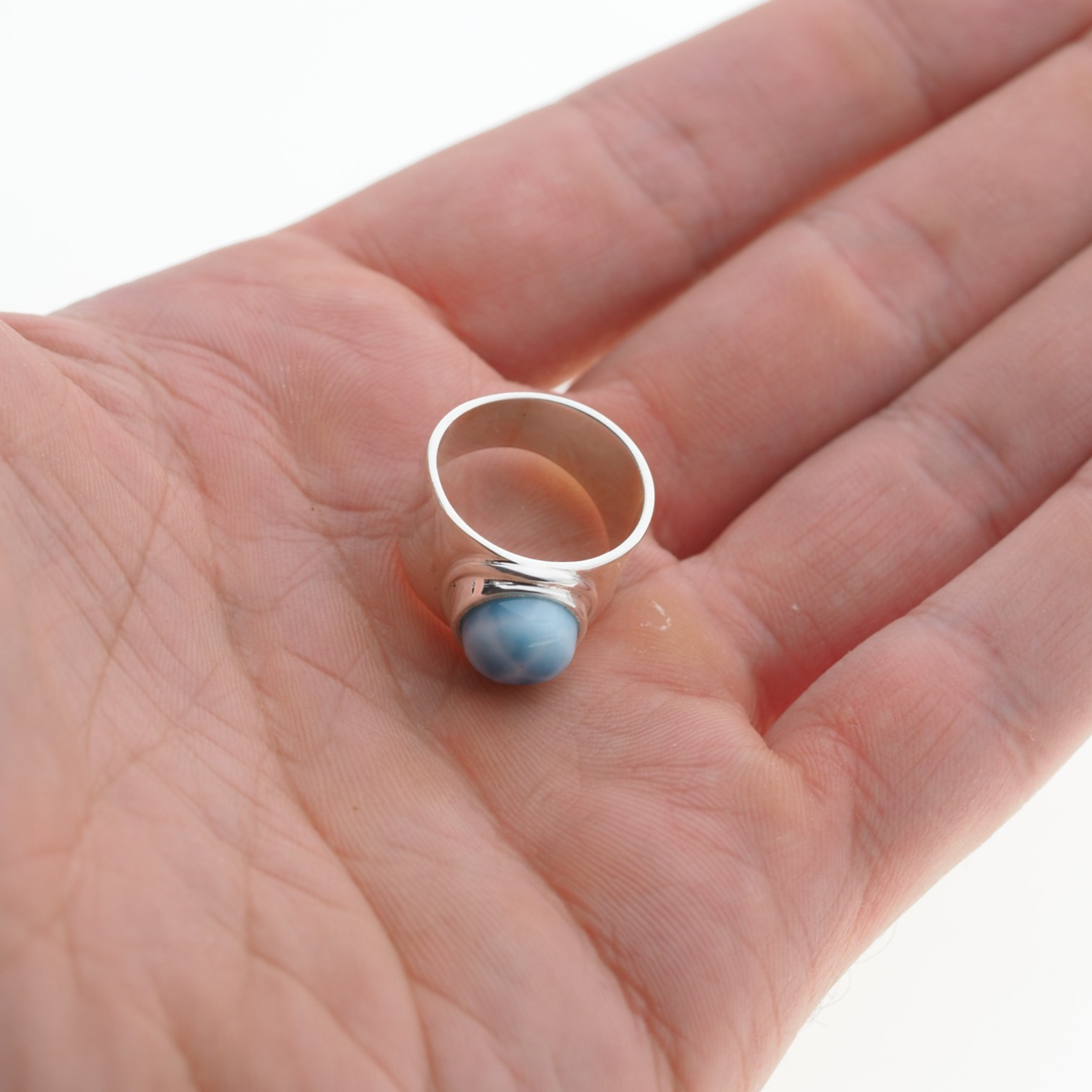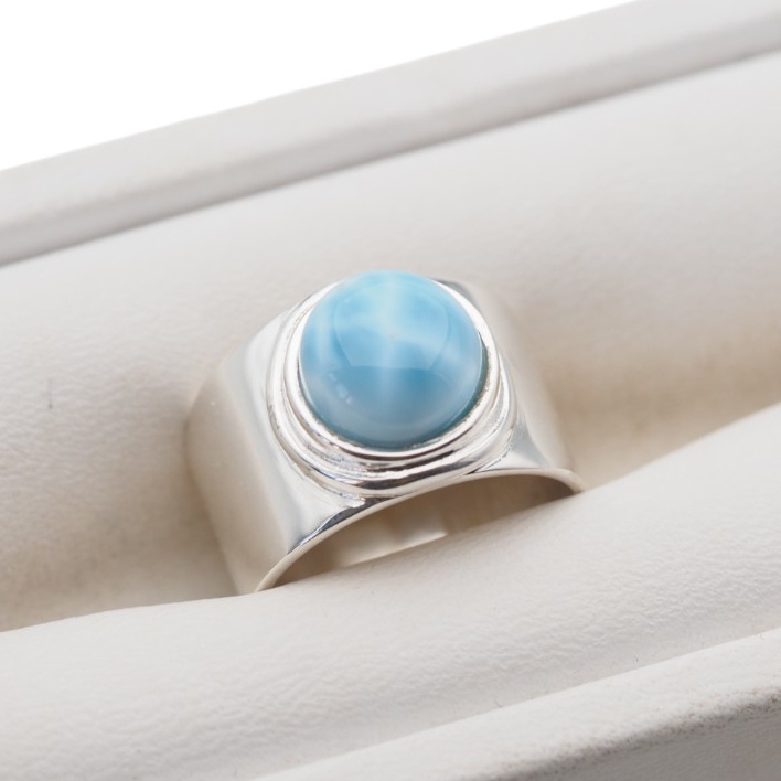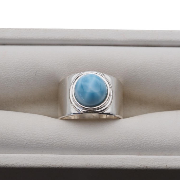 Ręcznie wykonany sygnet z Larimarem w minimalistycznej, prostej oprawie ze srebra próby 925. Okrągły kamień o średnicy 9 mm eksponowany jest centralnie, podkreślając naturalny rysunek i unikalny odcień niebieskiego. Biżuteria łączy w sobie męski charakter sygnetu i subtelną moc energetyczną Larimaru – idealny wybór dla osób ceniących spokój, siłę i symbolikę.