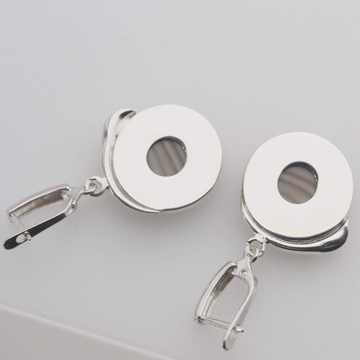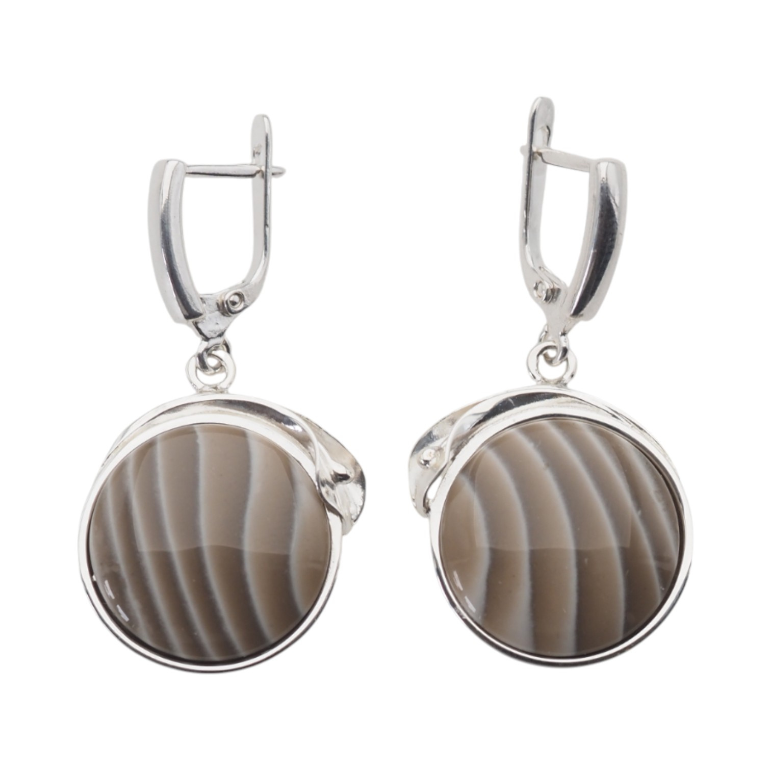 Eleganckie kolczyki z naturalnym krzemieniem pasiastym, wykonane ręcznie w srebrze próby 925. Kamienie w kształcie koła zostały osadzone w artystycznej oprawie z subtelnym motywem liści, która nadaje biżuterii wyjątkowego charakteru. Unikalny wzór pasm w odcieniach szarości, beżu i czerni sprawia, że każdy egzemplarz jest jedyny w swoim rodzaju.