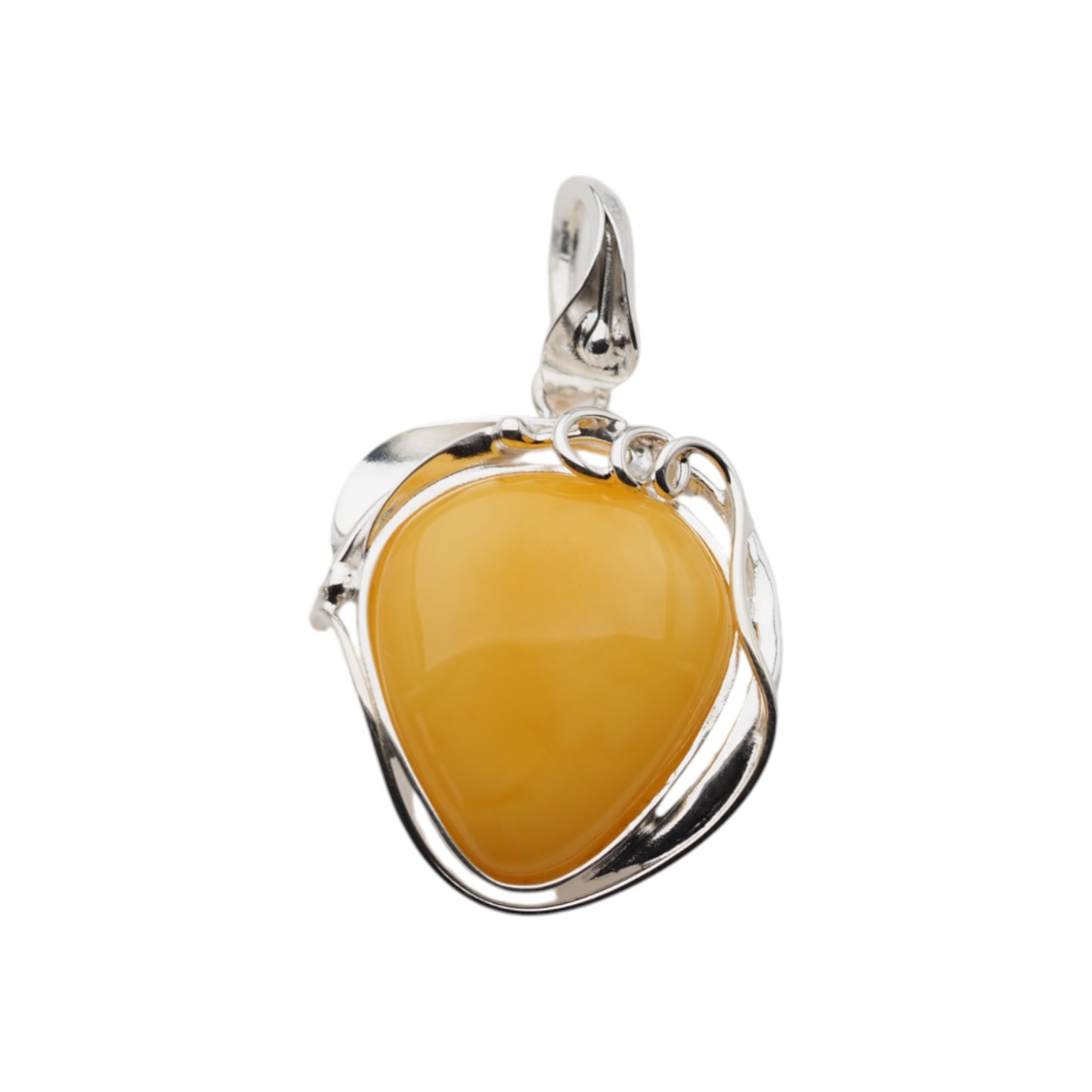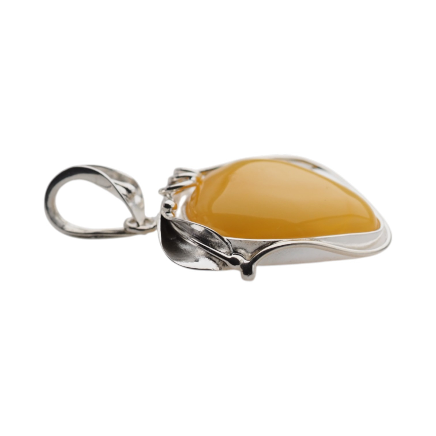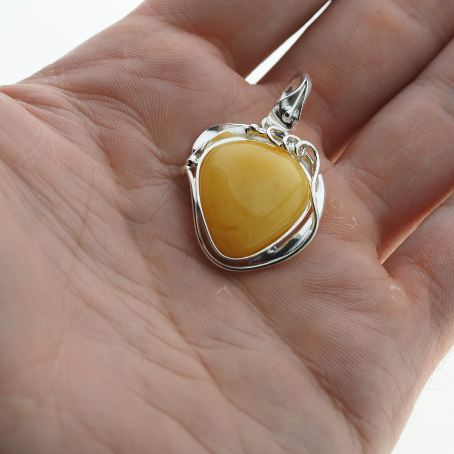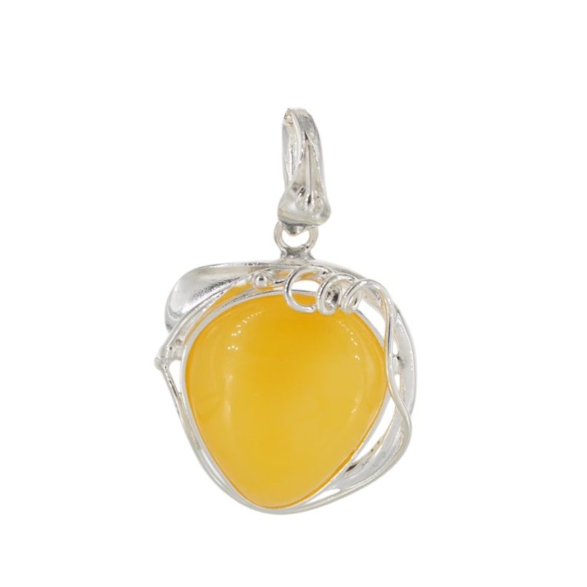Wyjątkowa zawieszka z naturalnym mlecznym bursztynem bałtyckim w kształcie łzy, ręcznie oprawiona w srebro próby 925. Kamień ma ciepły, miodowo-żółty kolor i gładko wypolerowaną powierzchnię o delikatnej przezierności. Bursztyn został osadzony w misternie wykonanej ramce przypominającej liść – z wygiętymi srebrnymi liniami oplatającymi kamień w sposób artystyczny i naturalny. Oprawa nie tylko chroni, ale też eksponuje kamień w pełni, dodając całości unikalnego, organicznego charakteru.