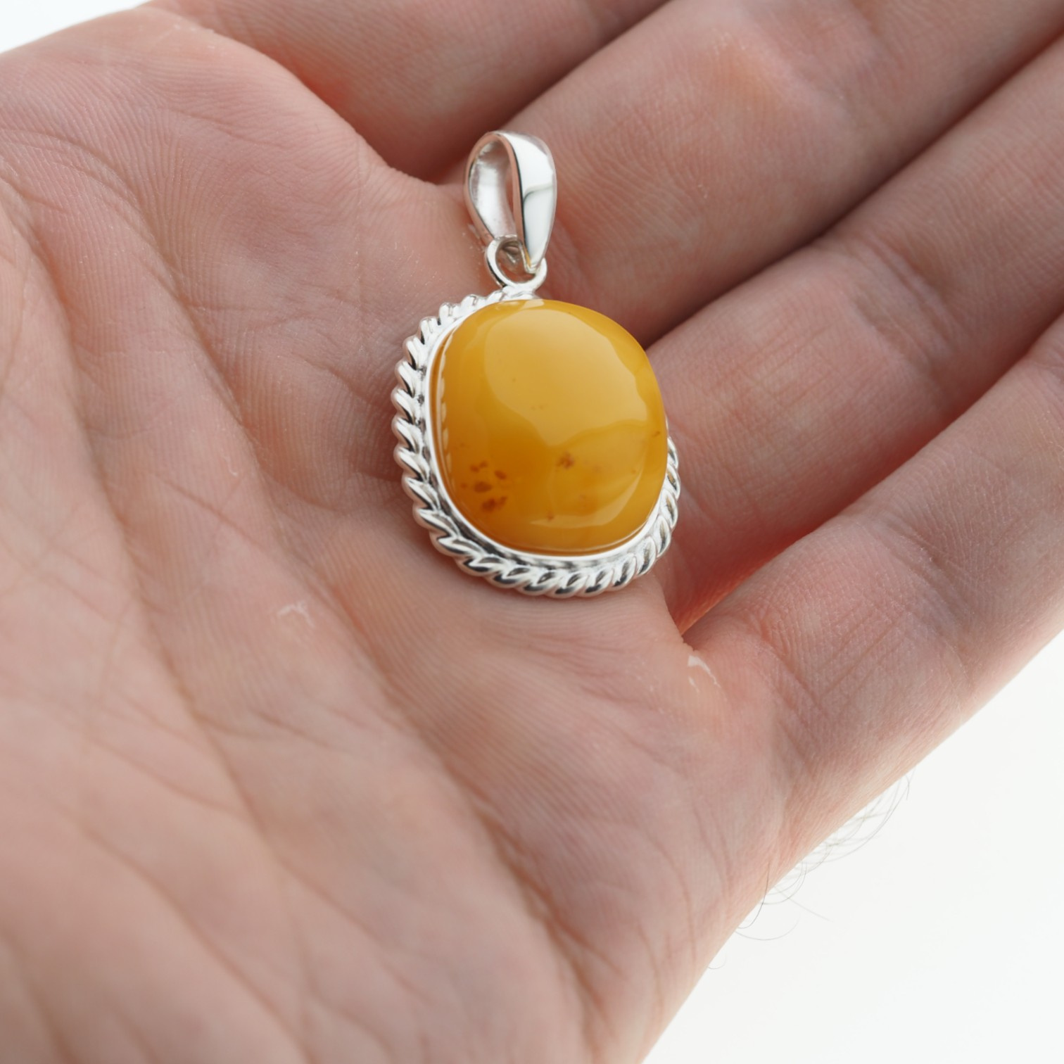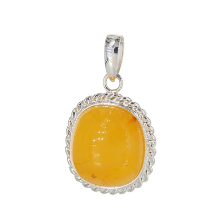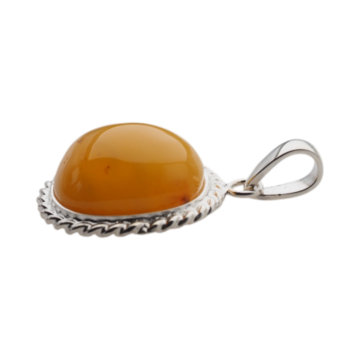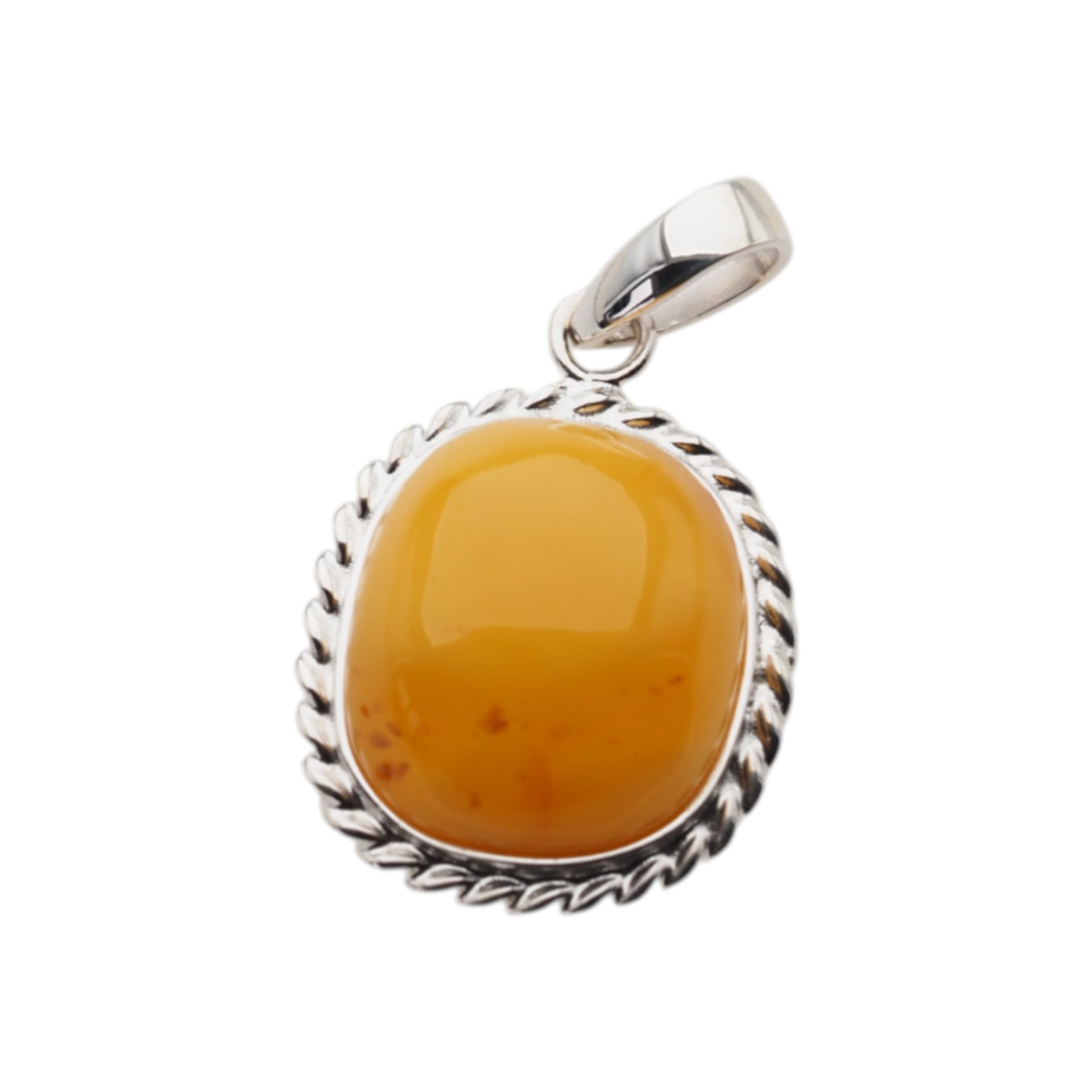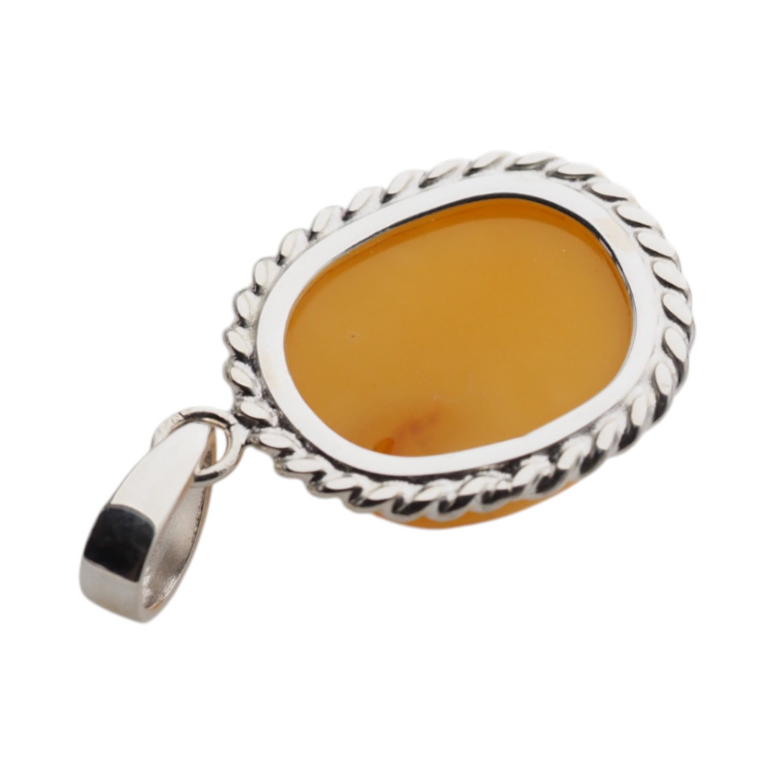 Ręcznie wykonana zawieszka z naturalnym mlecznym bursztynem bałtyckim, oprawionym w srebro próby 925. Kamień o intensywnej, ciepłej barwie miodowo-żółtej został oszlifowany w formie kaboszonu i osadzony w dekoracyjnej ramce z delikatnym, skręcanym rantem. Wysoki profil bursztynu (9 mm) sprawia, że zawieszka efektownie odbija światło i nabiera biżuteryjnej głębi. Całość tworzy klasyczną, ponadczasową kompozycję – idealną zarówno na co dzień, jak i do eleganckich stylizacji.