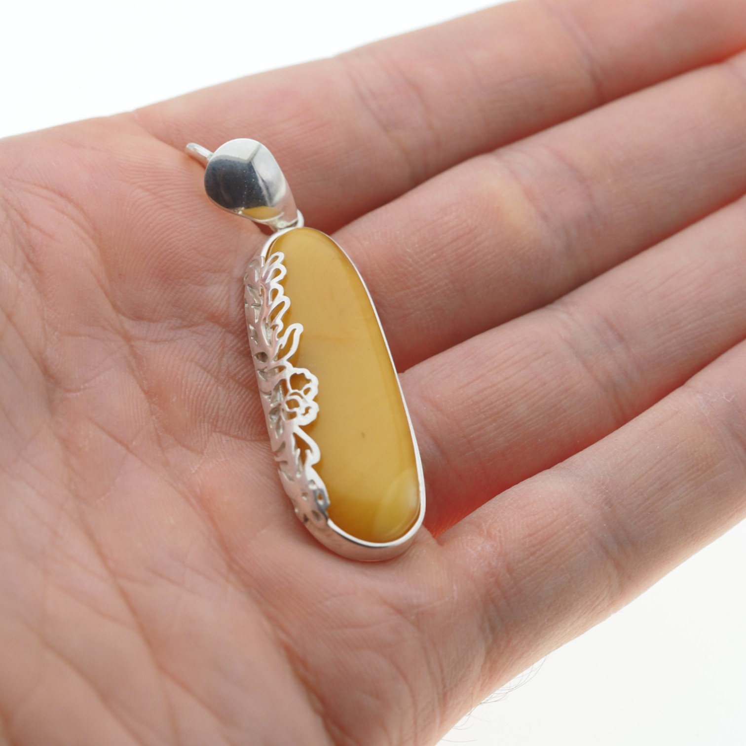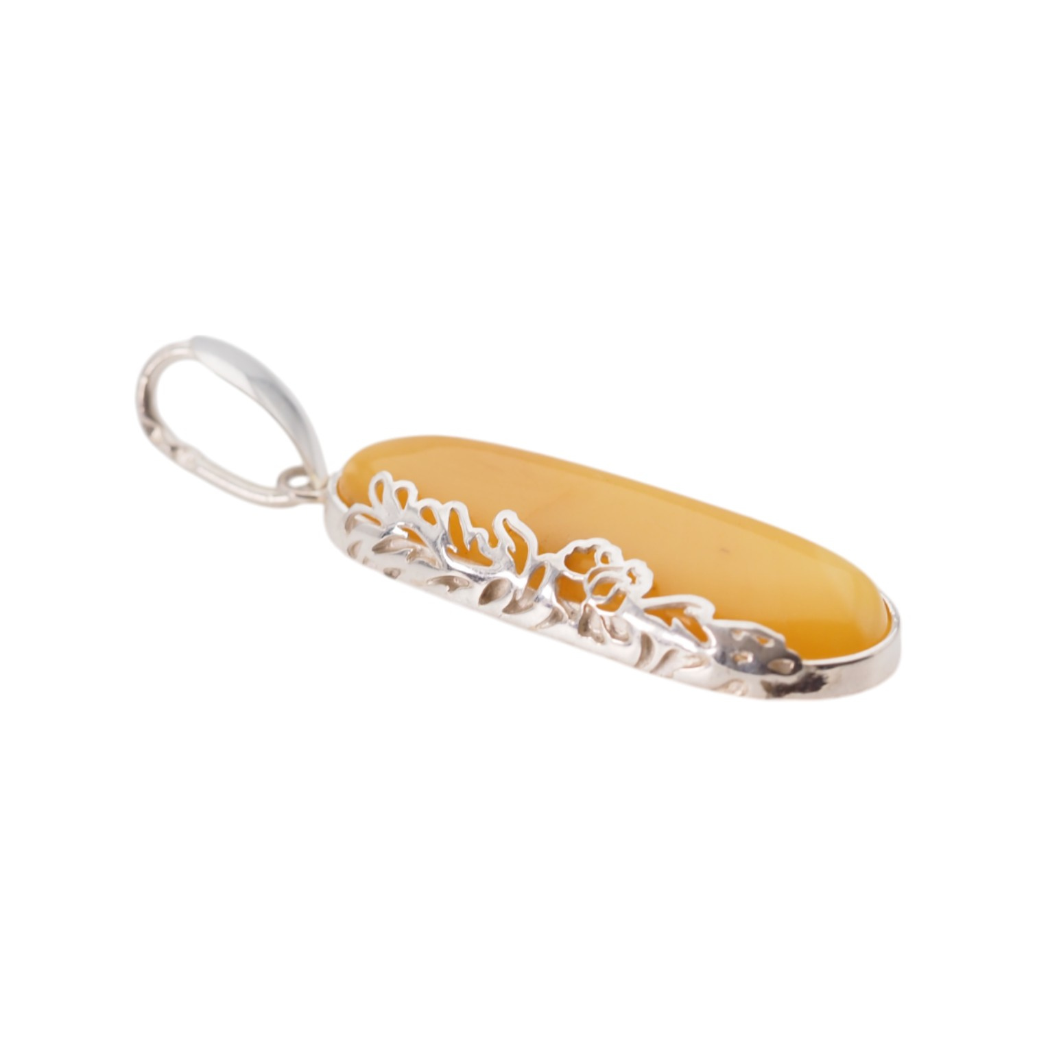 Elegancka zawieszka wykonana ręcznie z naturalnego mlecznego bursztynu bałtyckiego. Kamień o smukłym, podłużnym kształcie został oprawiony w srebro próby 925 z ozdobnym motywem kwiatowym. Delikatna forma i subtelny kolor bursztynu sprawiają, że jest to biżuteria z klasą – idealna na co dzień i od święta.