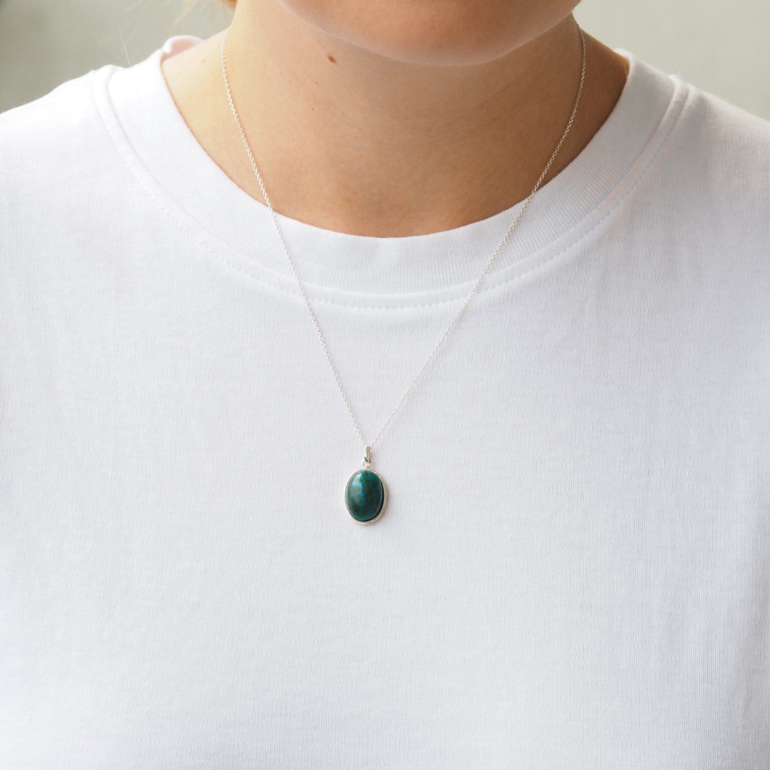 Ręcznie wykonana zawieszka z naturalną chryzokolą w owalnym kształcie. Kamień osadzony jest w minimalistycznej oprawie ze srebra próby 925, która pozwala w pełni wyeksponować jego intensywną, niebiesko-zieloną barwę i organiczną strukturę. Lekka, elegancka forma sprawia, że zawieszka świetnie sprawdzi się zarówno na co dzień, jak i do bardziej wyrafinowanych stylizacji.