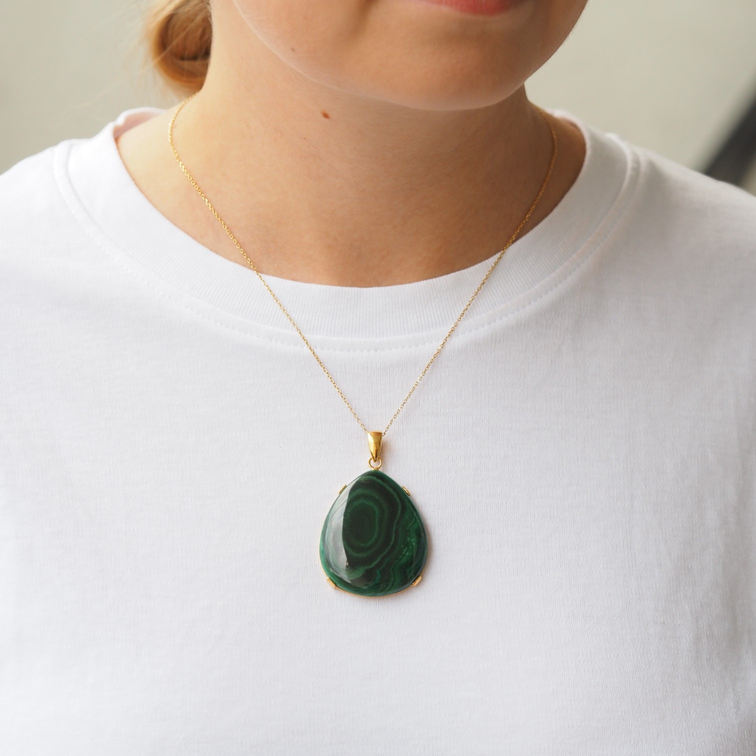 Duża, ręcznie wykonana zawieszka z naturalnym malachitem w intensywnie zielonym kolorze i wyrazistym rysunkiem pasm. Kamień osadzony został w prostej, pozłacanej oprawie ze srebra próby 925, pokrytej dodatkowo polimerem, który chroni złocenie przed ścieraniem i utlenianiem.