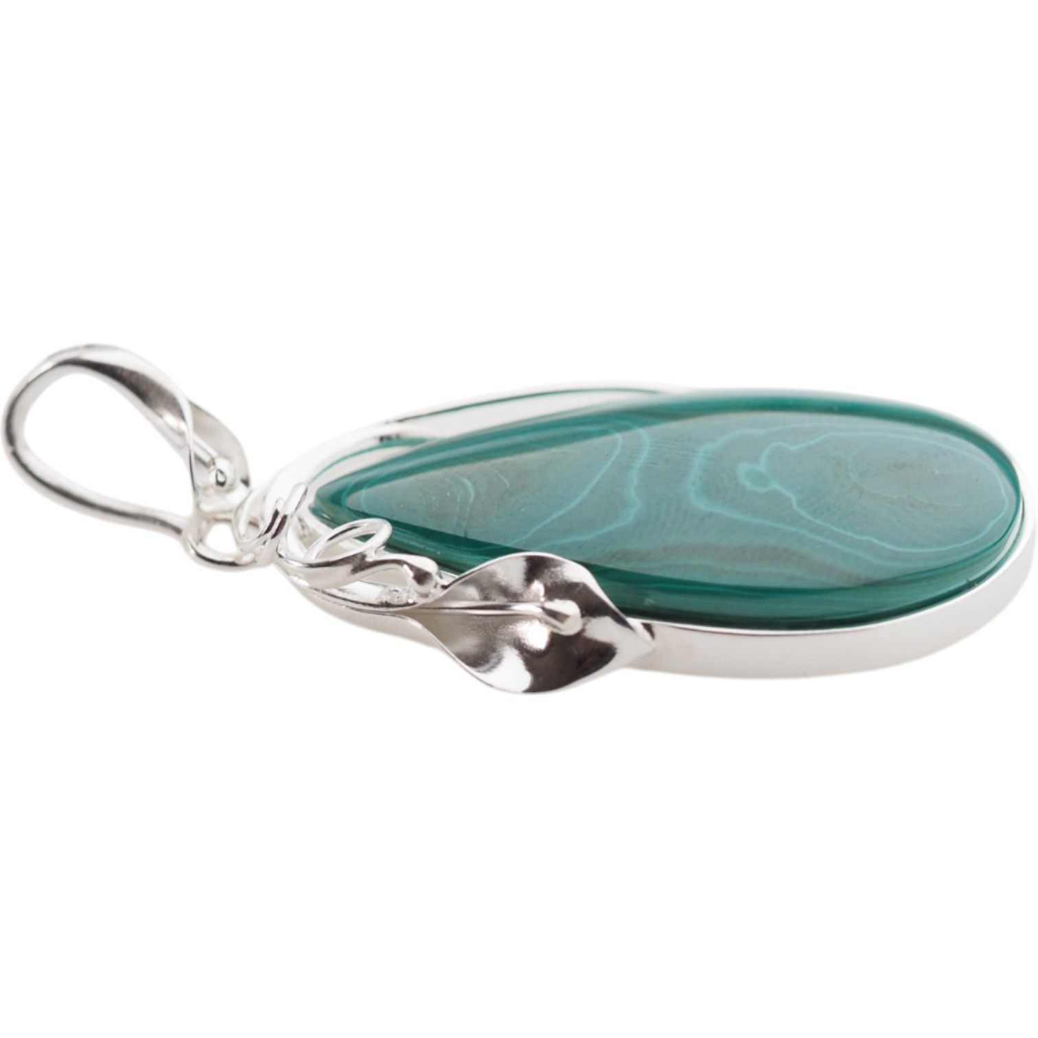 Srebrna zawieszka z naturalnym malachitem – ręczne wykonanie, artystyczna oprawa z motywem liści