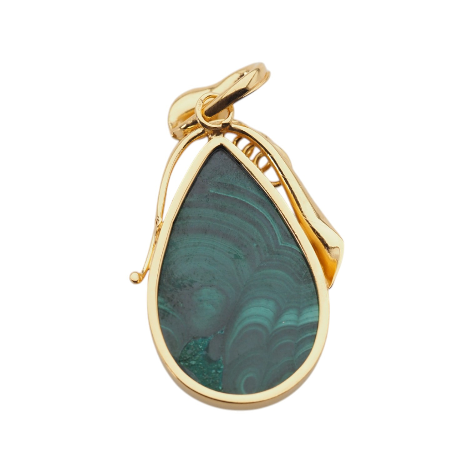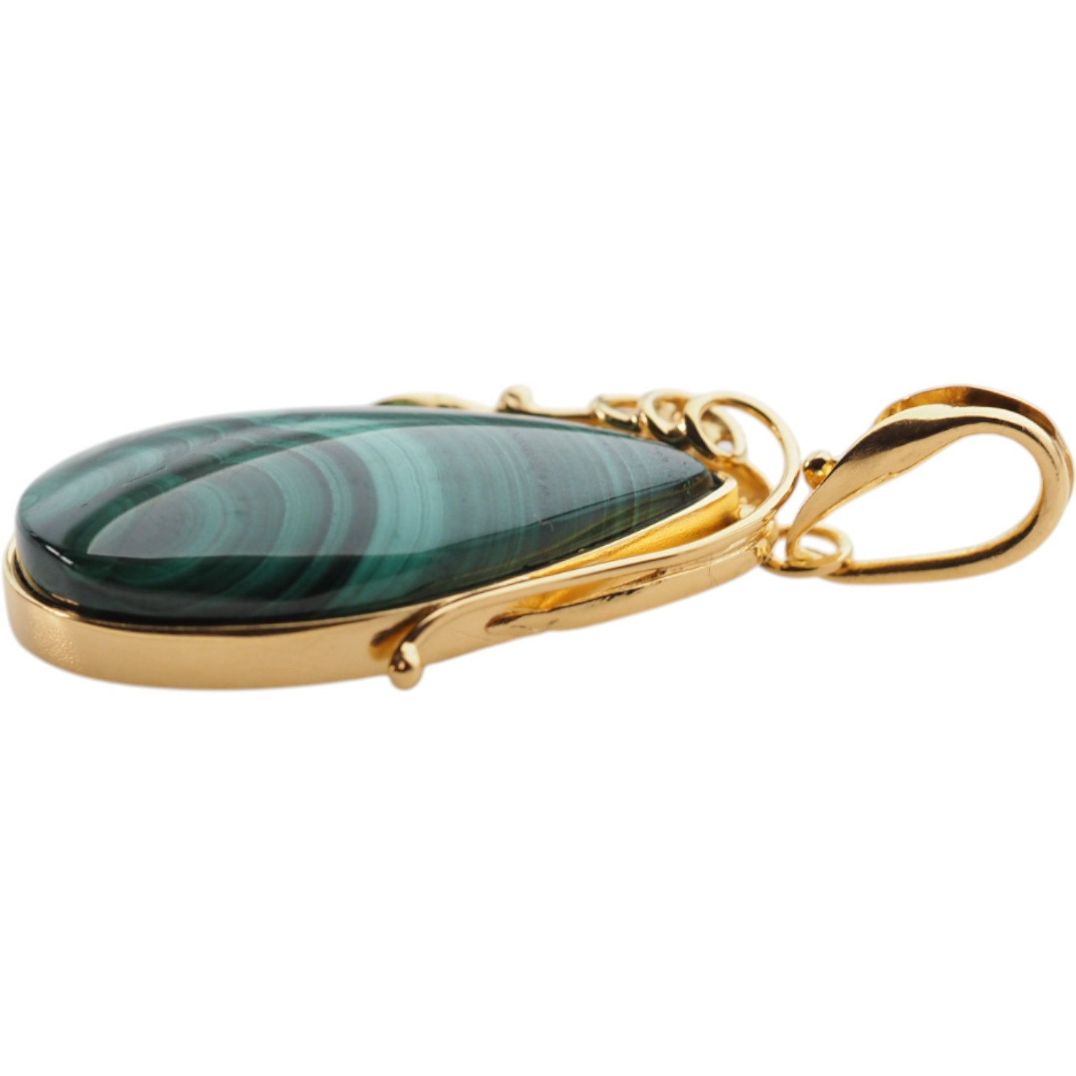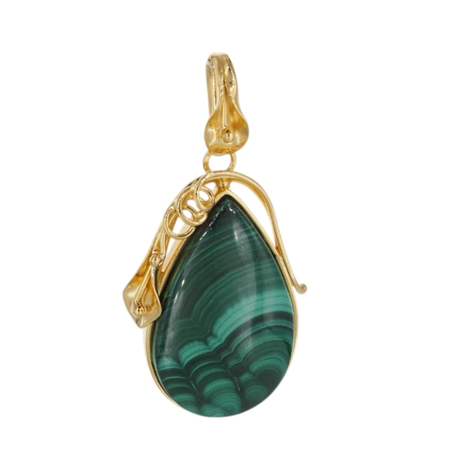 Ta unikatowa zawieszka została wykonana ręcznie z naturalnego malachitu i srebra próby 925, pokrytego warstwą 24-karatowego złota metodą złocenia mikronowego. Głęboka zieleń kamienia z wyraźnymi, falistymi pasmami w różnych odcieniach zachwyca swoim naturalnym pięknem i czyni każdą zawieszkę jedyną w swoim rodzaju.