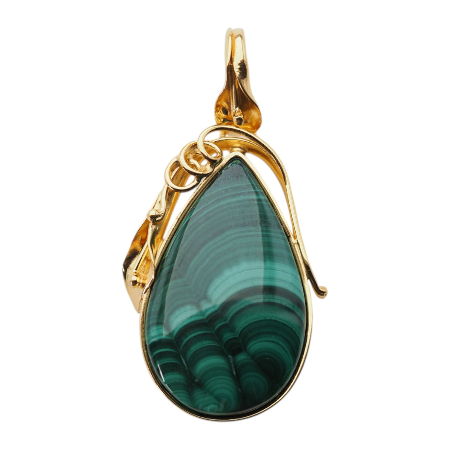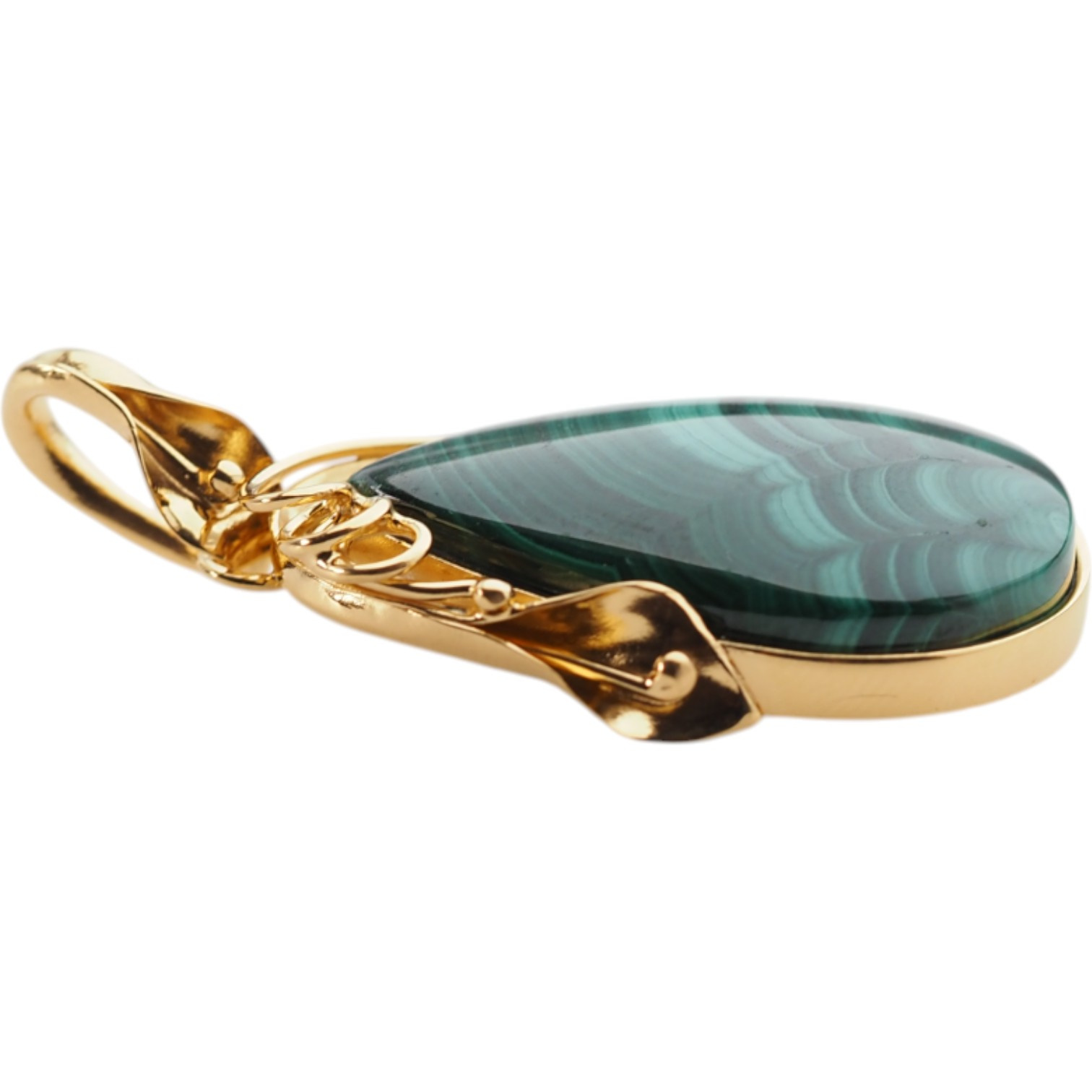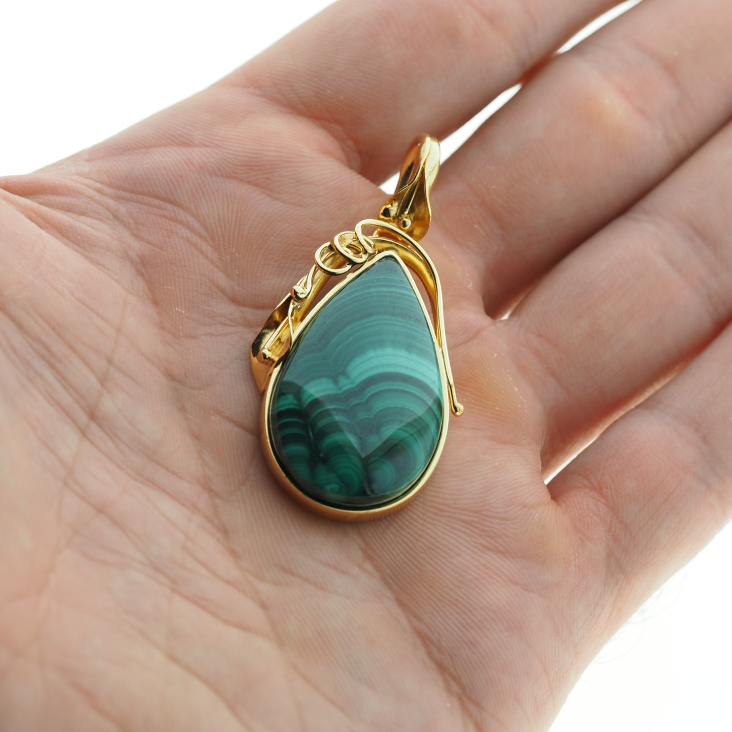 Złocona srebrna zawieszka z malachitem – ręczne wykonanie, artystyczna oprawa z motywem liści