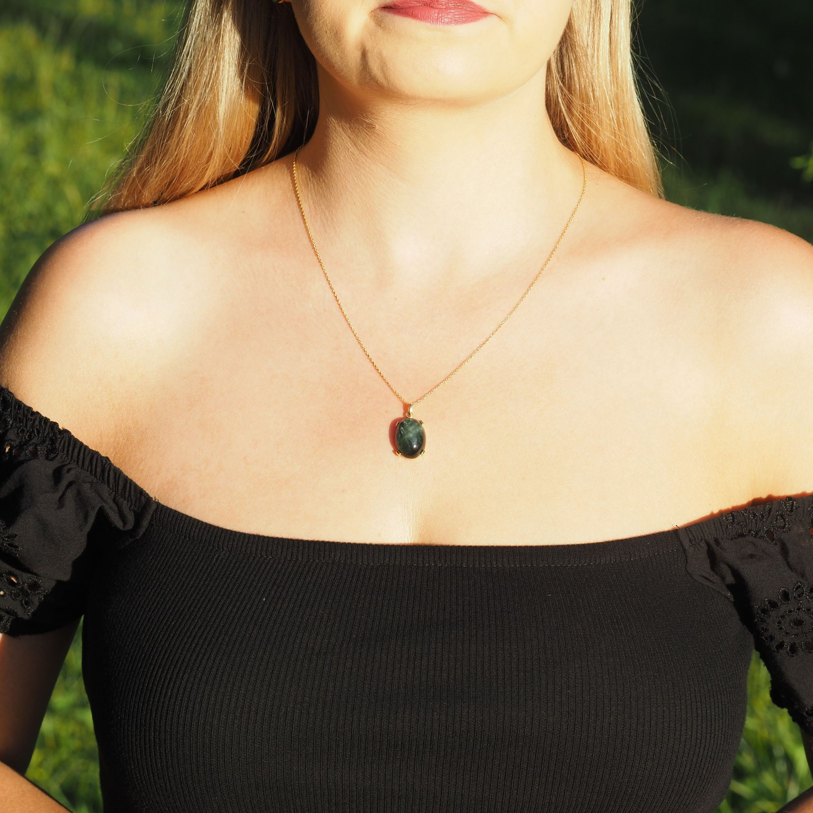 - Srebrna, złocona zawieszka z Serafinitem (Klinochlorem) została zrobiona ręcznie. Wisiorek dobrze eksponuje kamień naturalny w kształcie owalnym