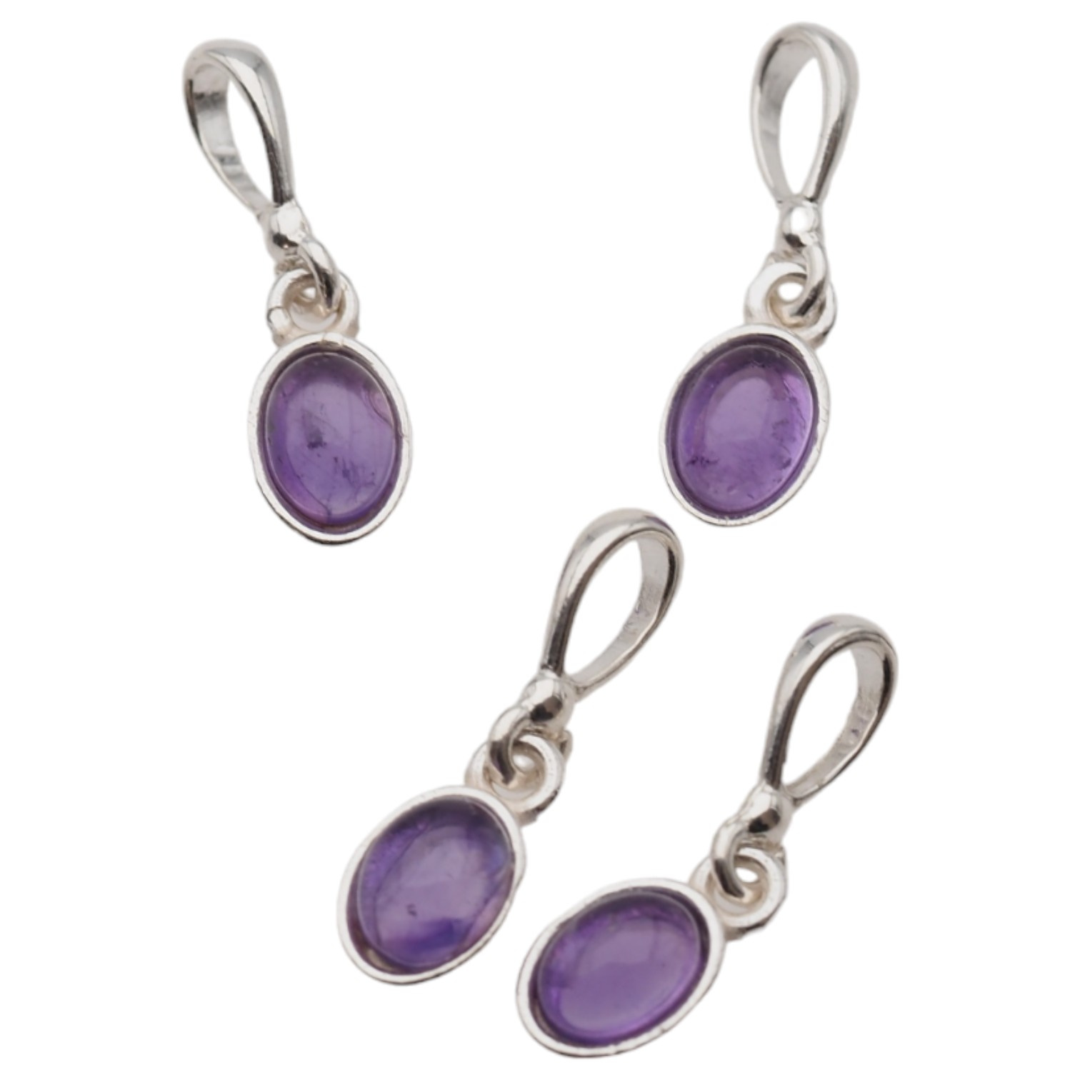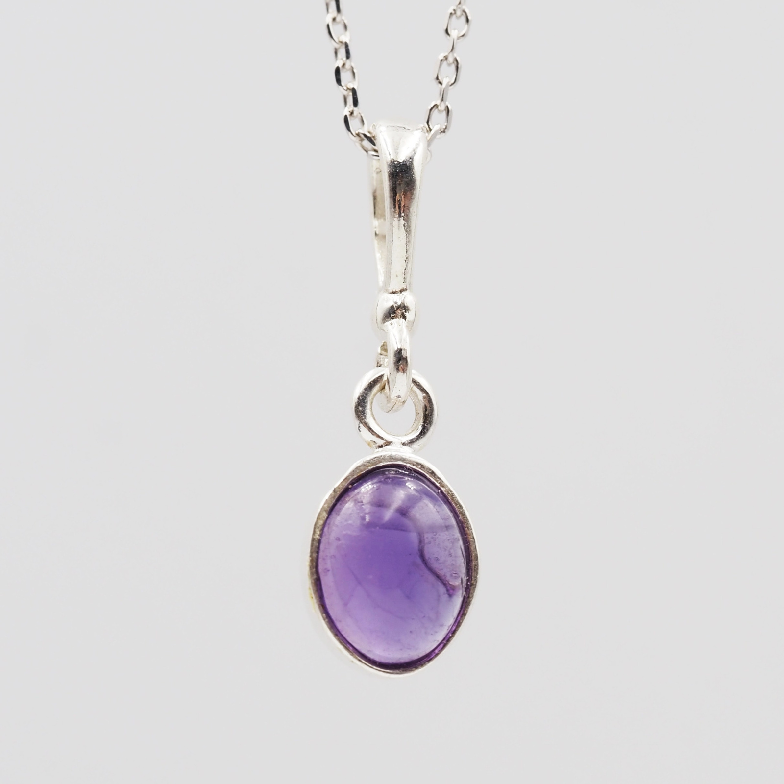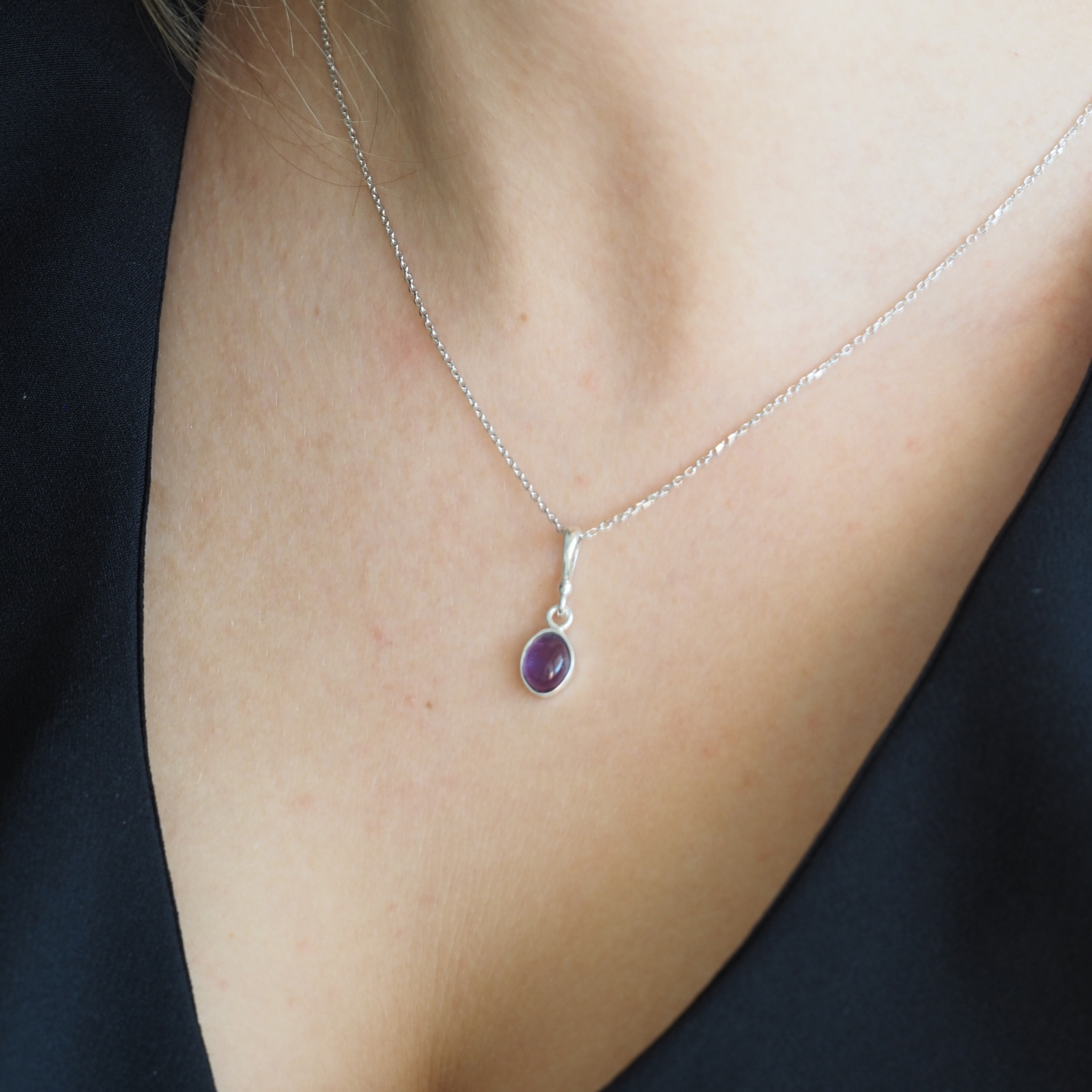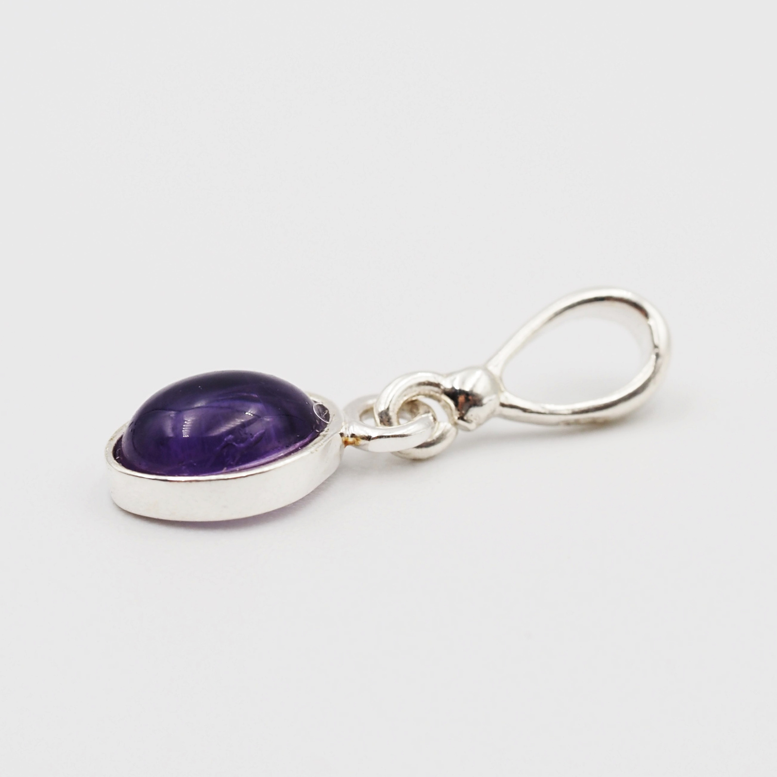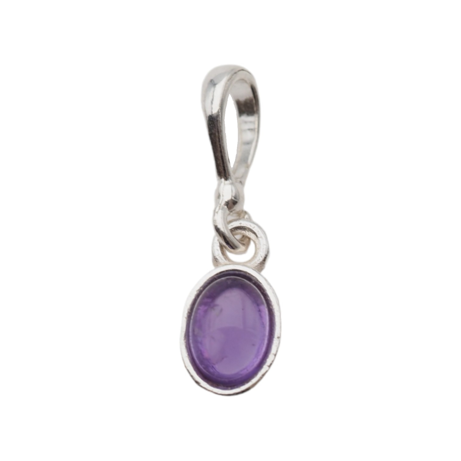 - Srebrna zawieszka z drobnym ametystem wykonana ręcznie. Naturalny, owalny, fioletowy kamień półszlachetny w prostej oprawie.