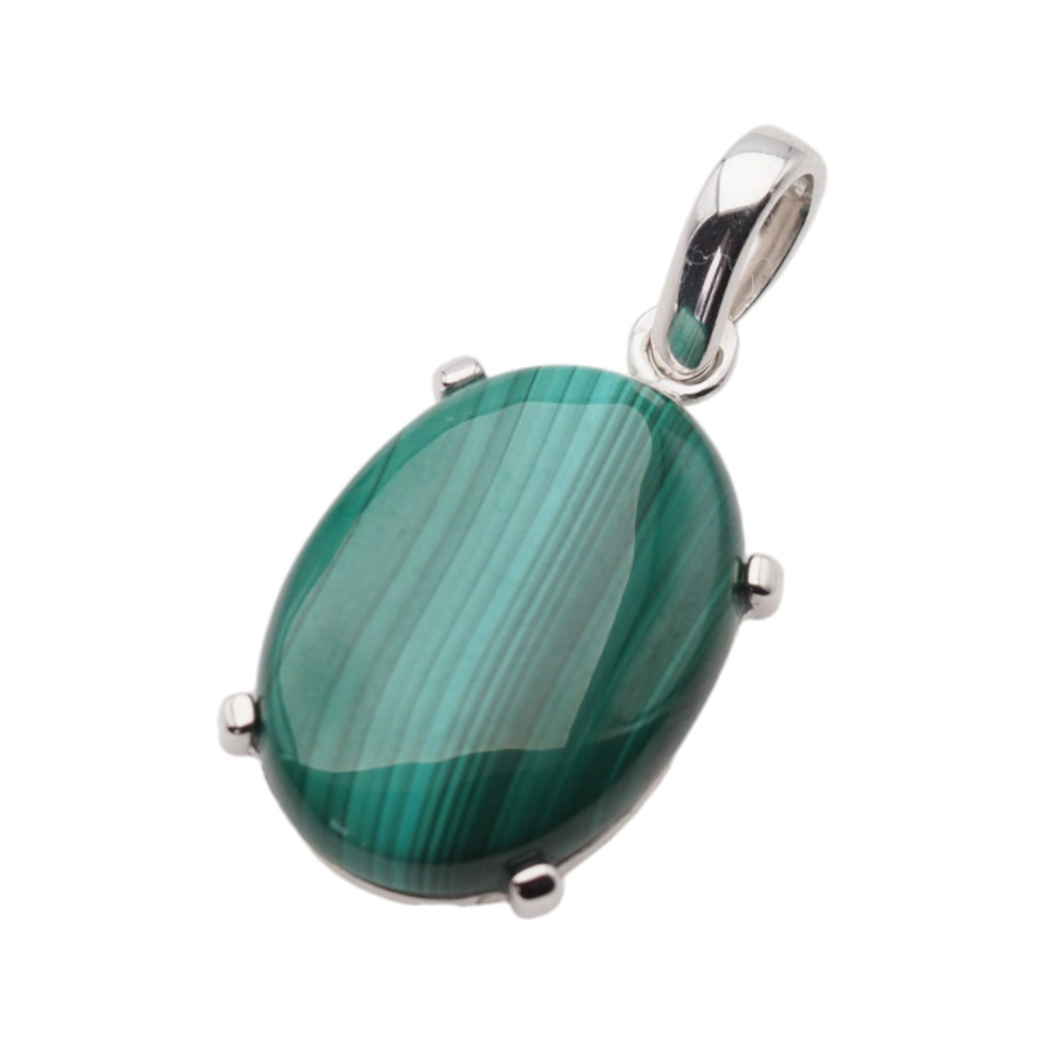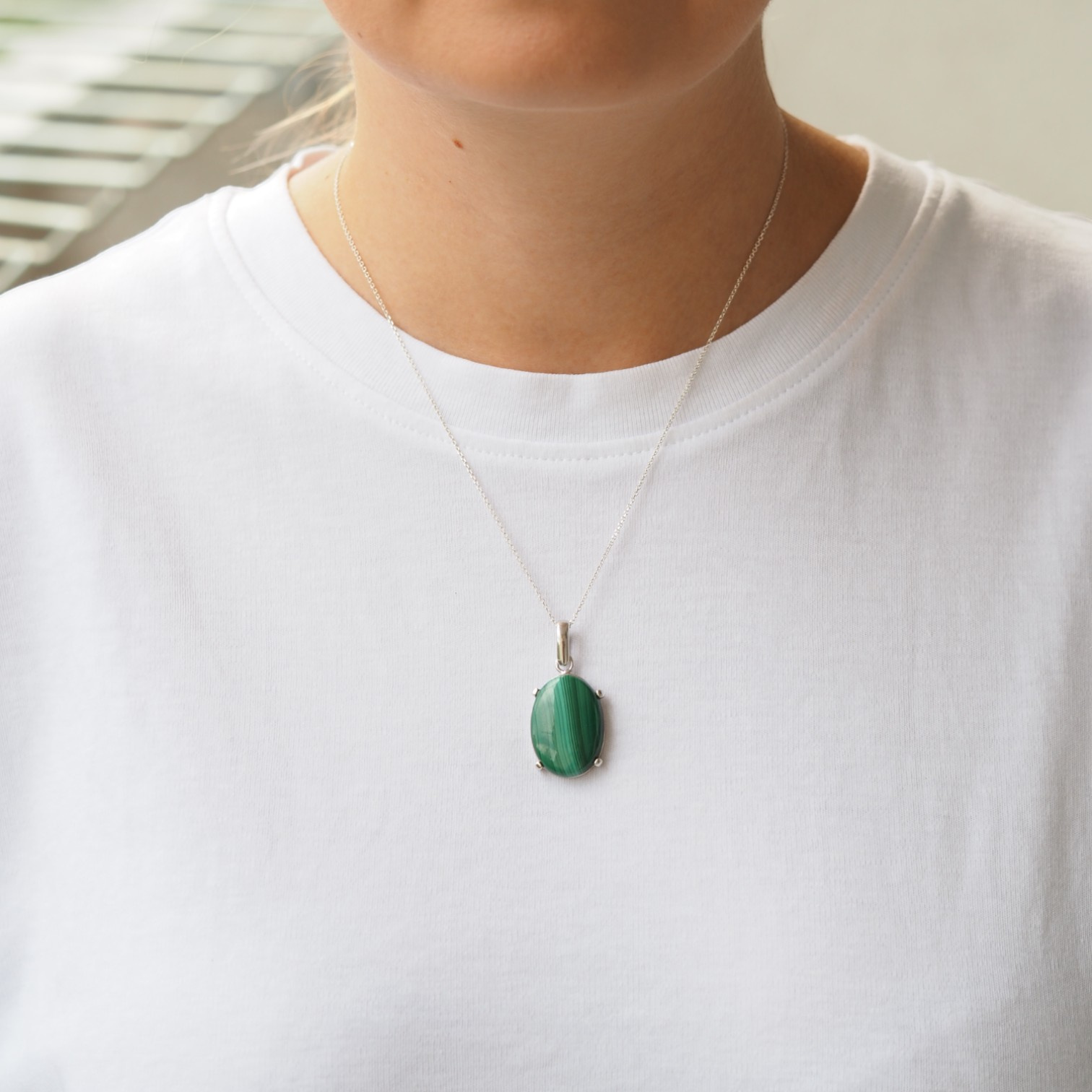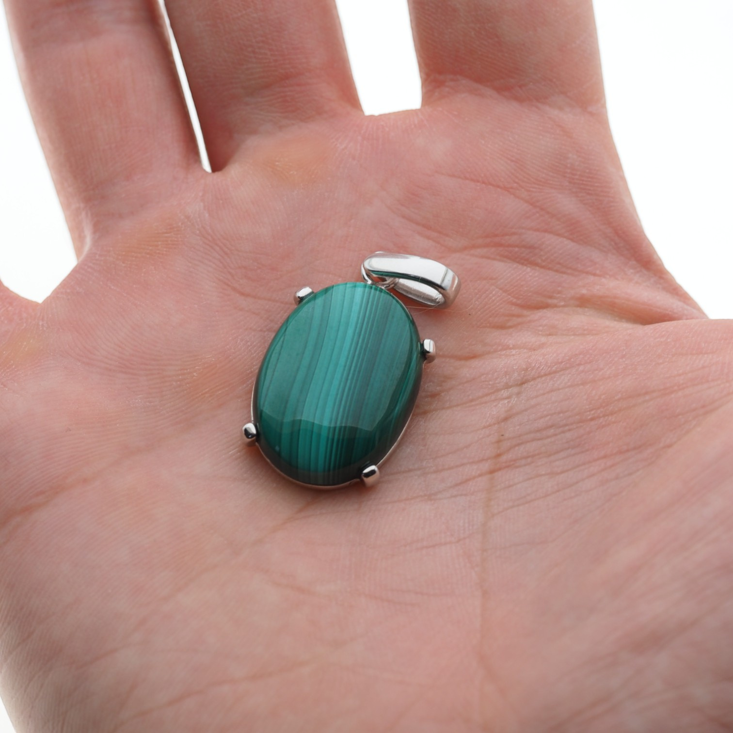 Elegancka zawieszka z naturalnym malachitem, wykonana ręcznie w pracowni jubilerskiej. Kamień o wyrazistym, zielonym kolorze z charakterystycznymi pasmami osadzony został w prostej oprawie ze srebra rodowanego próby 925. Rodowanie nadaje srebru trwałość i zabezpiecza je przed ciemnieniem, a klasyczna forma pozwala w pełni wyeksponować piękno kamienia.