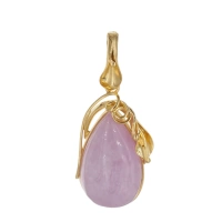 Zawieszka - Kunzyt łza w srebrze złoconym z liśćmi